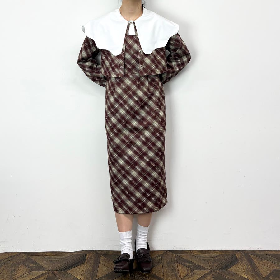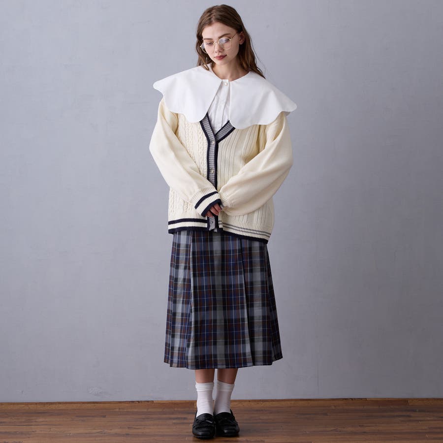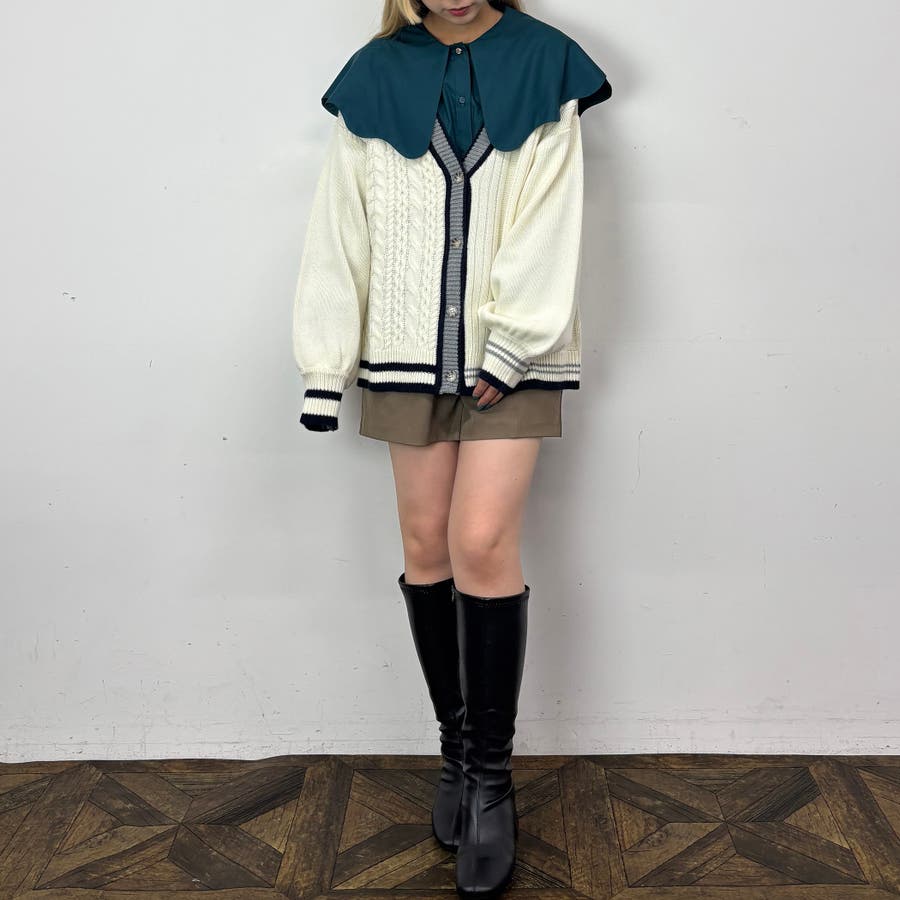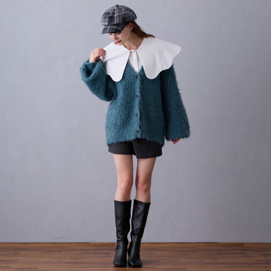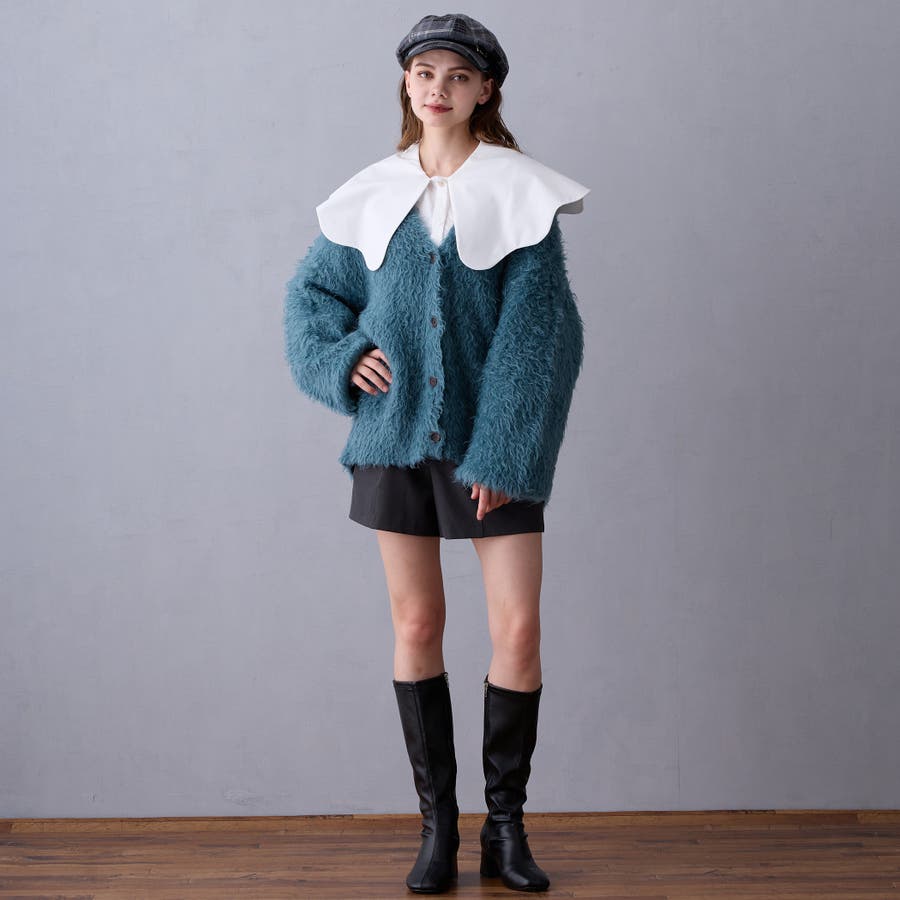 肩巾より大きな衿が顔回りを華やかに見せ、コーディネートのポイントに。