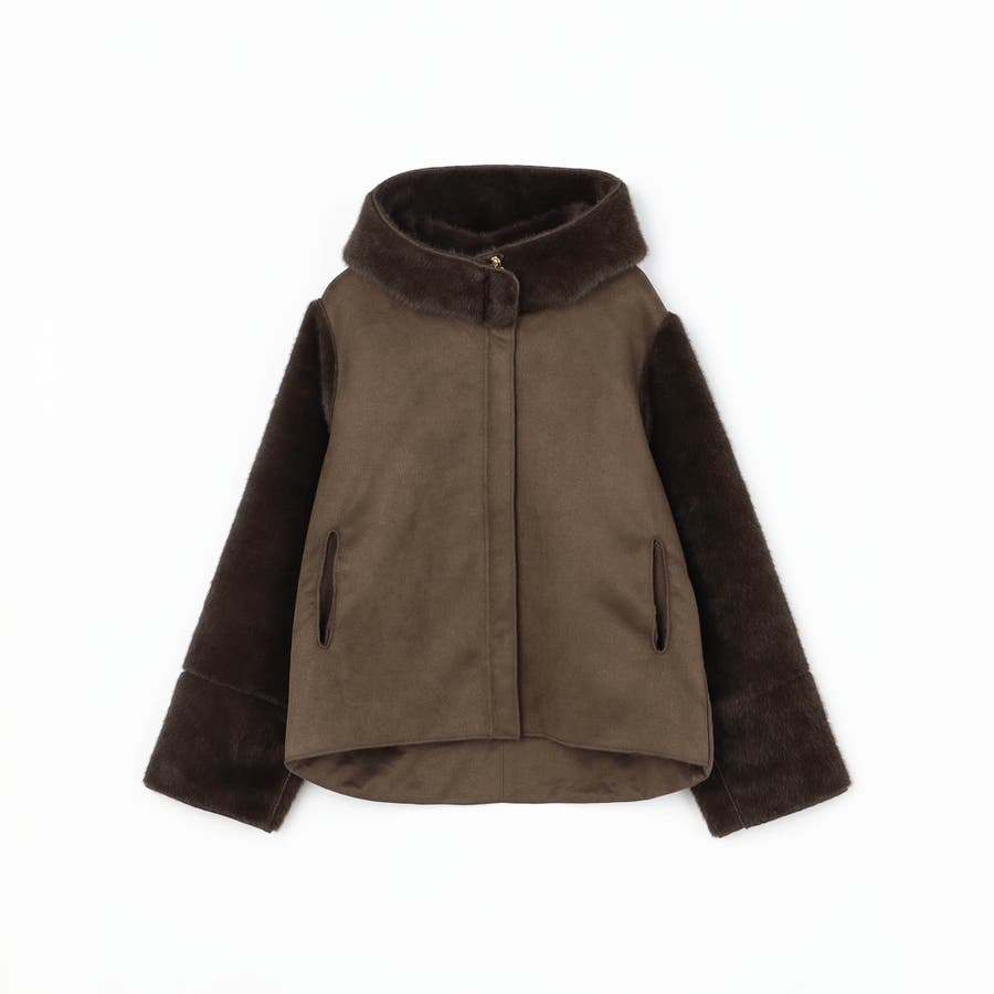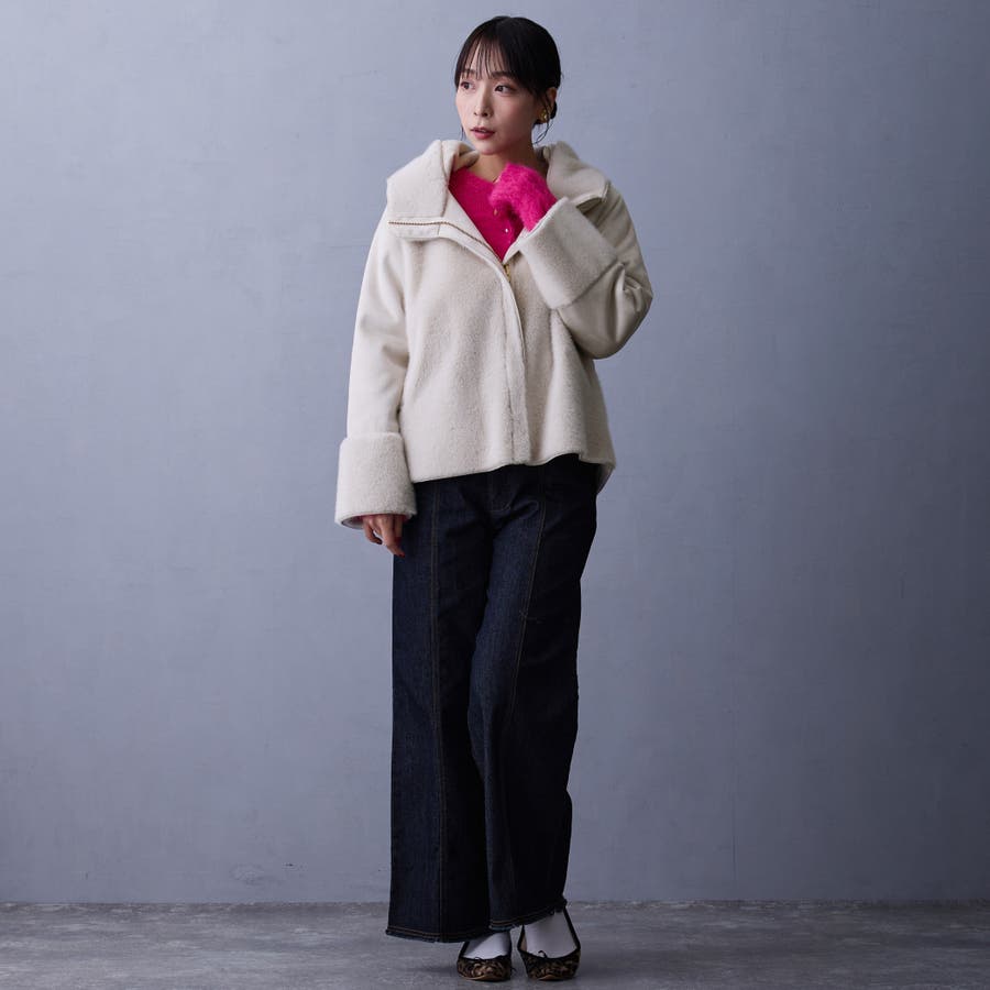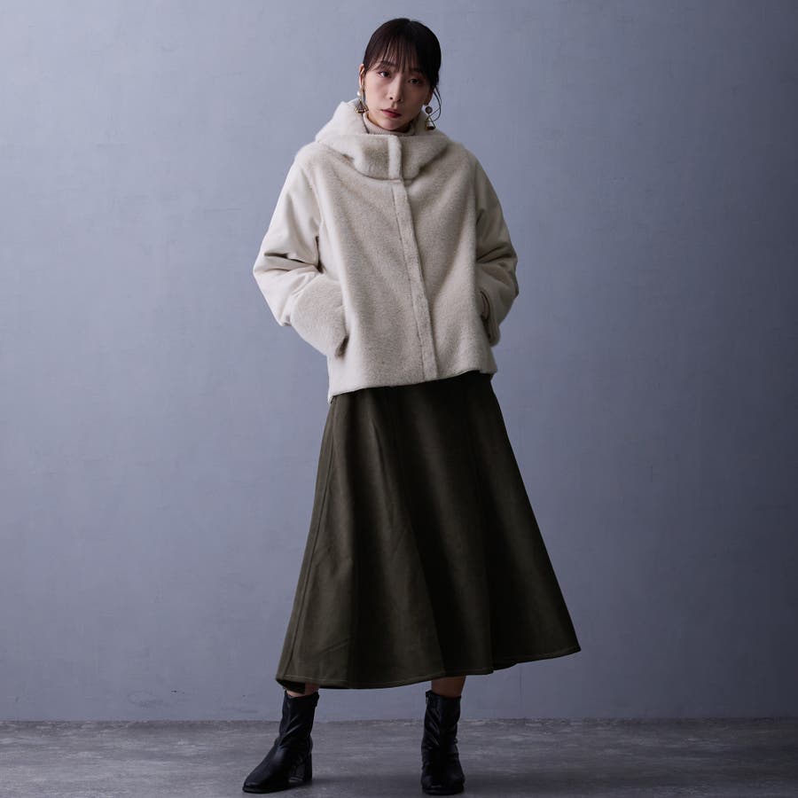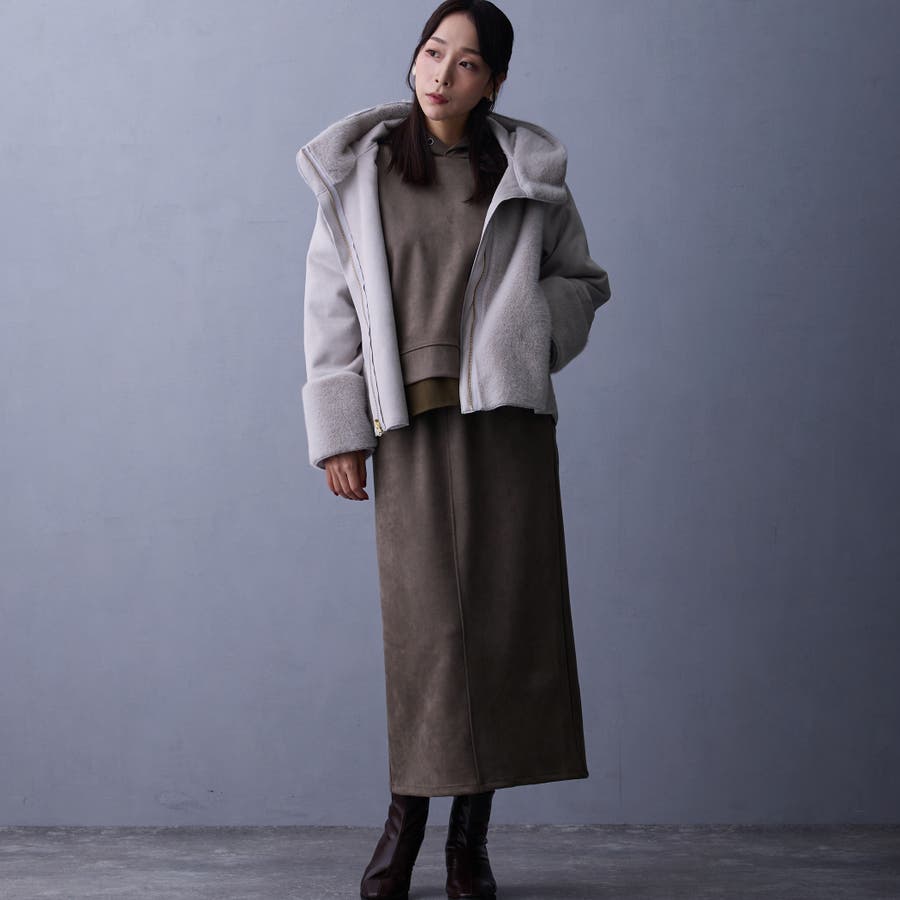 フードライクな襟元は、ZIPを少し開けて衿風にしても◎