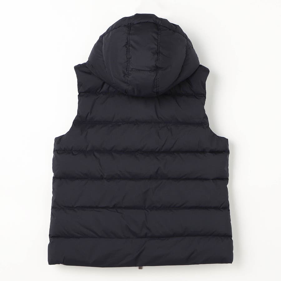 着脱可能なフードが付いたコンパクトなダウンベストです。