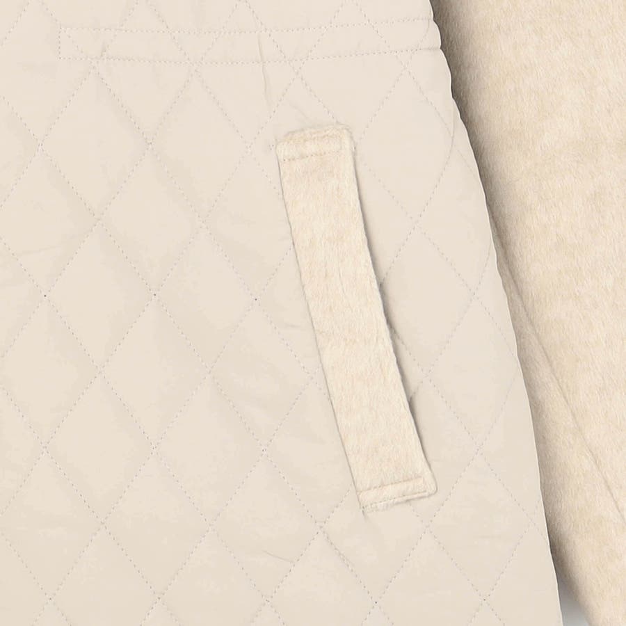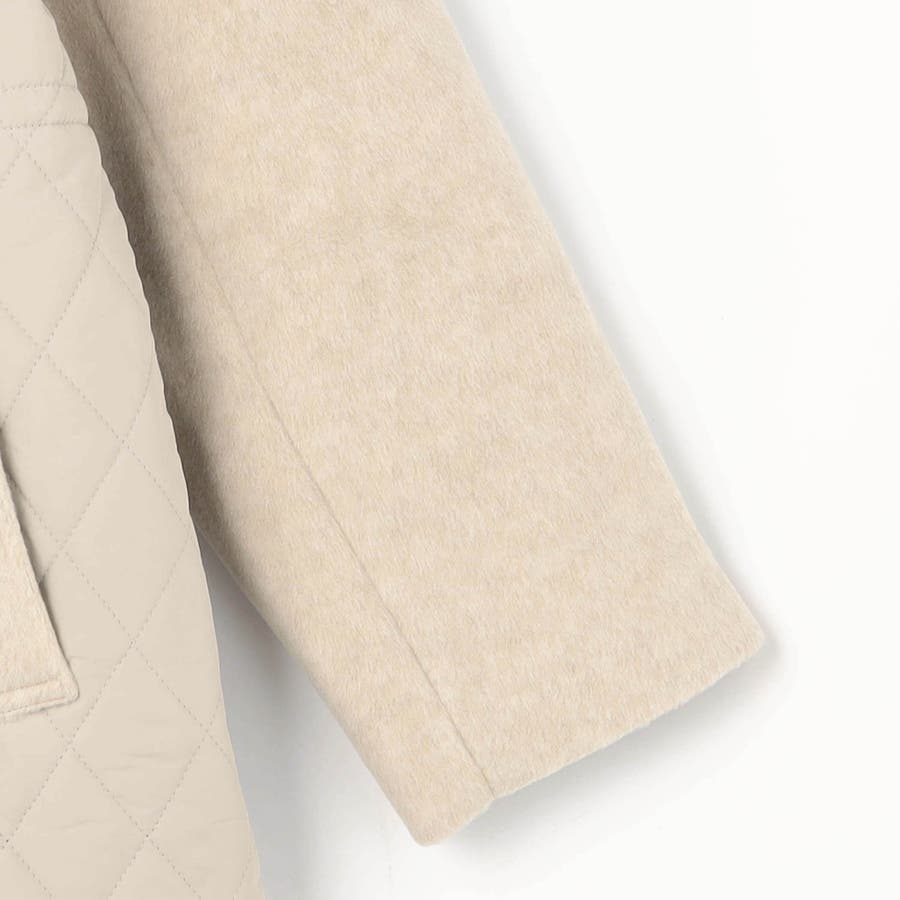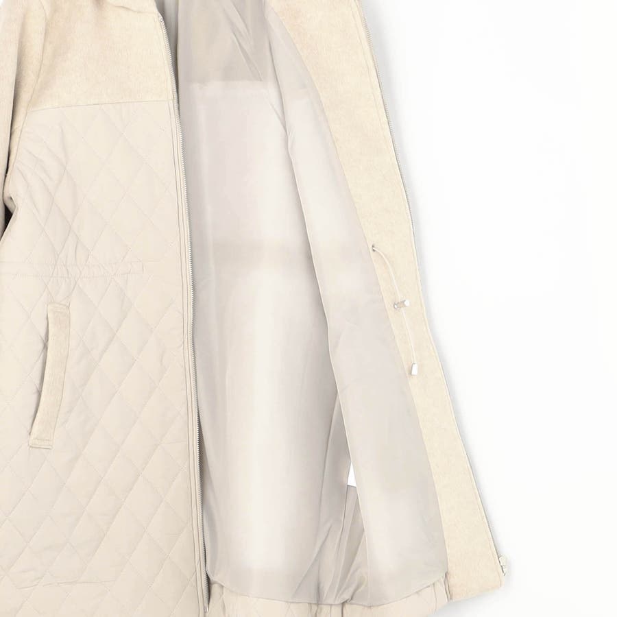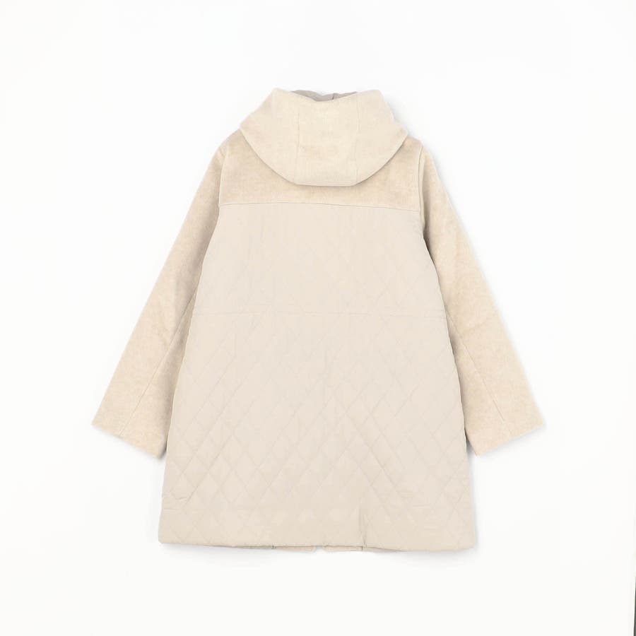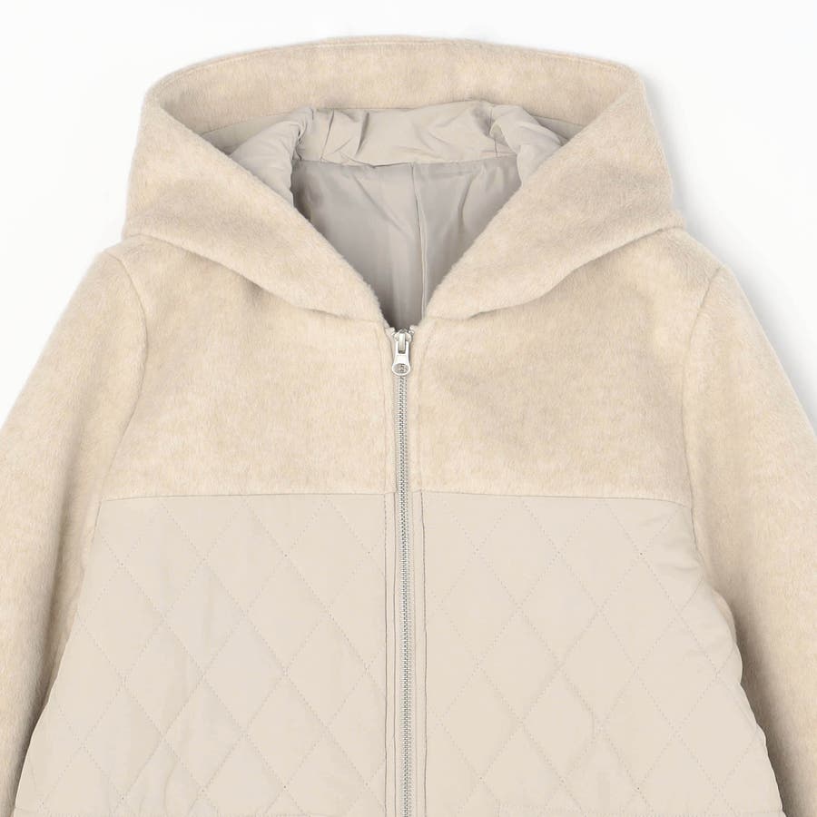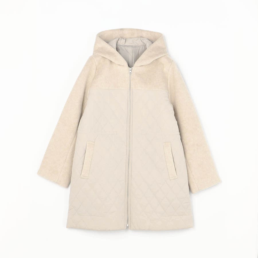 ふっくらとした柔らかい風合いが特徴のモッサ風の素材とカジュアルなキルト素材を切替えた、ZIPフードコートです。