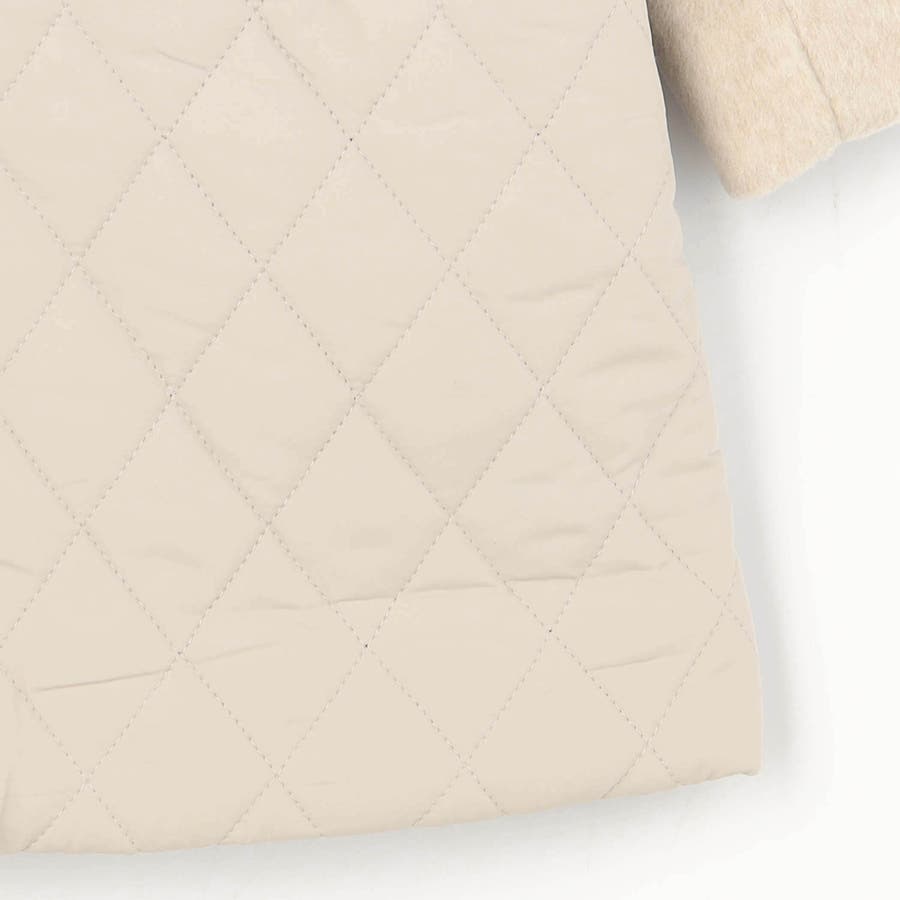 | 素材 | 表地キルト部分:ポリエステル100% 中わた:ポリエステル100% 表地別布:ポリエステル80% アクリル10% レーヨン10% 裏地:ポリエステル100% |