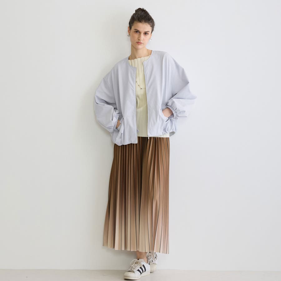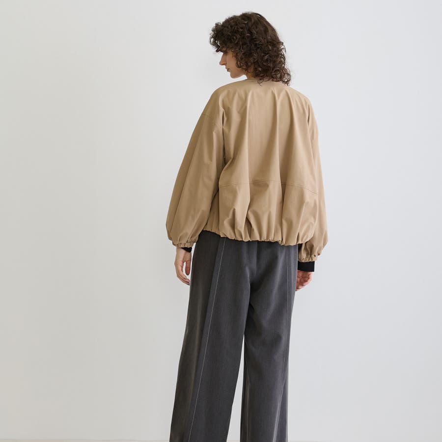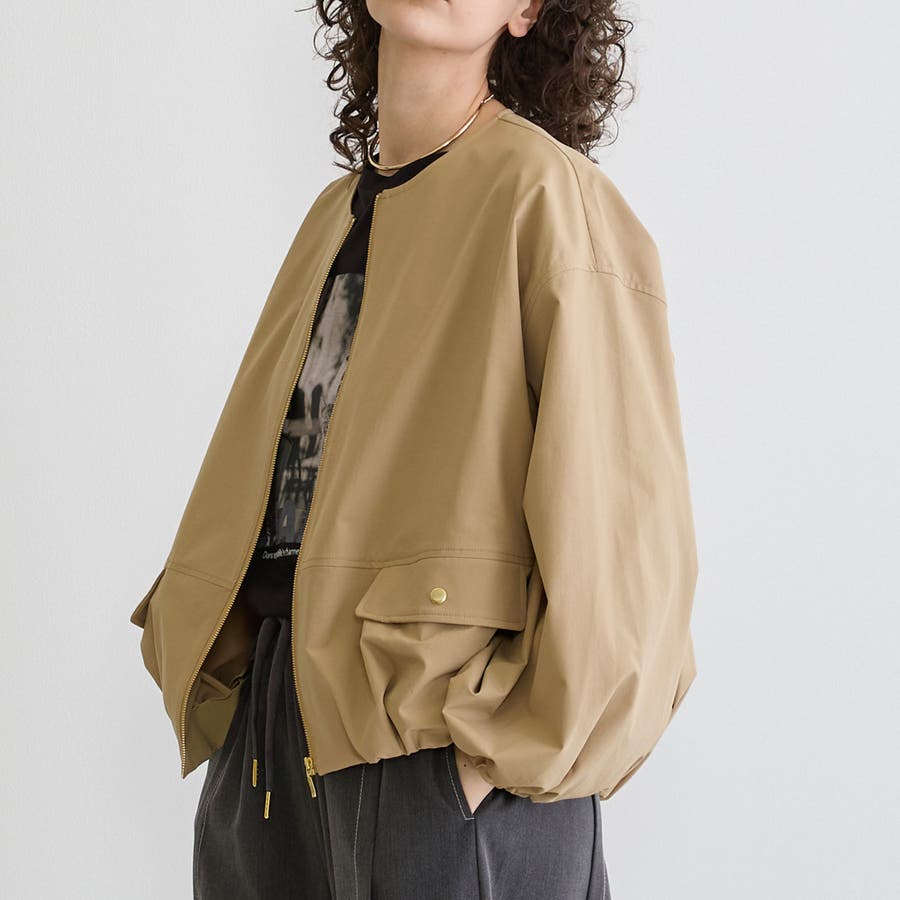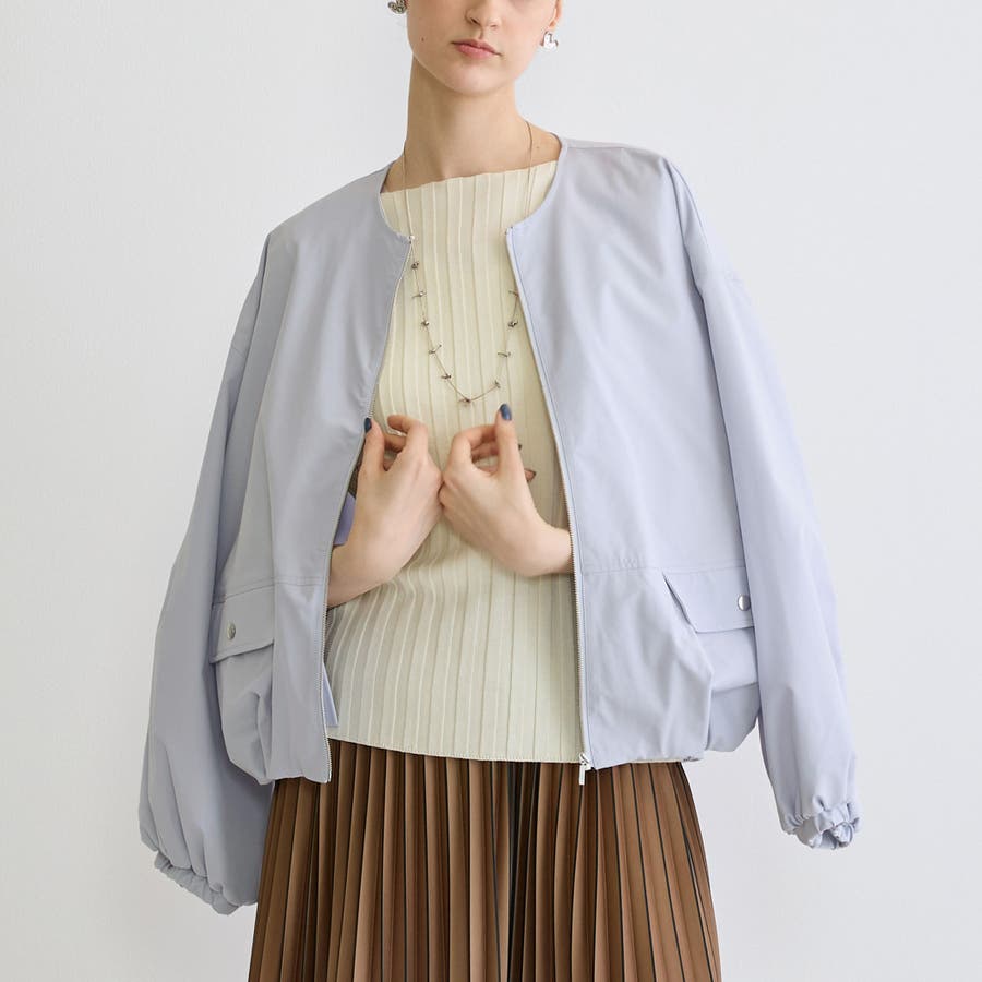 ノーカラーが首回りをスッキリさせてくせるジップブルゾンは軽量で着心地も◎