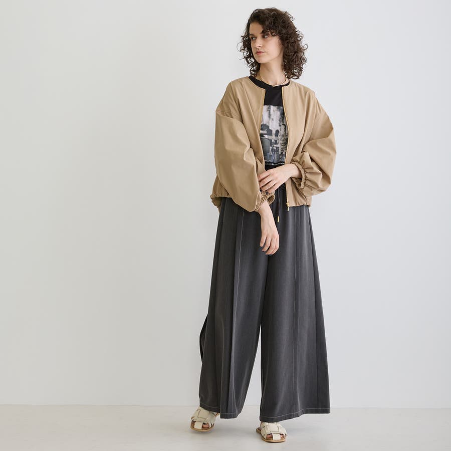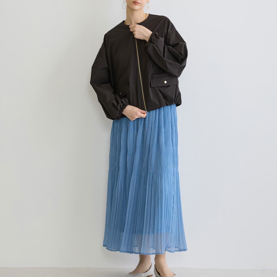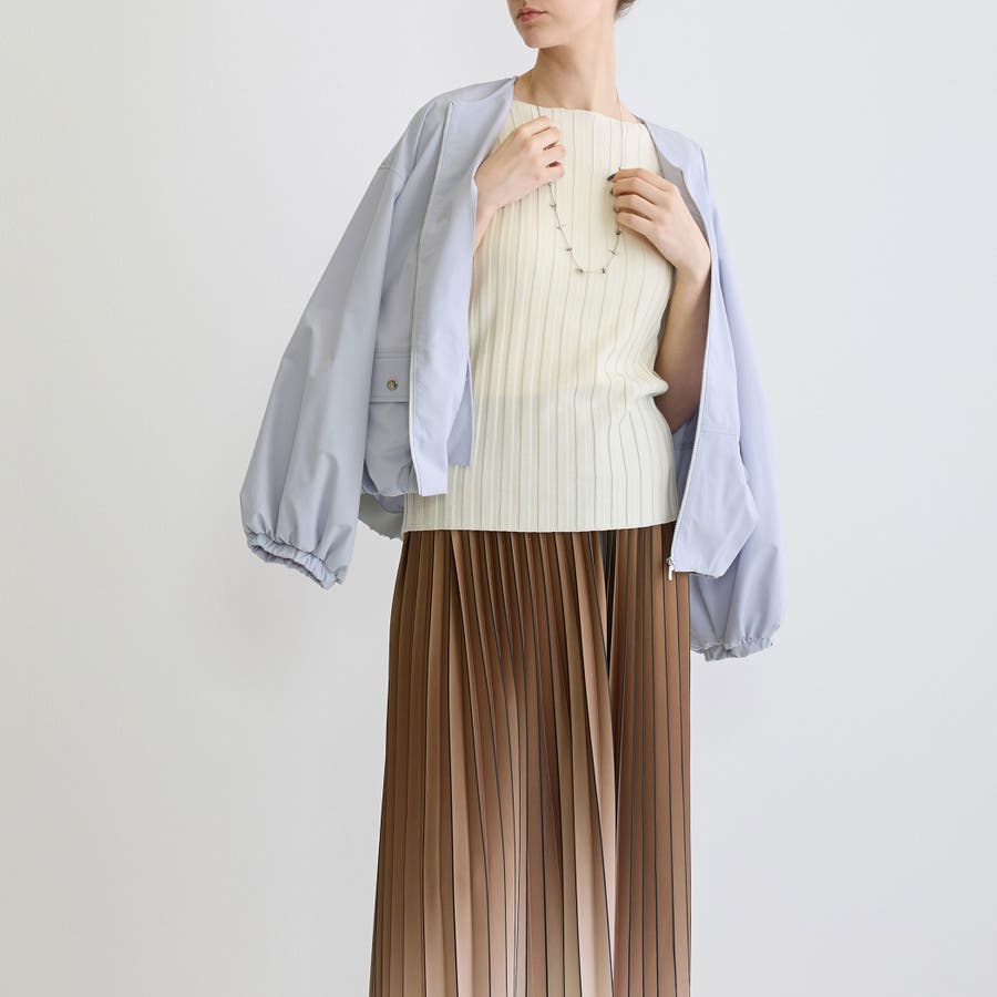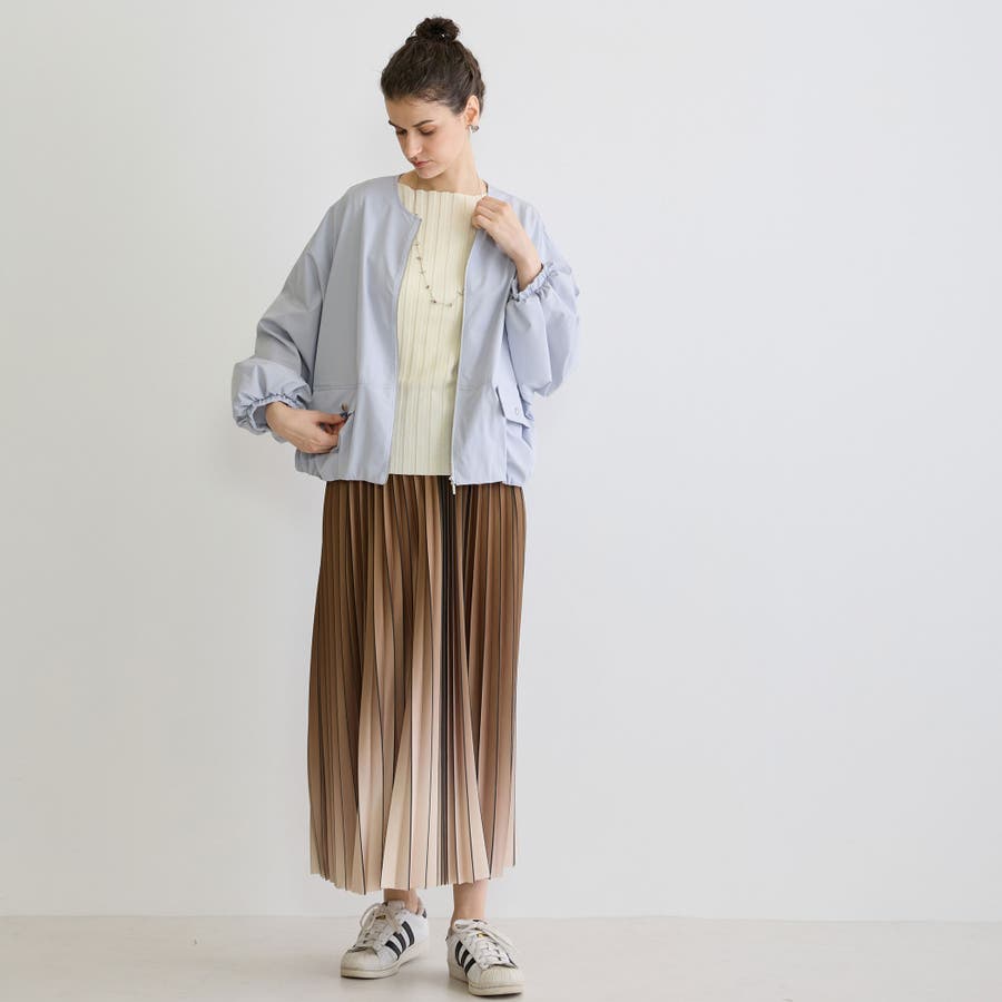 ノーカラーが首回りをスッキリさせてくせるジップブルゾンは軽量で着心地も◎