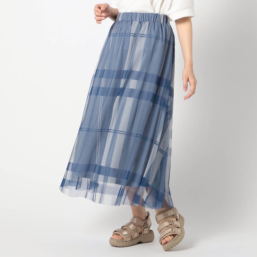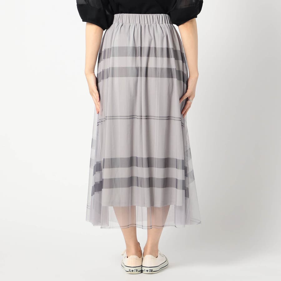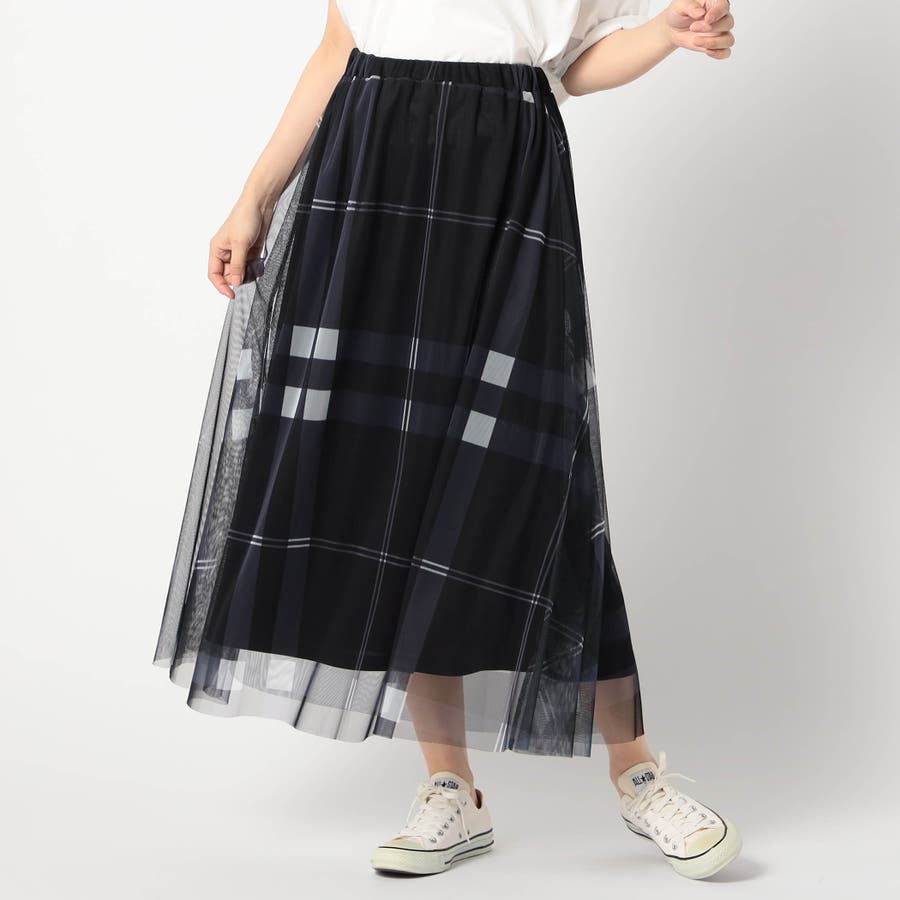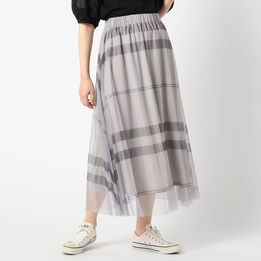 チュール素材にチェック柄をプリントしたロングスカートに新色が登場です。