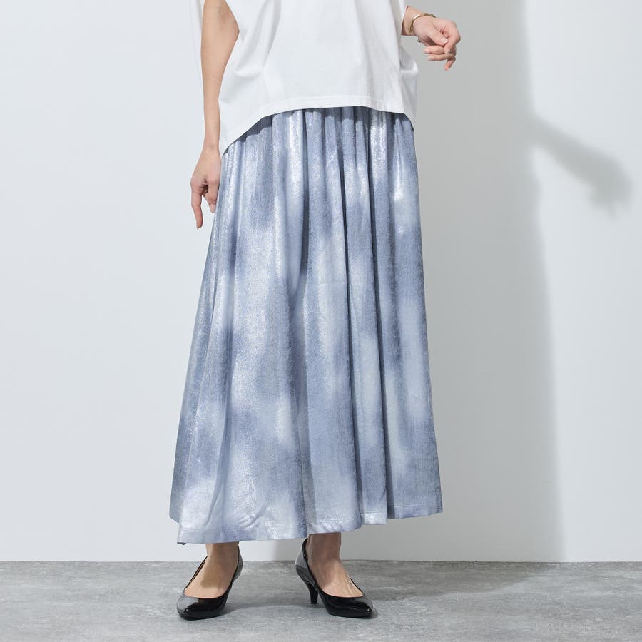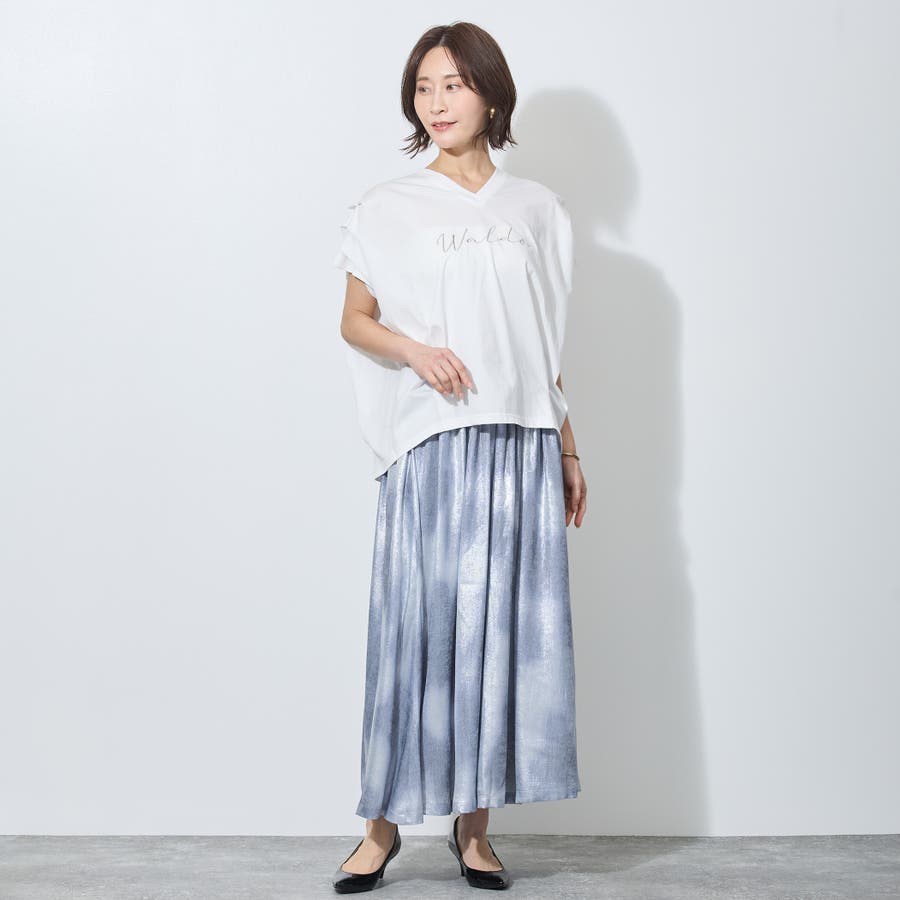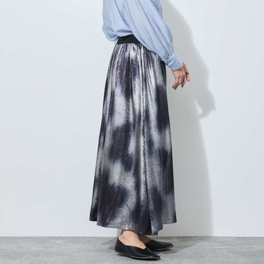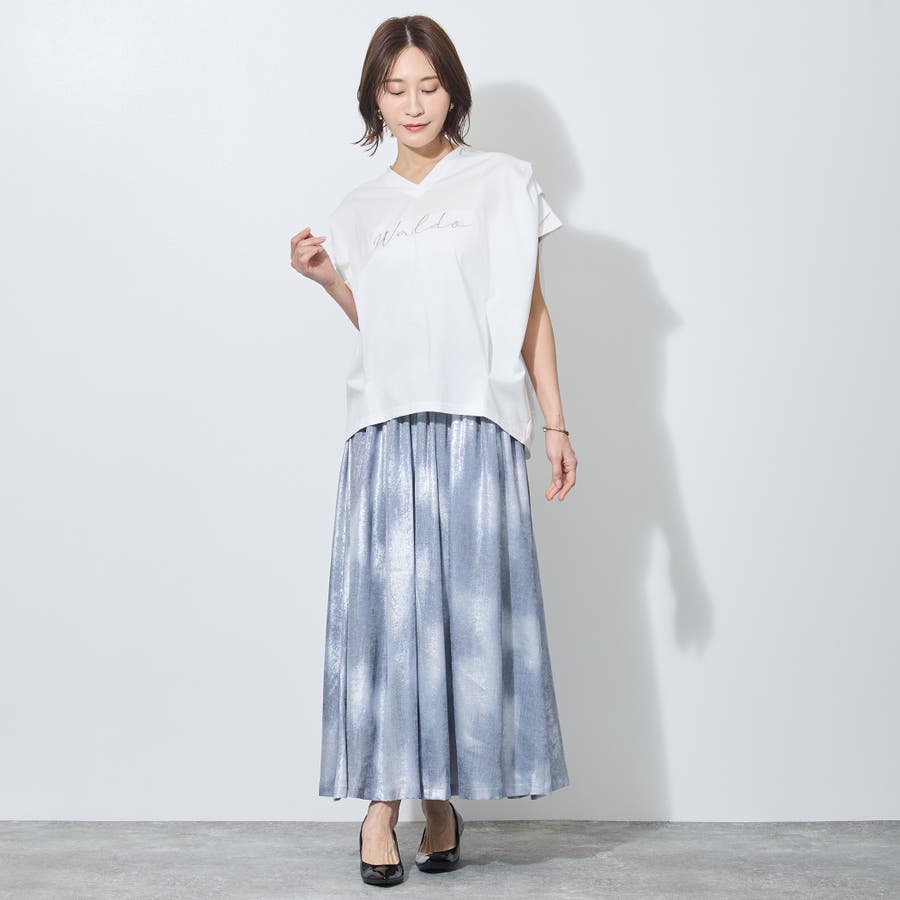 【WALDO】ウエストゴムムラ染め光沢プリントギャザーフレアースカート
