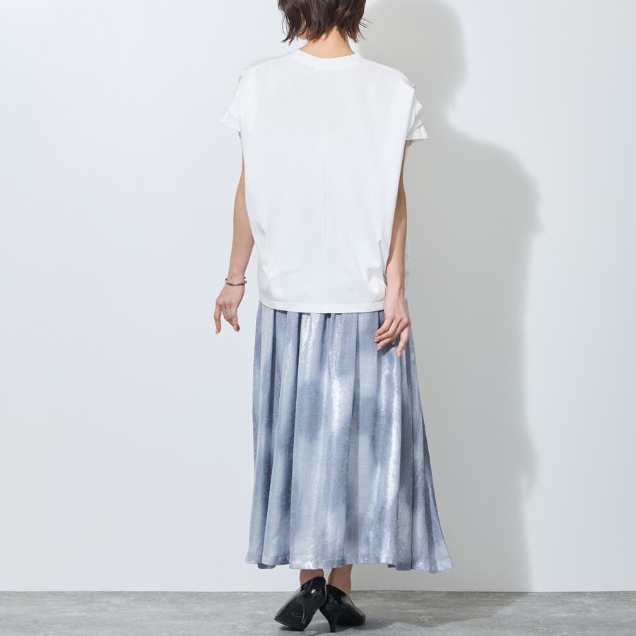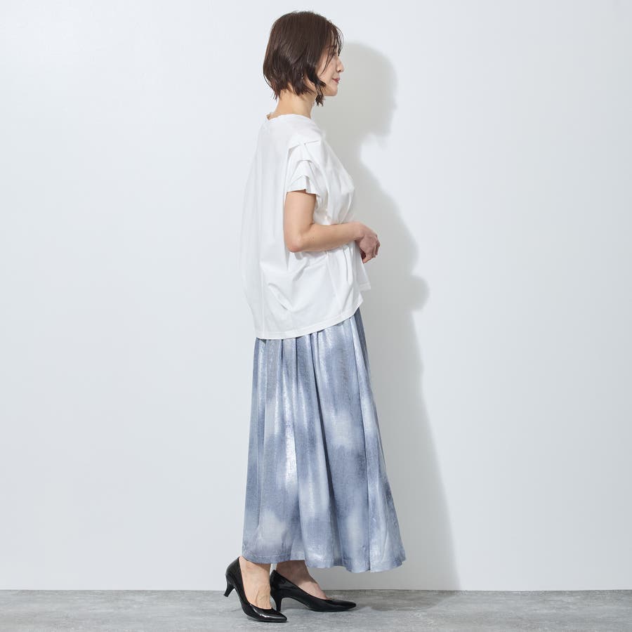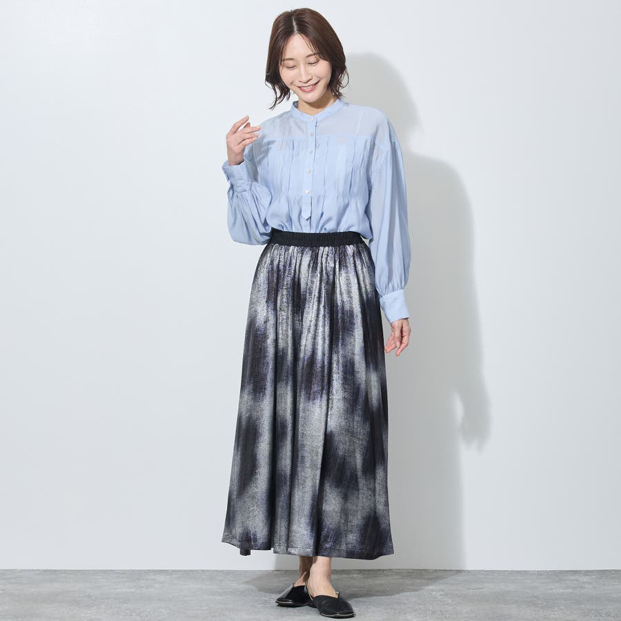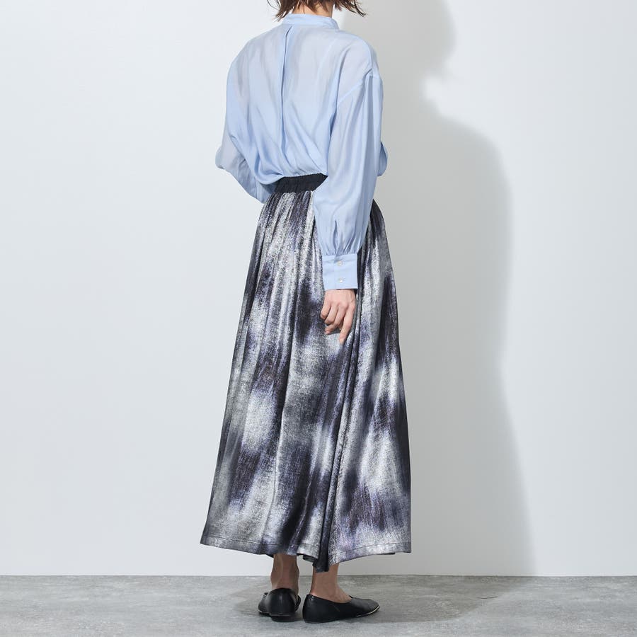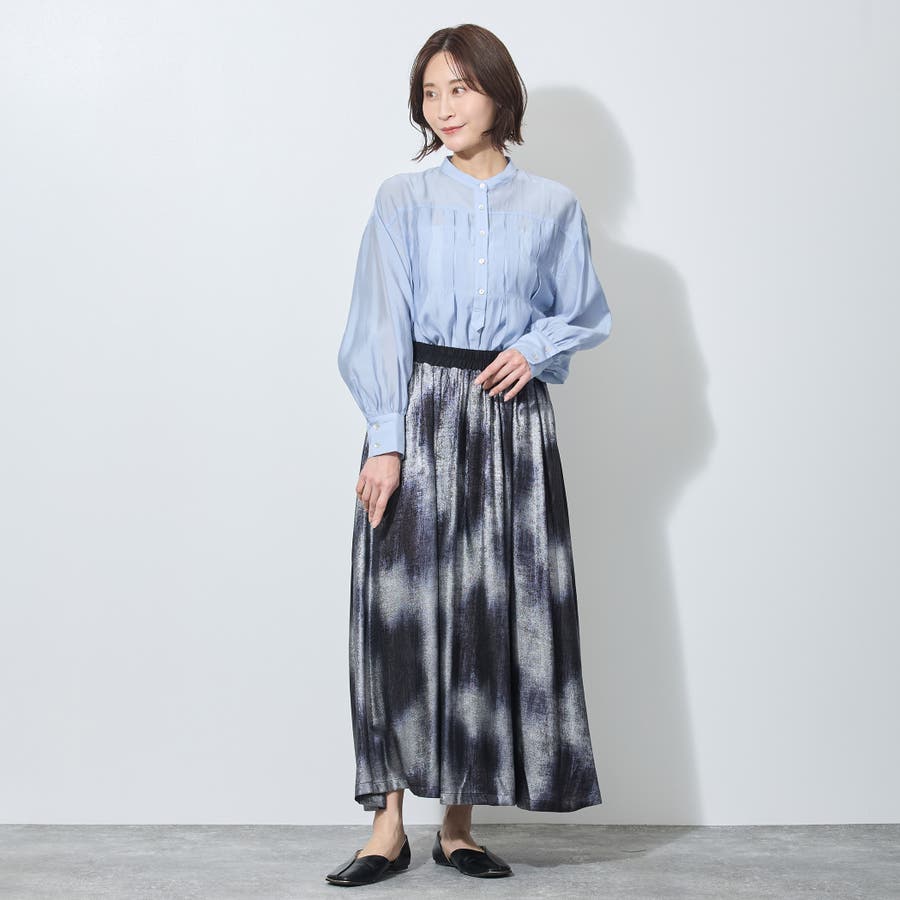 シンプルなトップスを合わせていただくことで、落ち着いた光沢と水彩のようなムラ染めのエレガントさが一層引き立ちます。