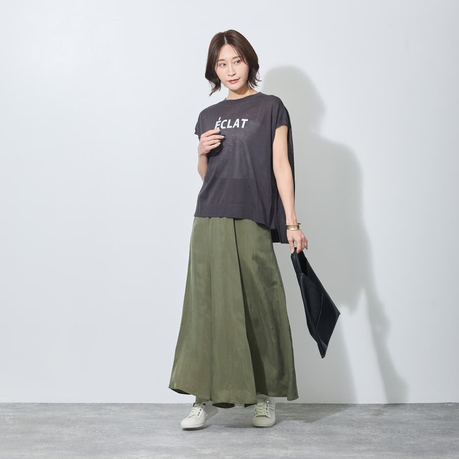 左前の切替えにスリットを入れることで、細身のラインでも歩きやすく、ウエストゴム仕様がリラックスした着心地も叶えます。