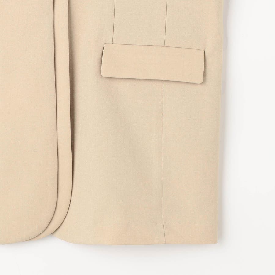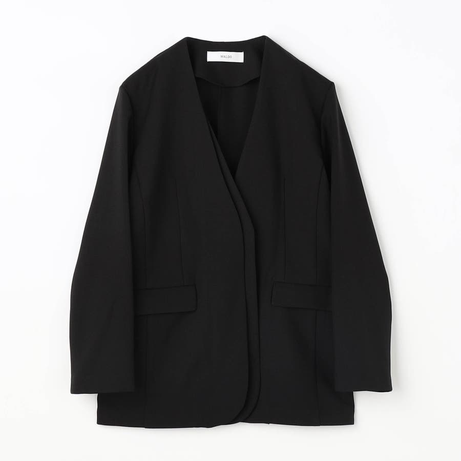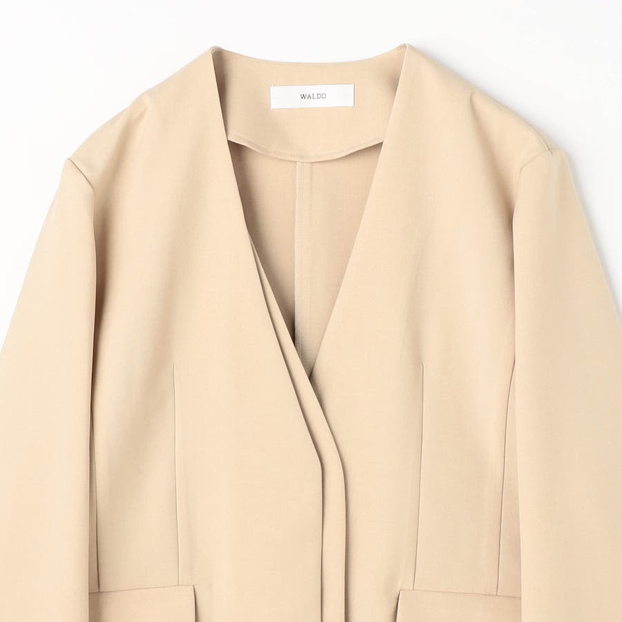 スッキリとしたノーカラーで、シンプルながらもフロントのレイヤード風デザインが上品な印象のジャケットです。
