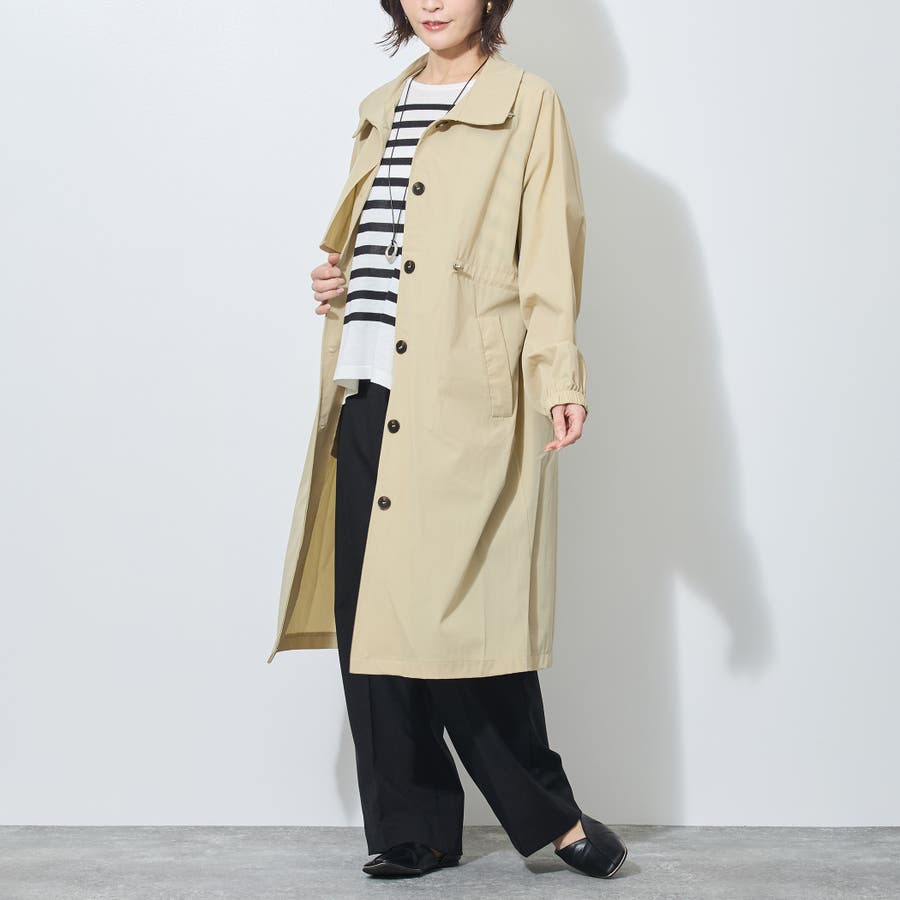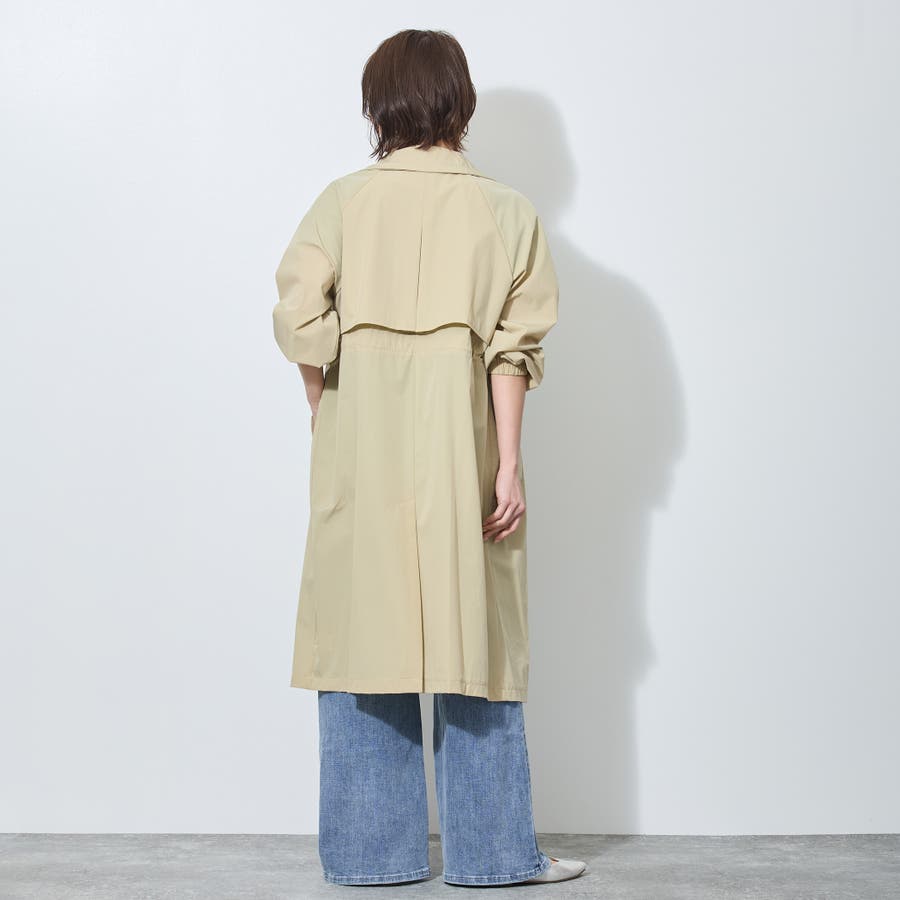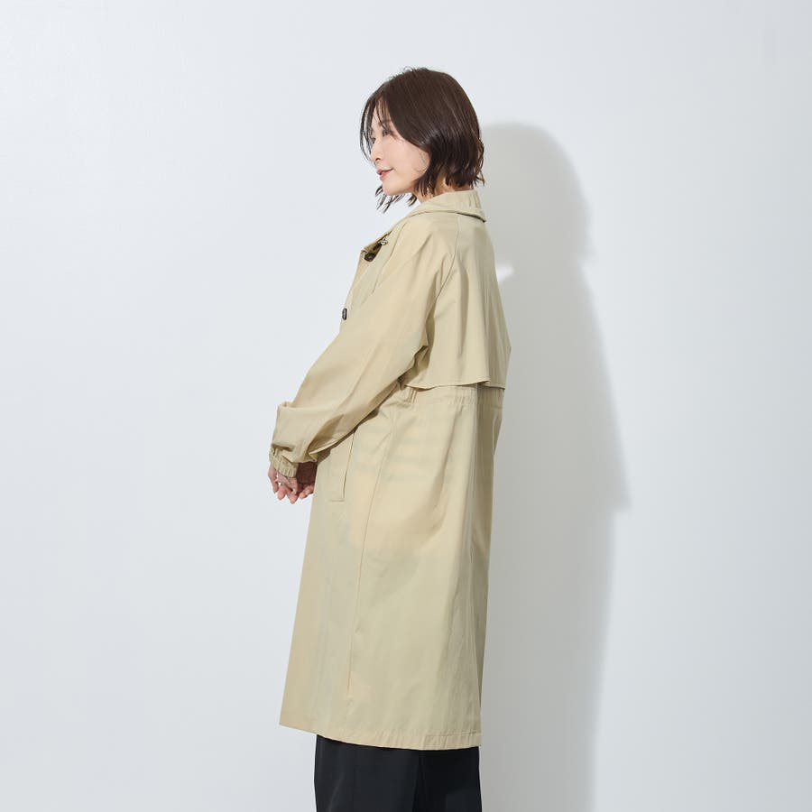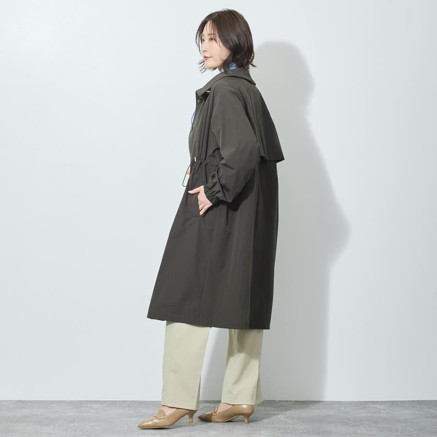 バックスタイルはアンブレラヨークとセンターベント入り。衿端とウエストのゴムスピンドルがデザインポイントで、シンプル過ぎないのがうれしい万能コートです。