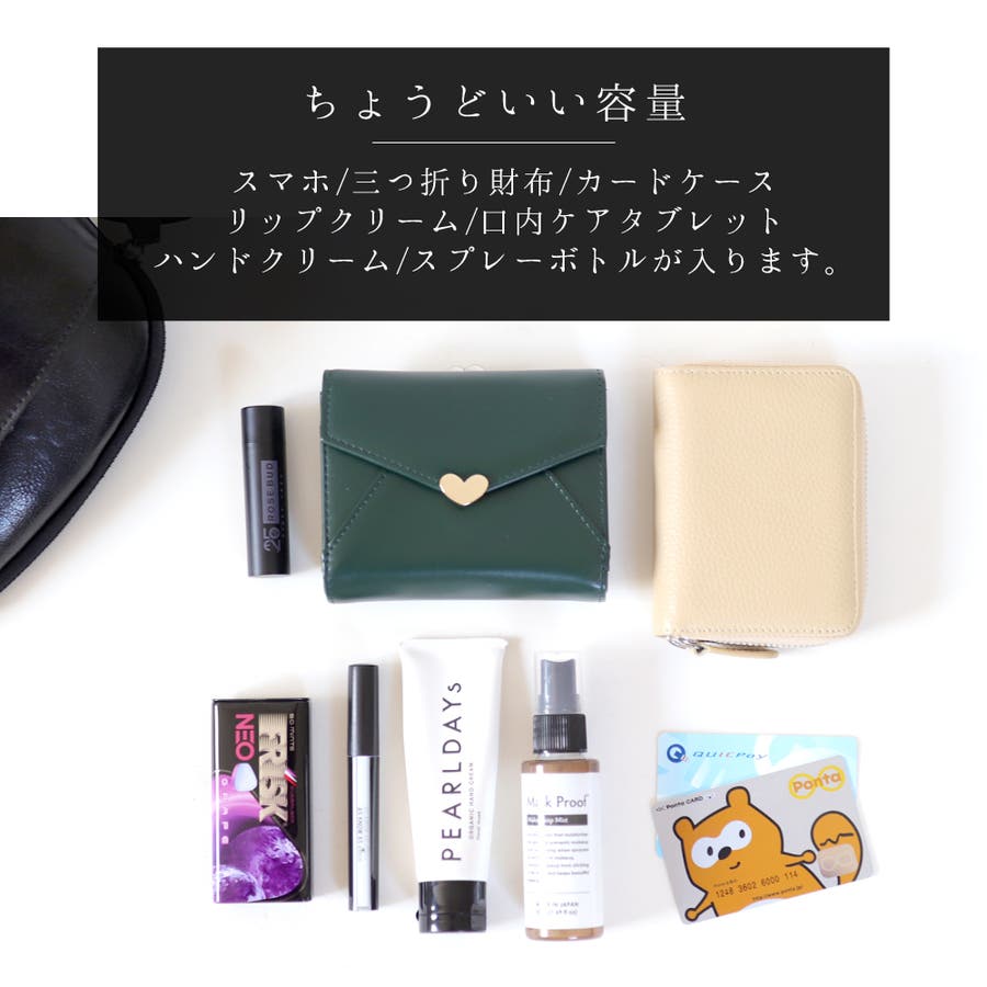iPhone、三つ折り財布、ハンカチ、ミニポーチが入るコンパクトな容量です。