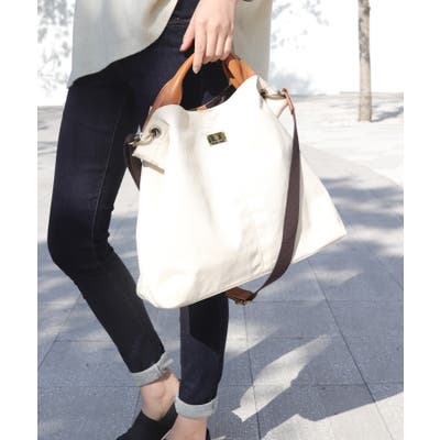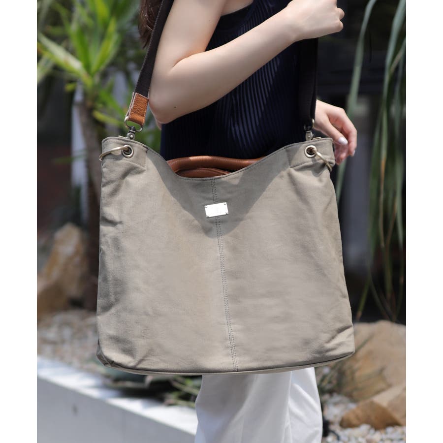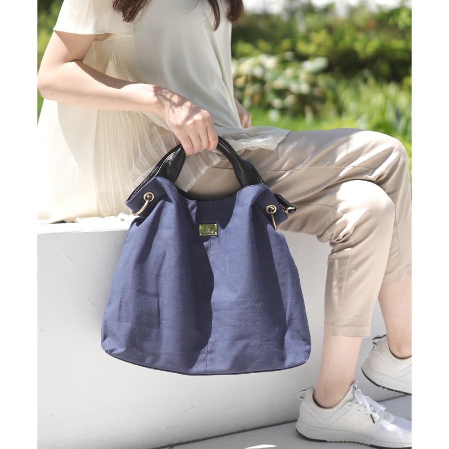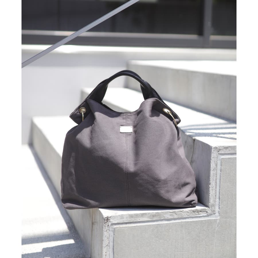 カジュアルな素材/コットンキャンバス生地でも上質さを感じる持ち手のレザーとゴールドのプレートでまさにリッチカジュアルな仕上がり。