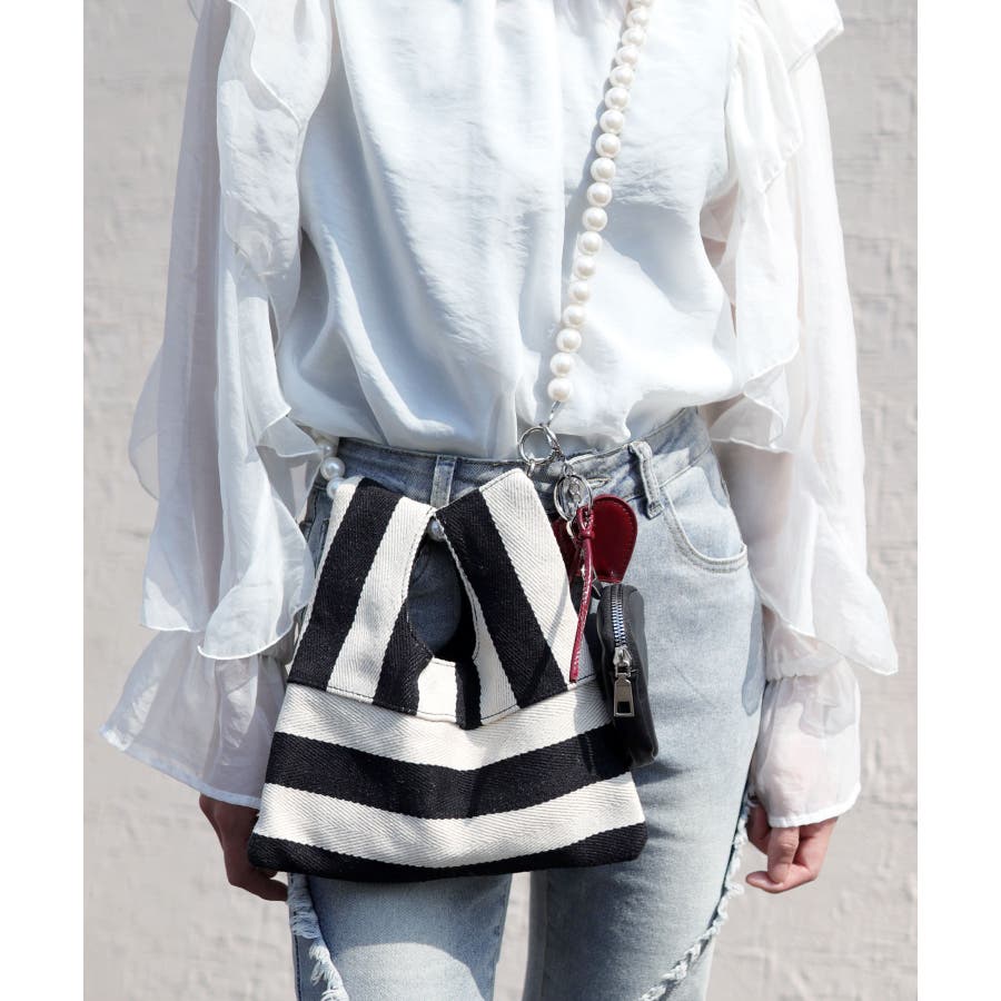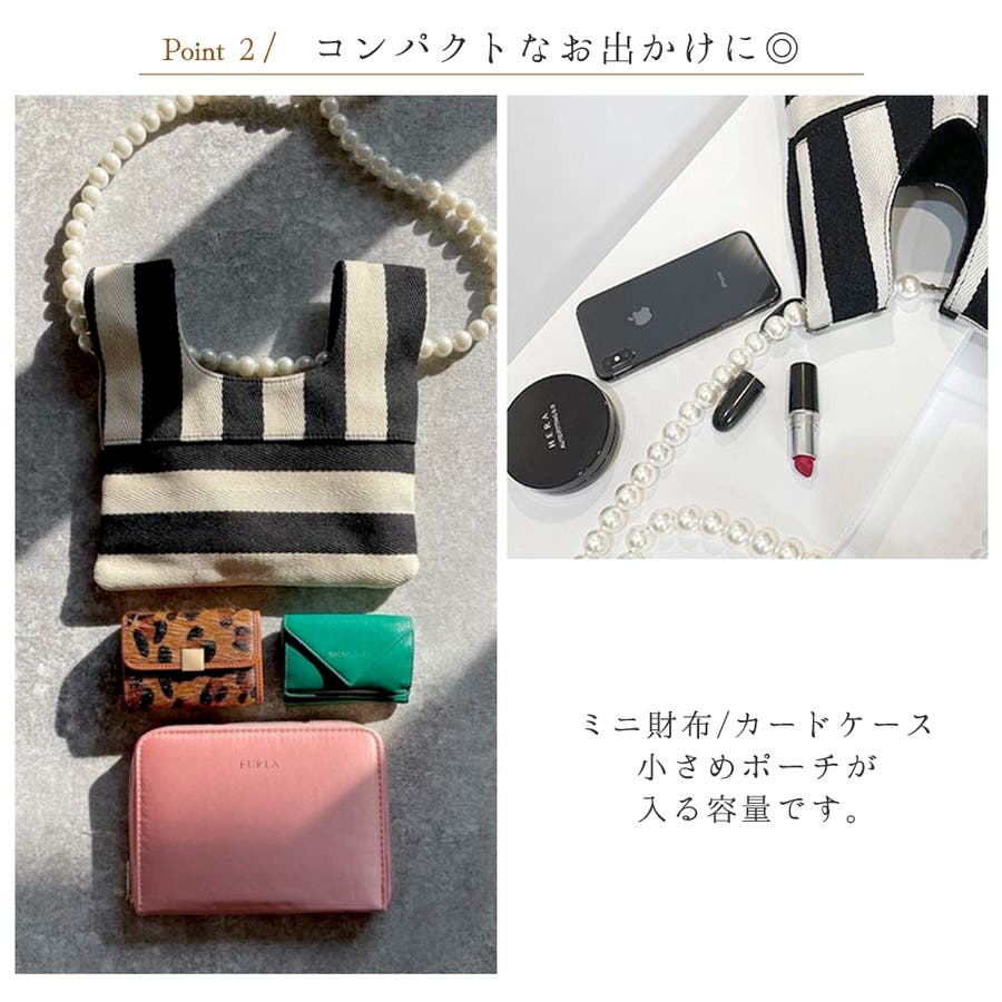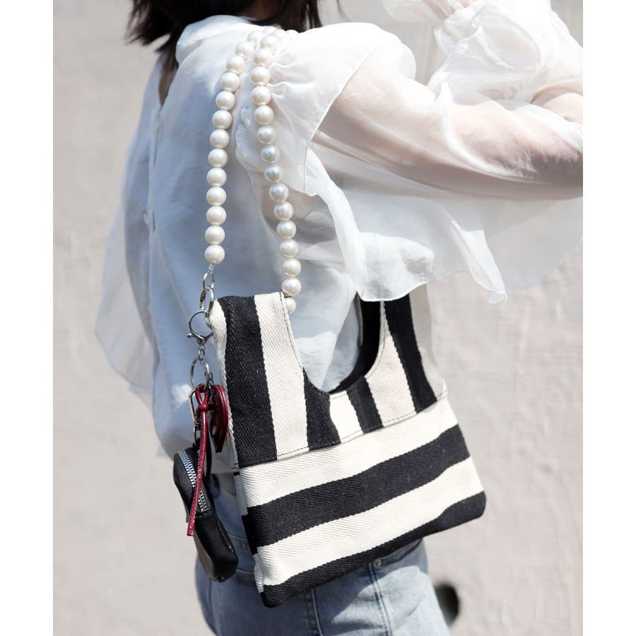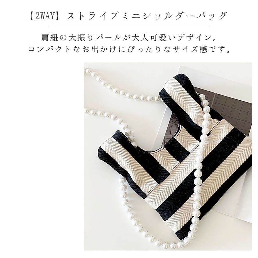 パールチェーンのストライプ柄ミニショルダーバッグ/小さめハンドバッグ。