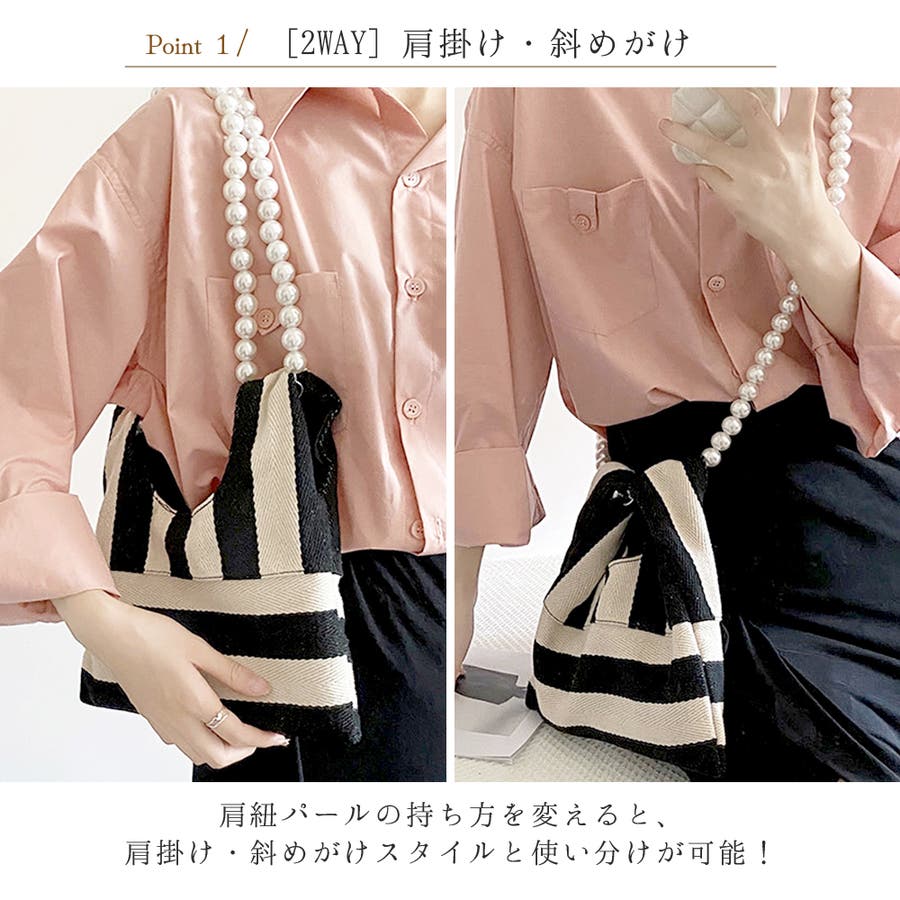 肩紐の大振りパールがアクセントになって、オシャレ&可愛い仕上がりです。