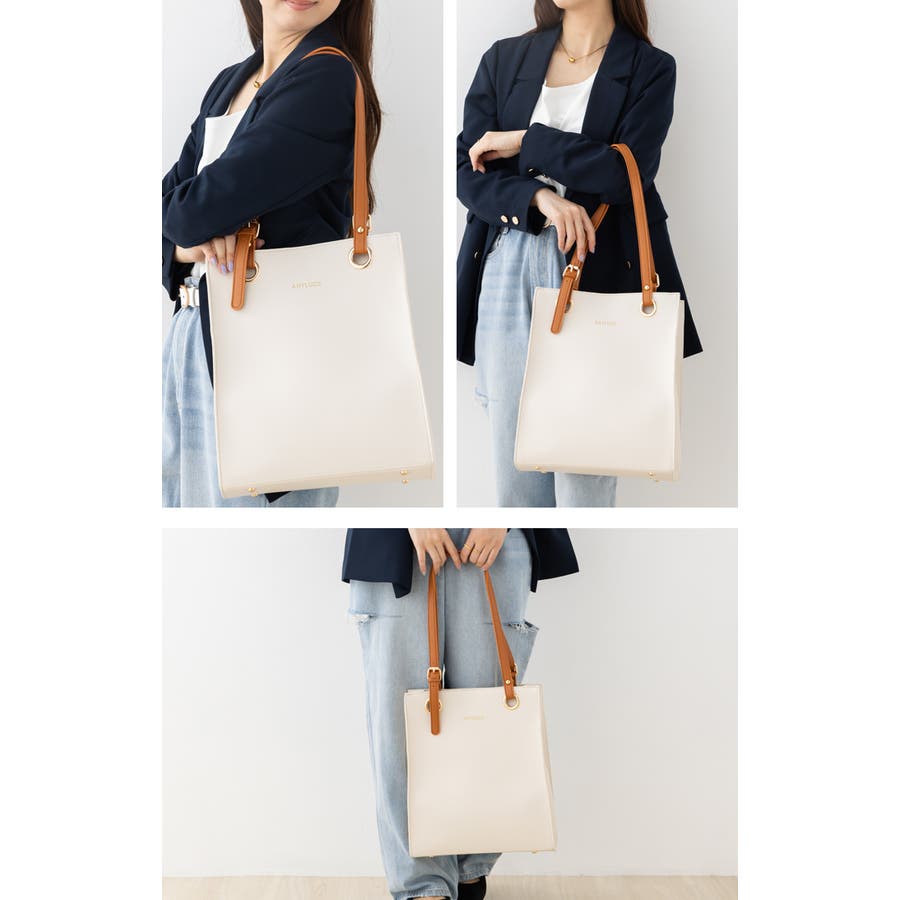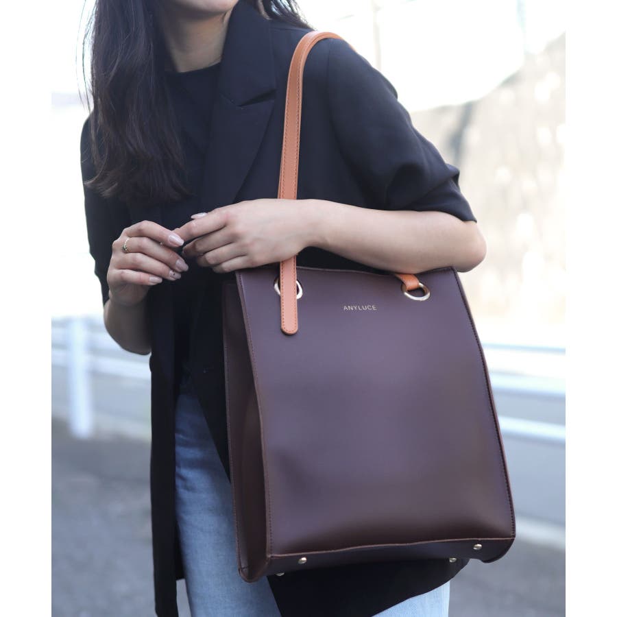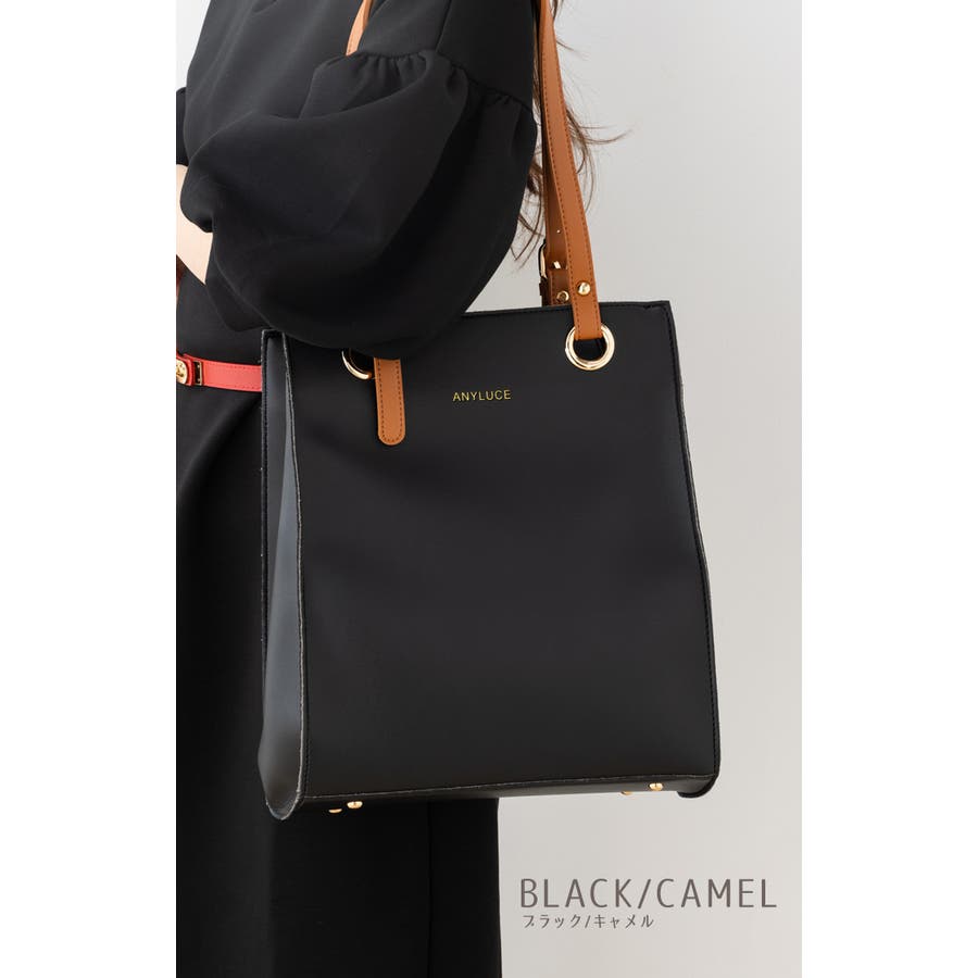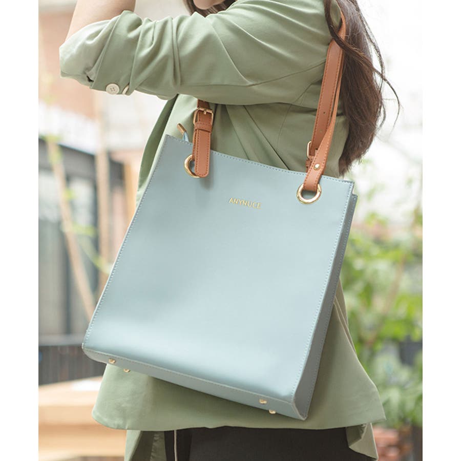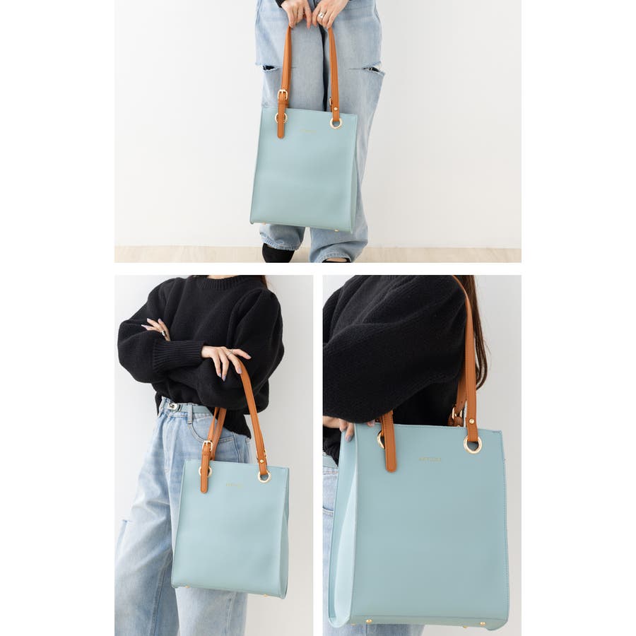 配色スクエアフォルムのPUレザートートバッグ。