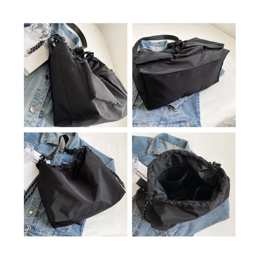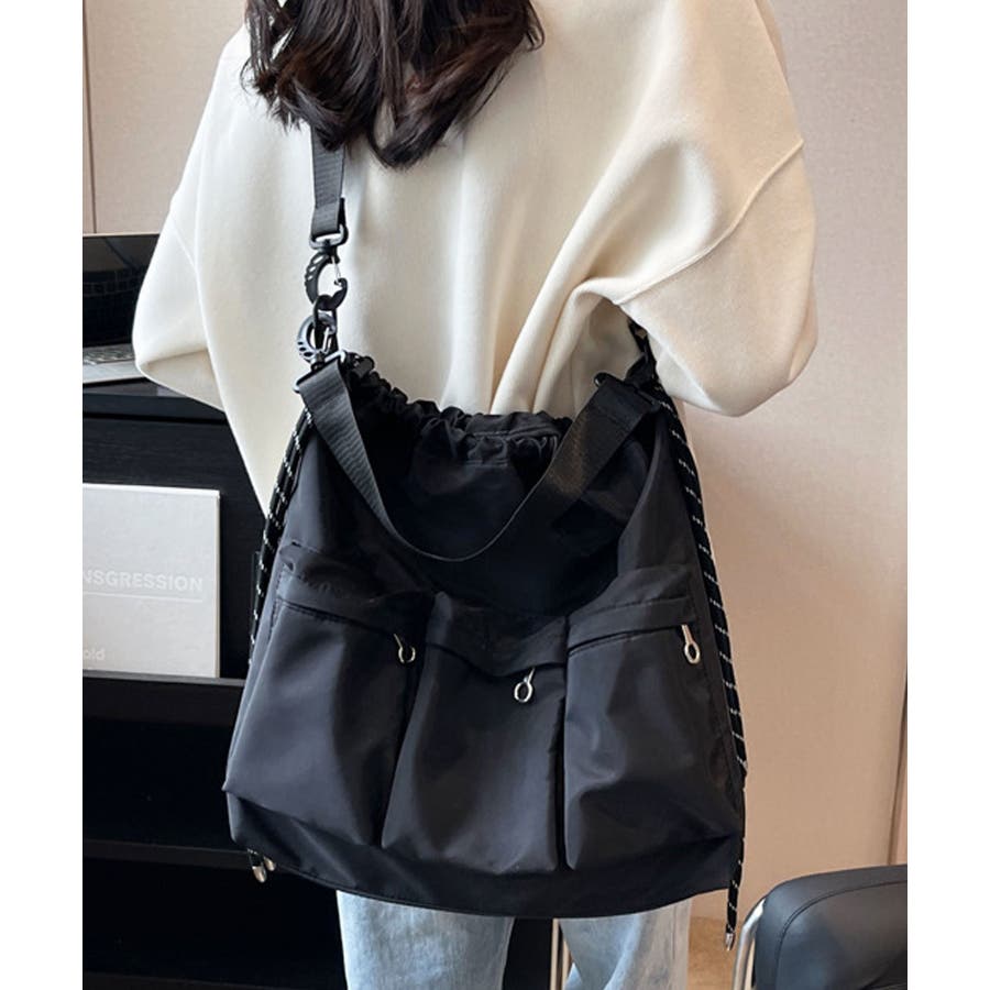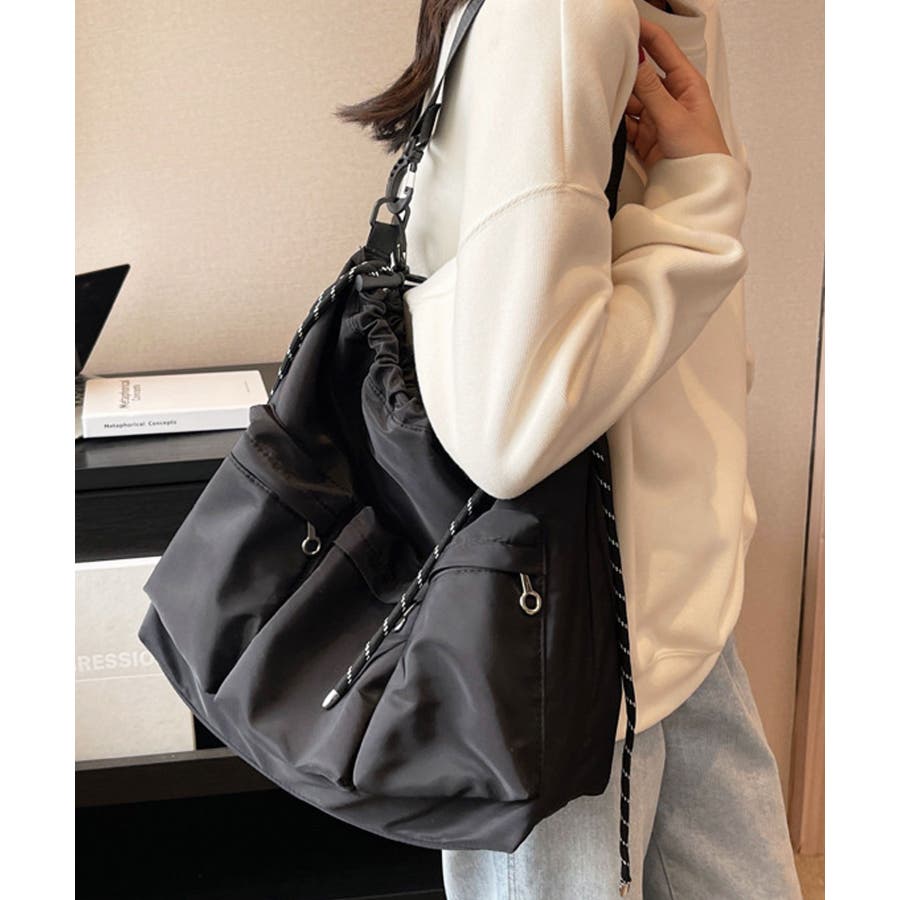 縦長フォルムに開閉口の巾着仕様でくったりとしたシルエットがオシャレなショルダーバッグです。