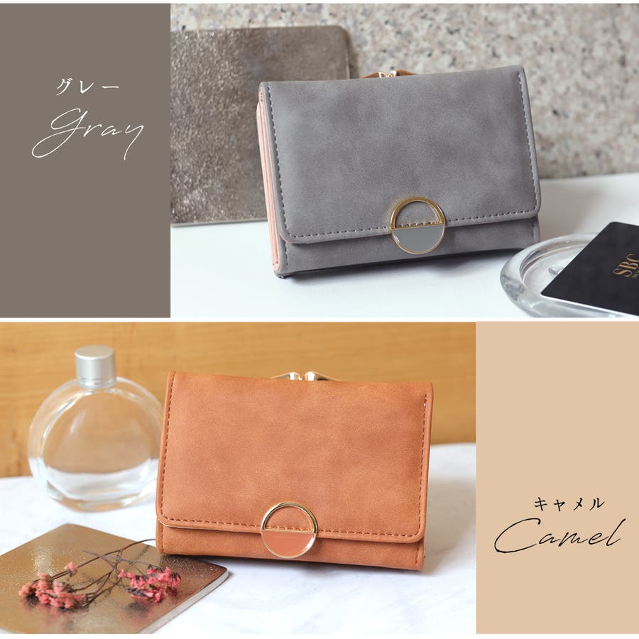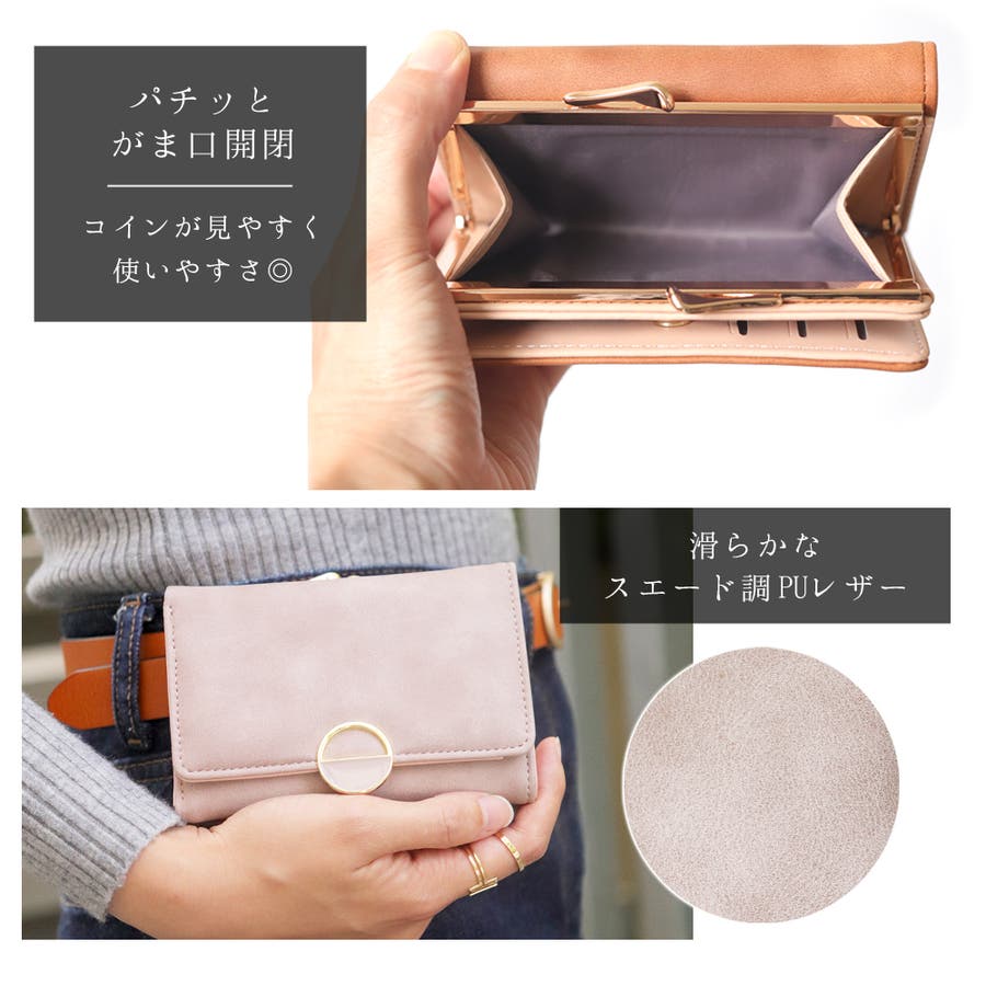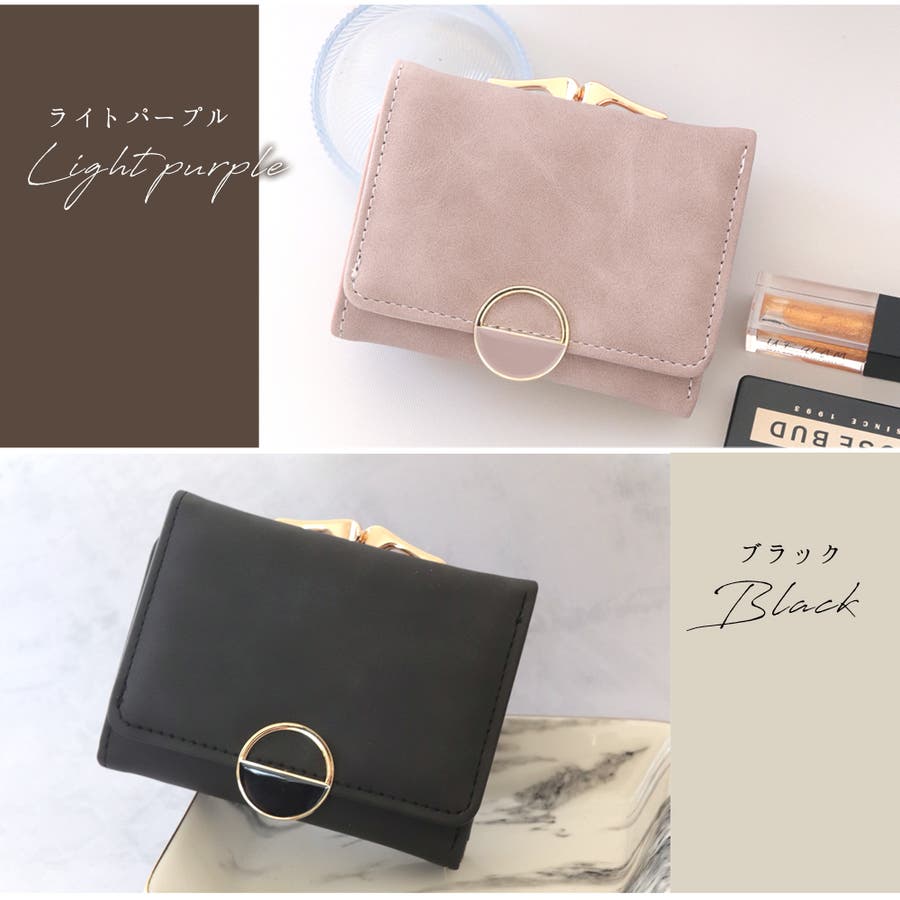 がま口部分には天使の羽のような開け口があしらわれたきれいめデザインの三つ折り財布。