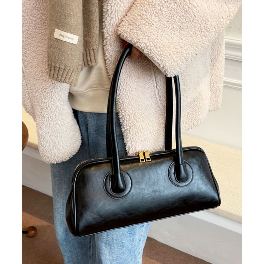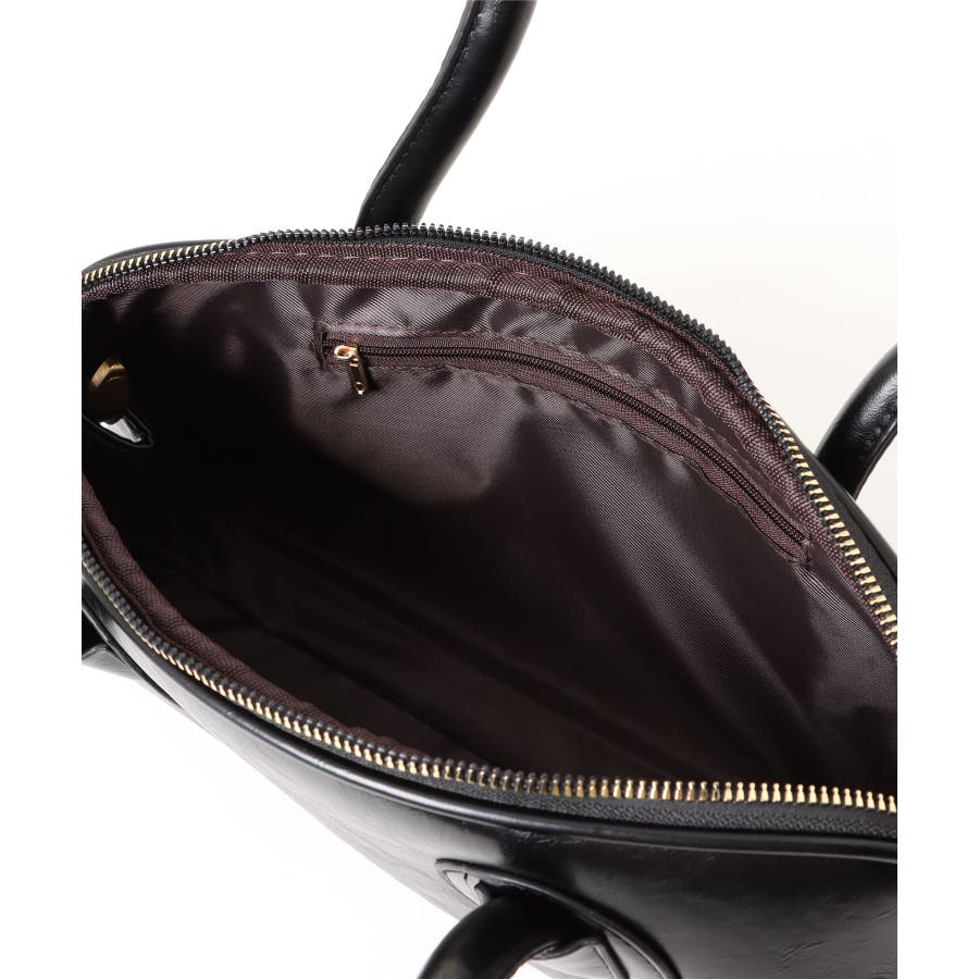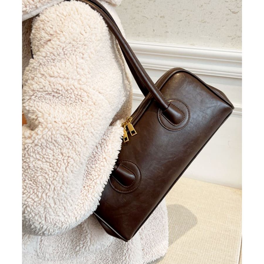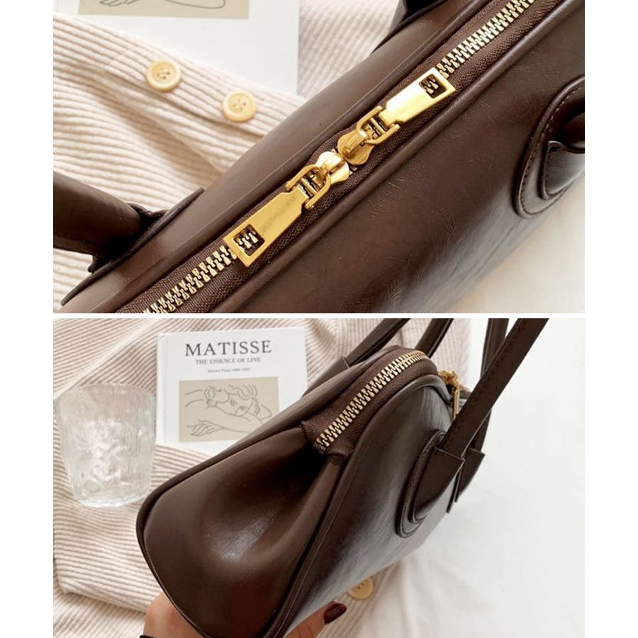 高見えするセミマットPUレザーを使用し、ゴールドファスナーがレトロかわいい表情のハンドバッグに。