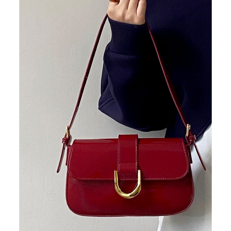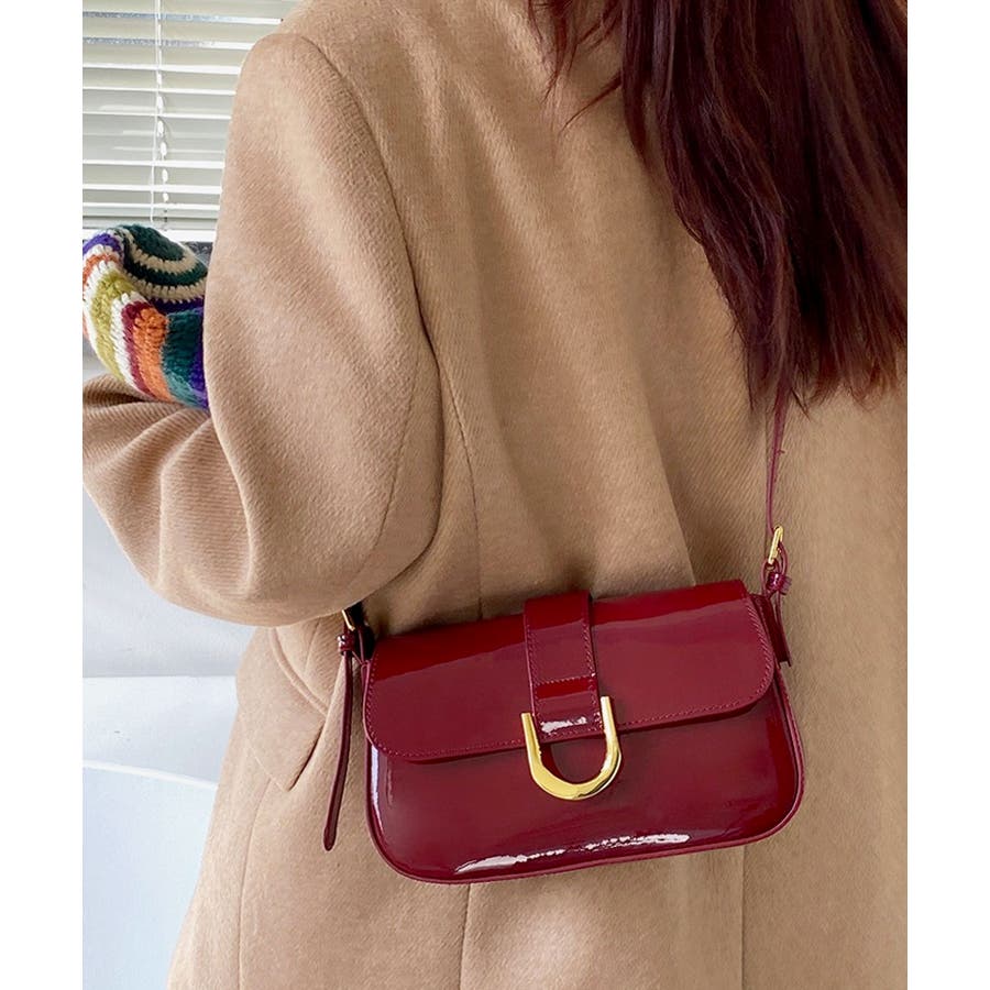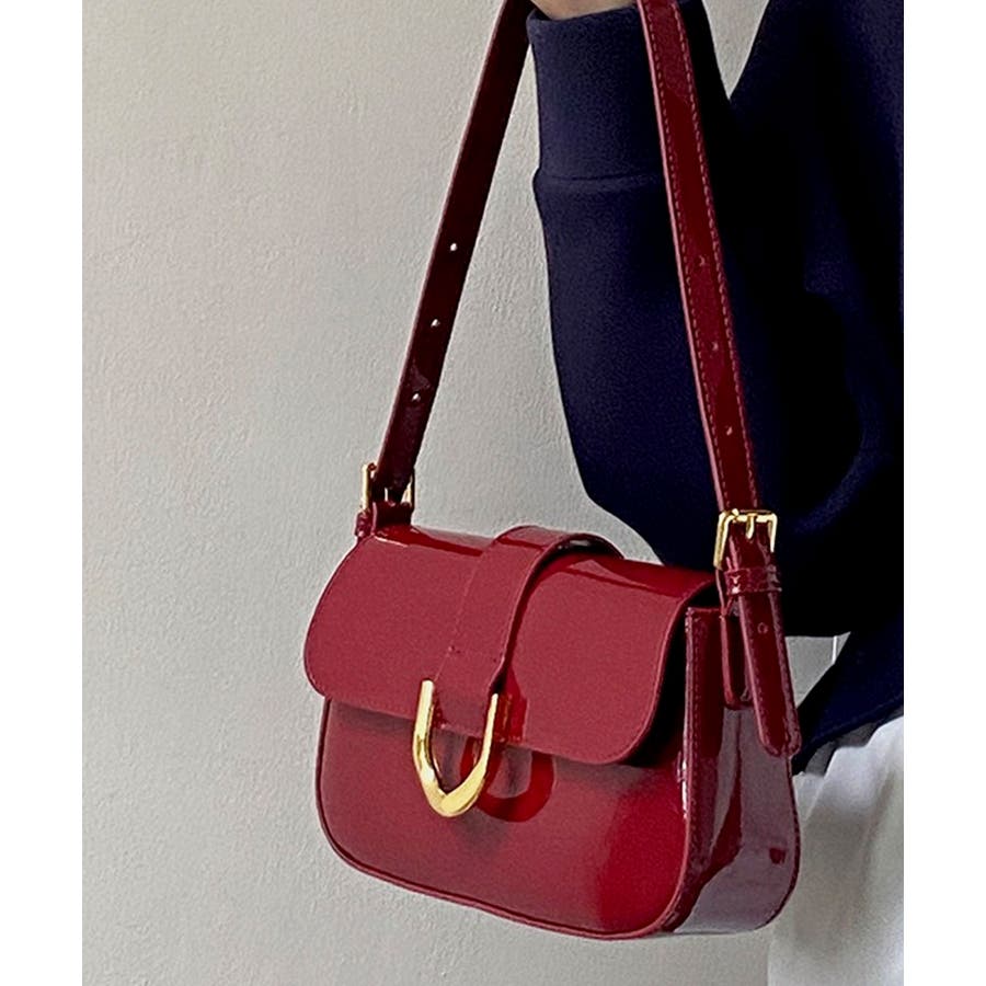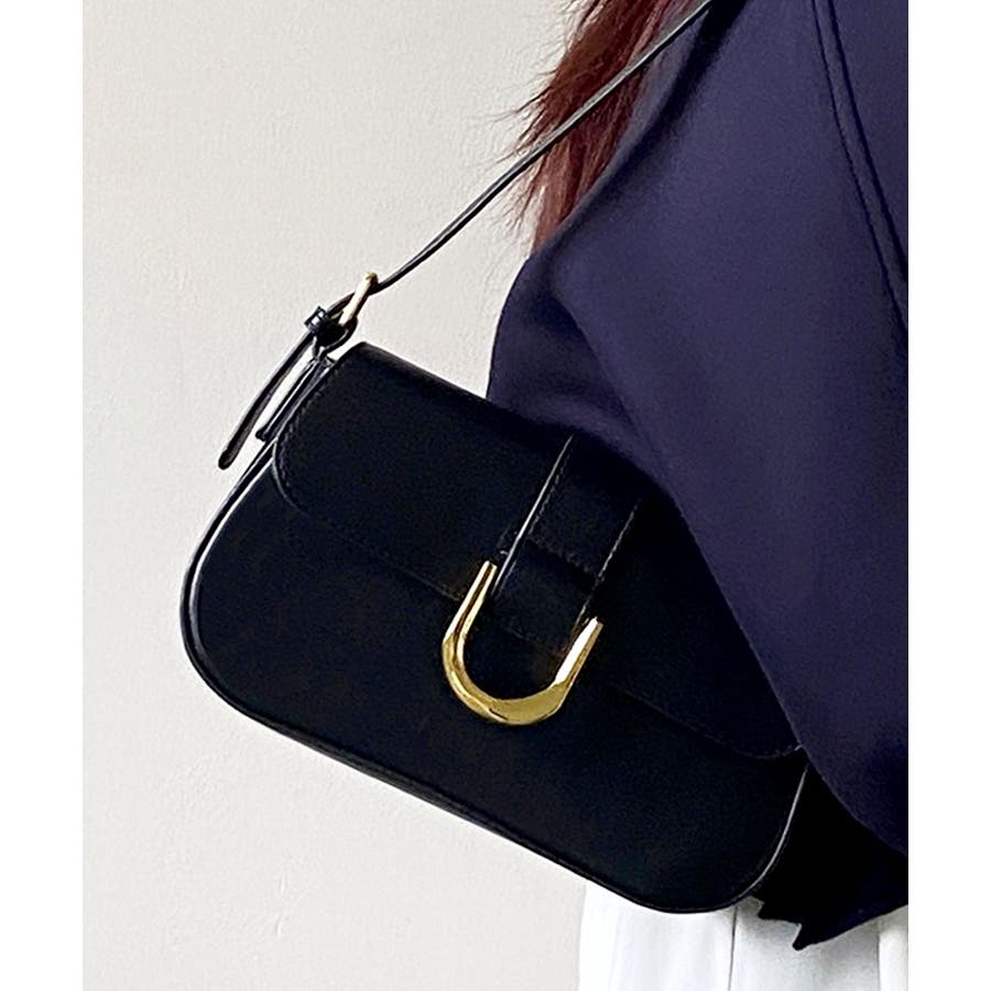 程よいボリューム感のホースシューパーツをフロントにあしらい、気品溢れるショルダーバッグに♪