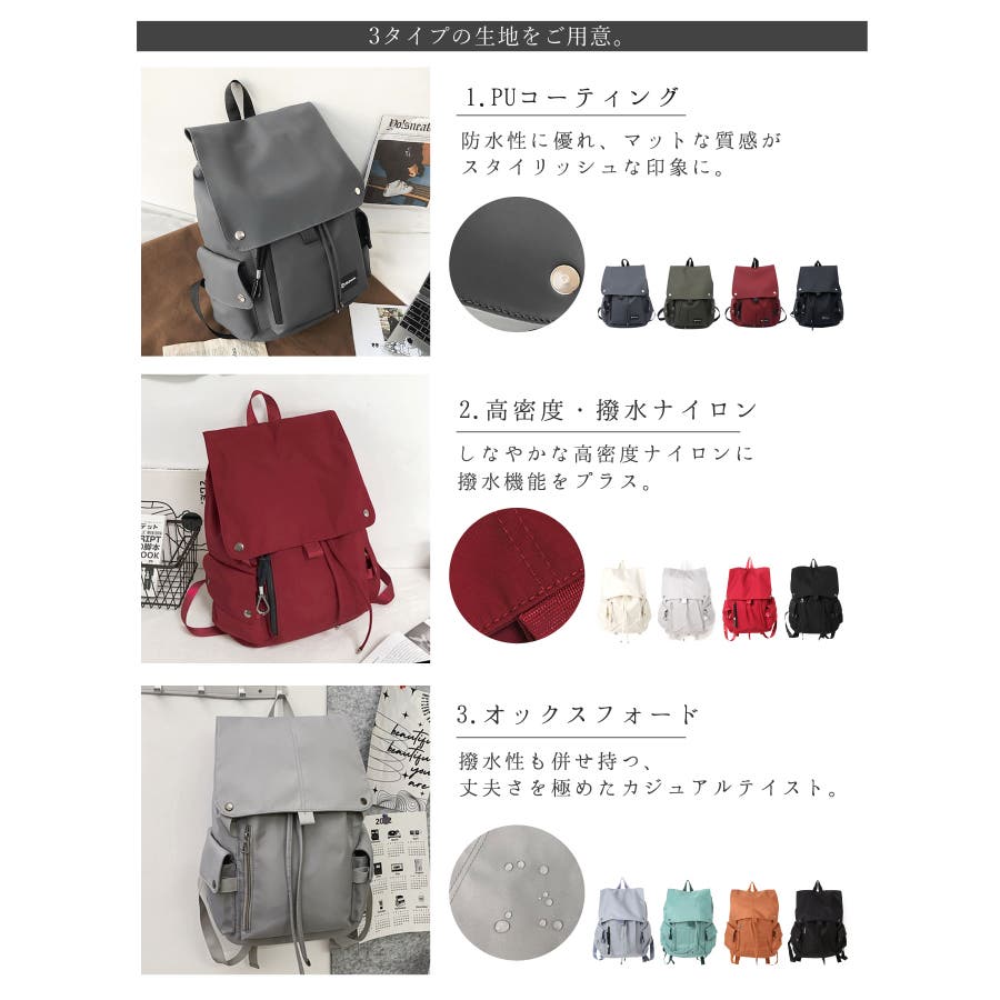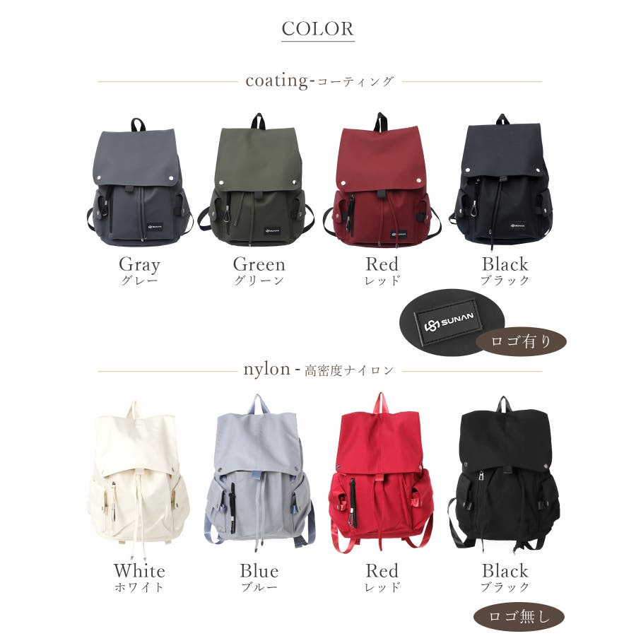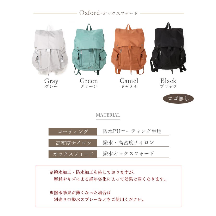 | カラー | コーテイング×グレー / コーテイング×グリーン / コーテイング×レッド / コーテイング×ブラック / 高密度ナイロン×ホワイト / 高密度ナイロン×ブルー / 高密度ナイロン×レッド / 高密度ナイロン×ブラック / オックスフォード×グレー / オックスフォード×グリーン / オックスフォード×キャメル / オックスフォード×ブラック |