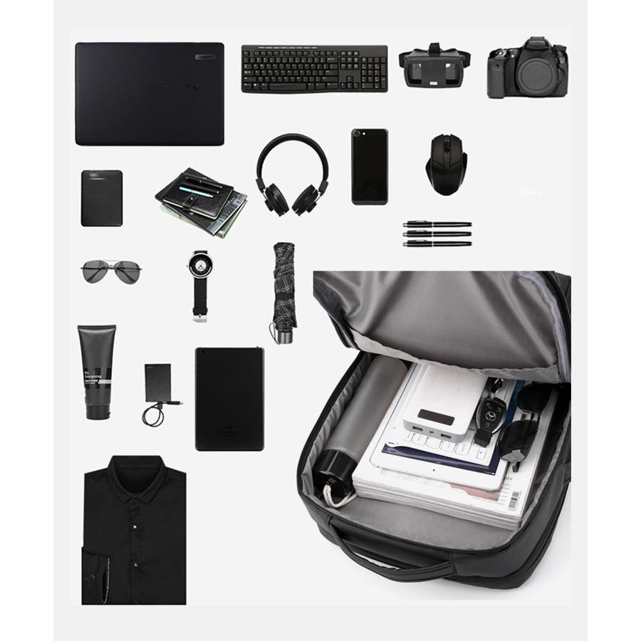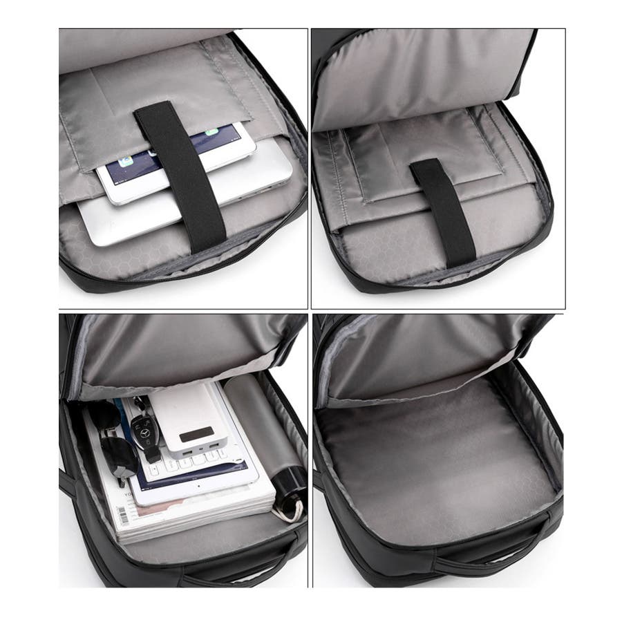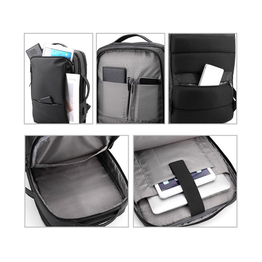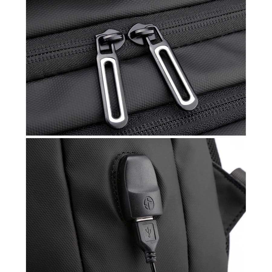 ・外側:ファスナーポケット中/小×各1、内外接続USBポート×1、サイドハンドル×1