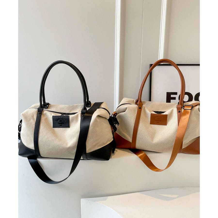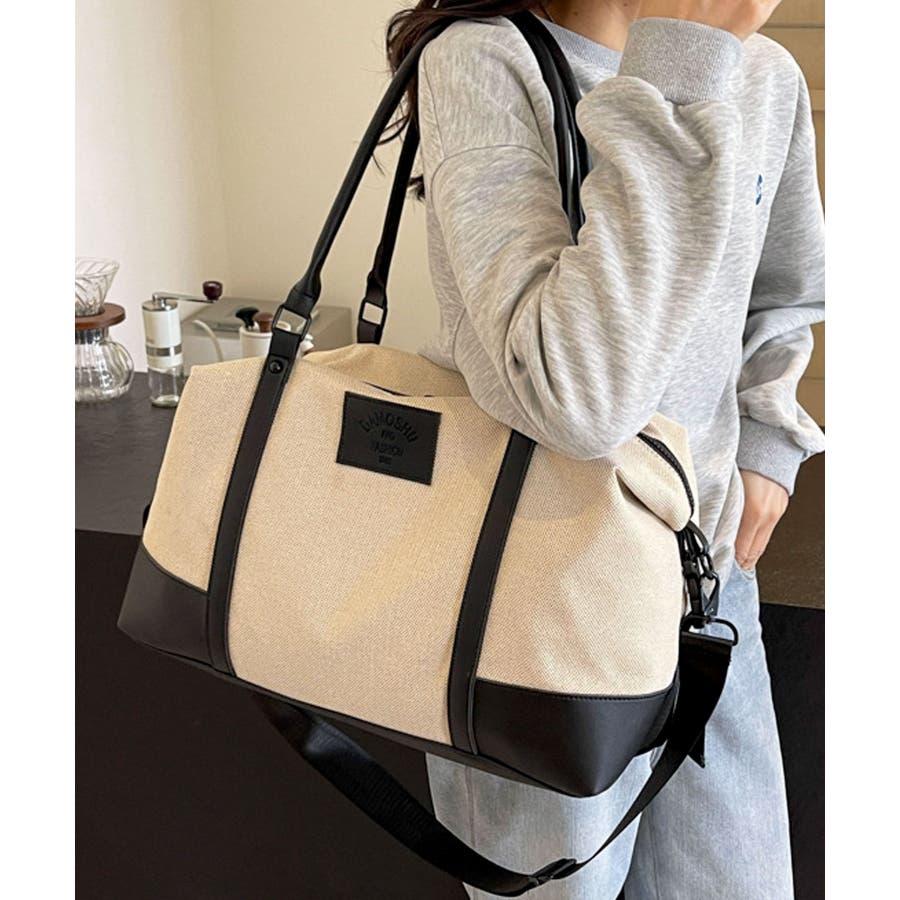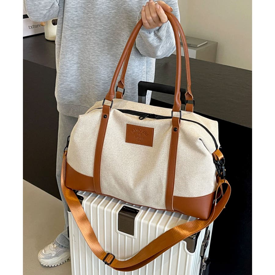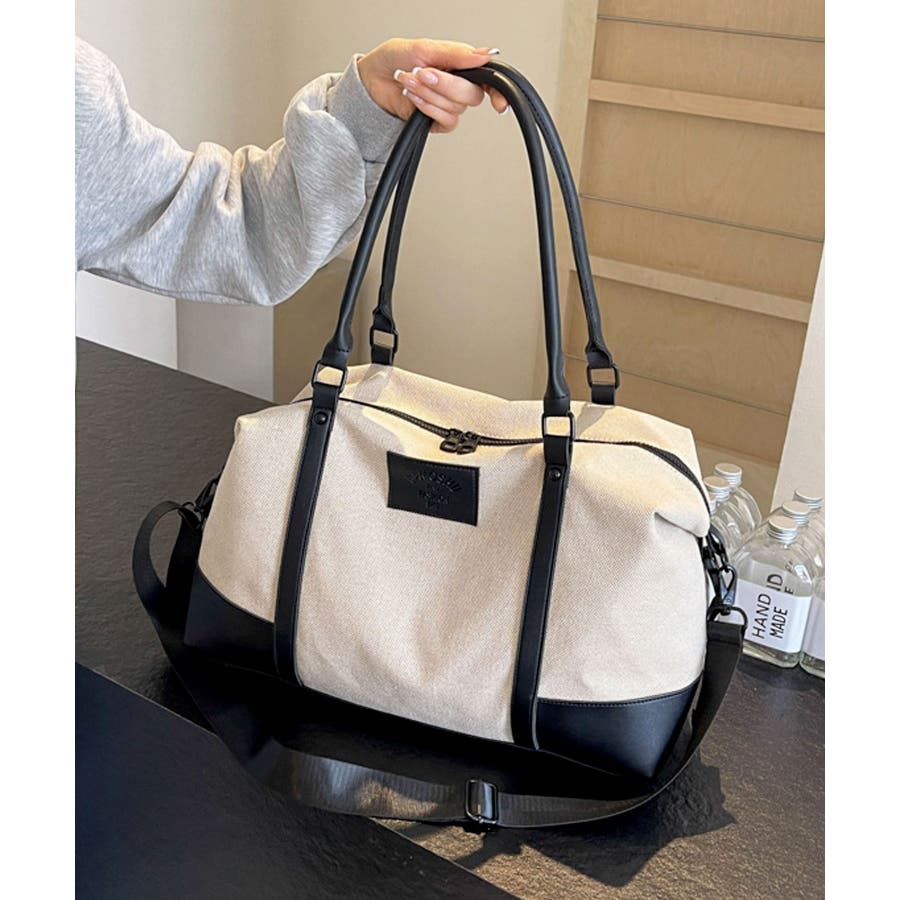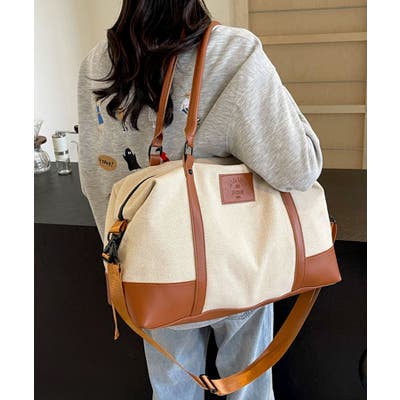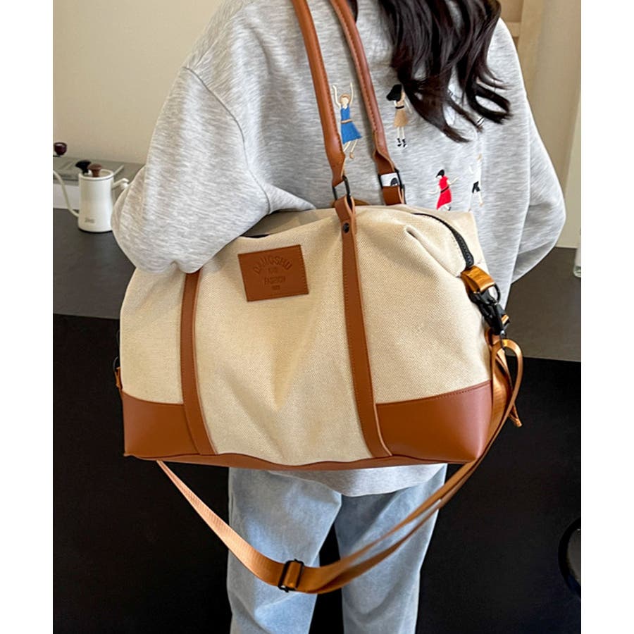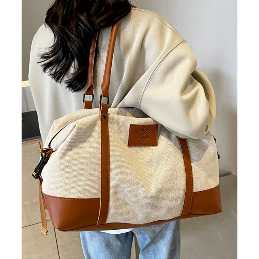 PUレザーライクハンドル×キャンバスボストンバッグ/旅行バッグ/ショルダーバッグ。