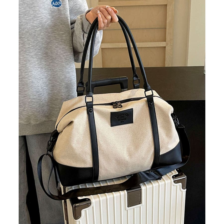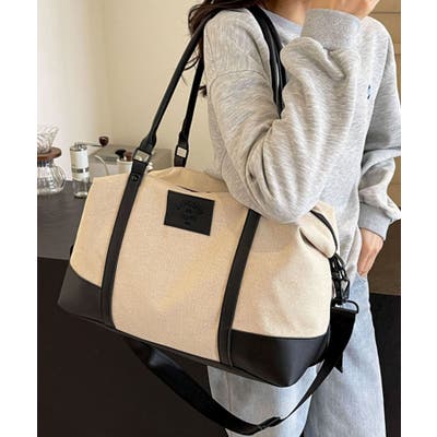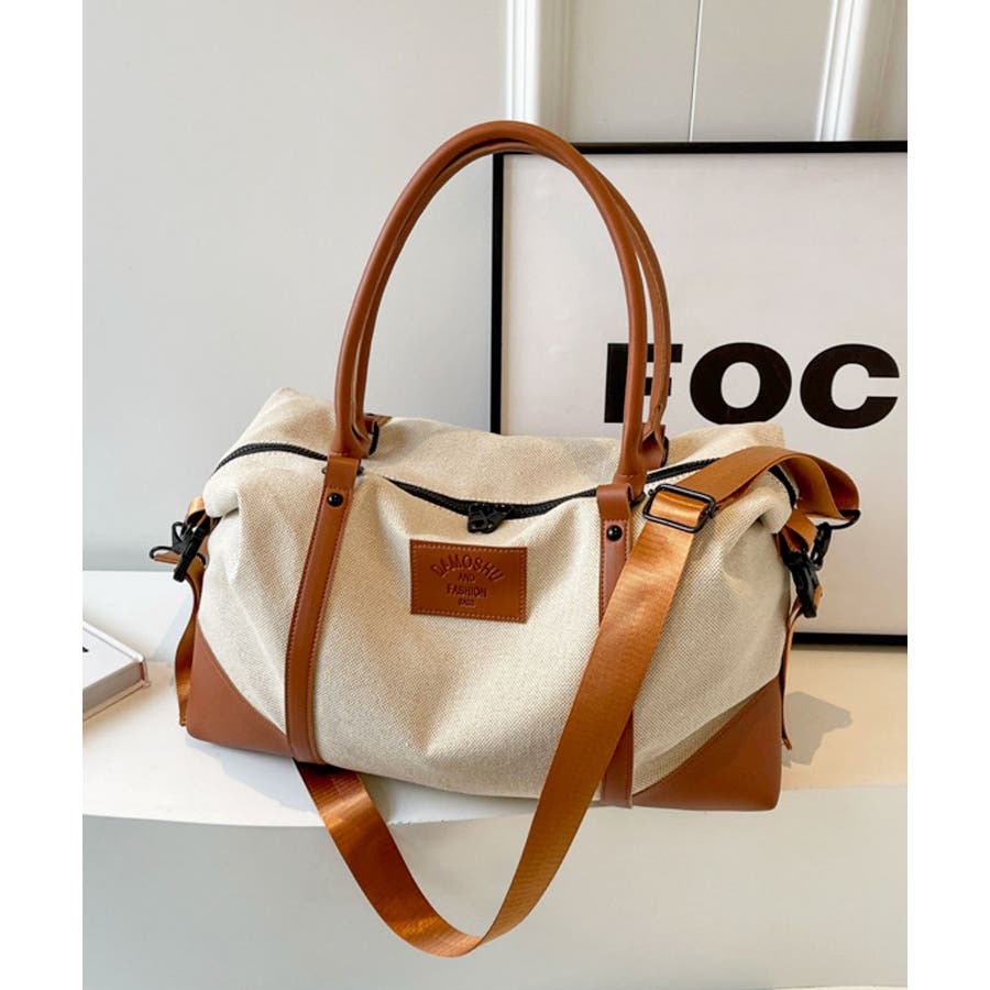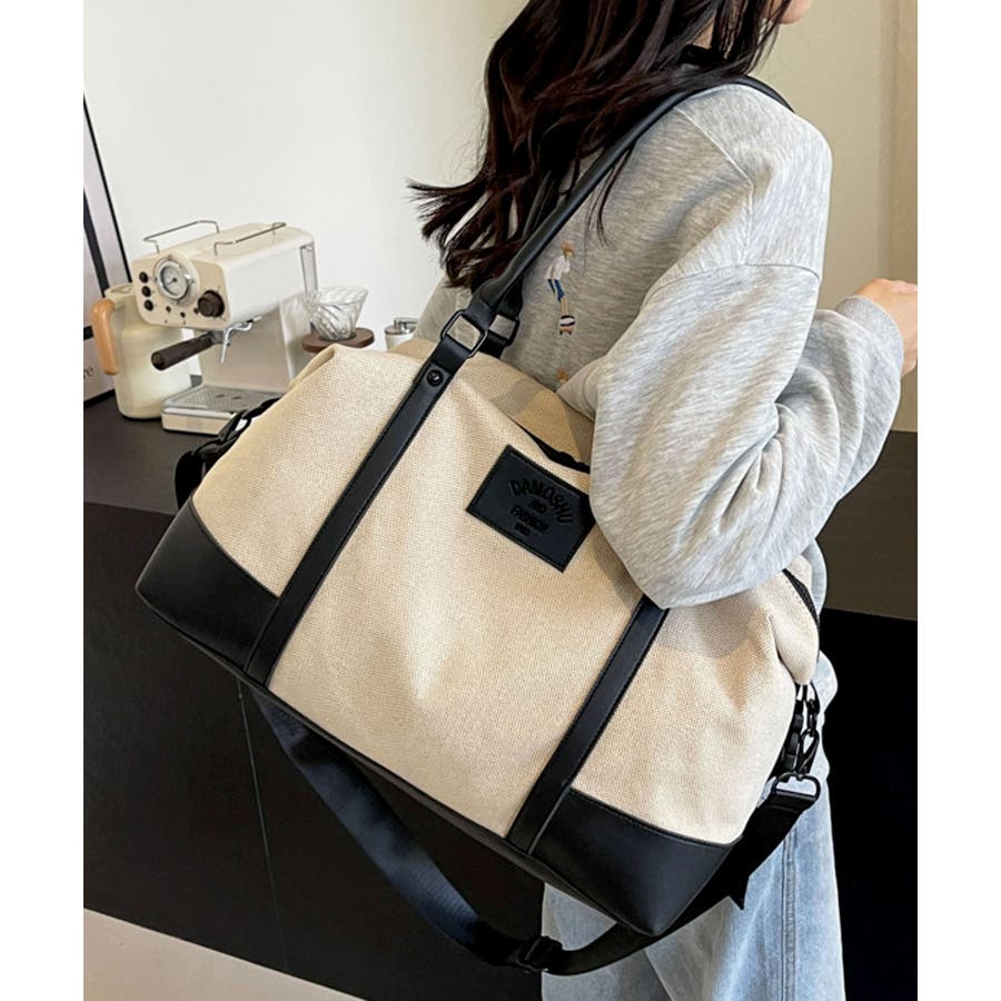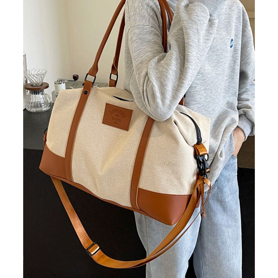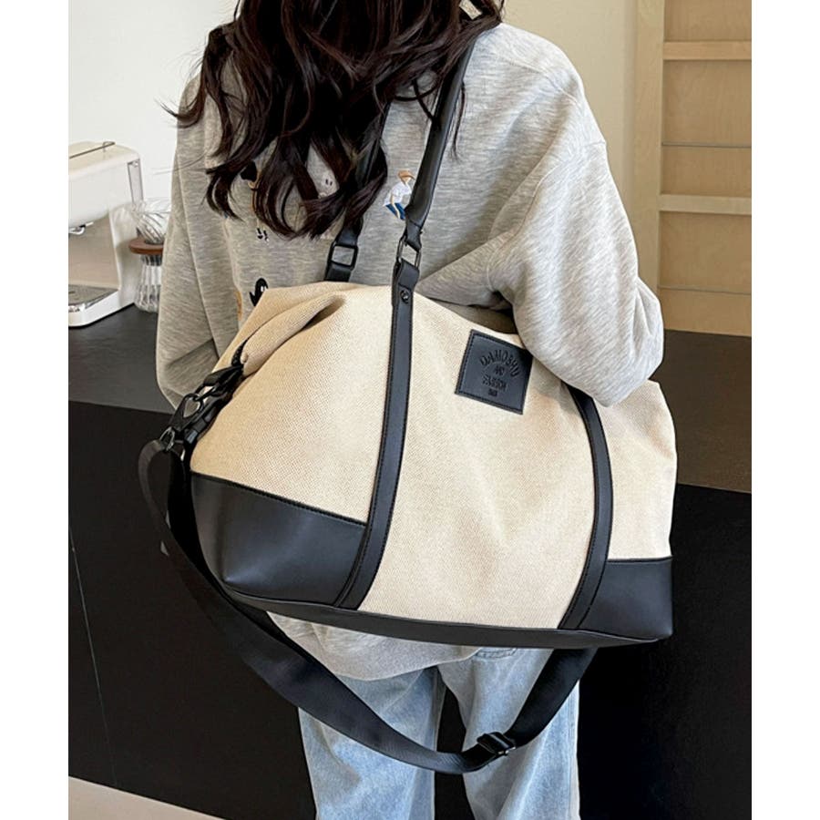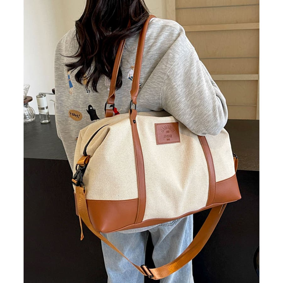 PUレザーライクハンドル×キャンバスボストンバッグ/旅行バッグ/ショルダーバッグ。