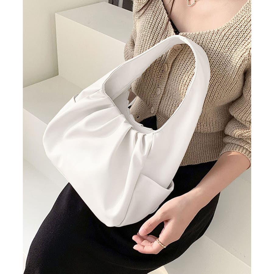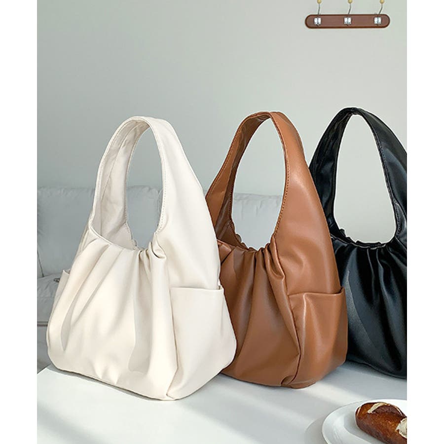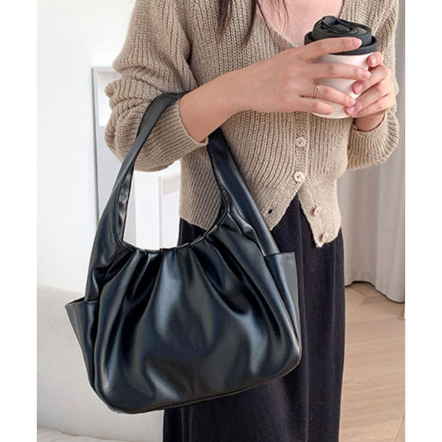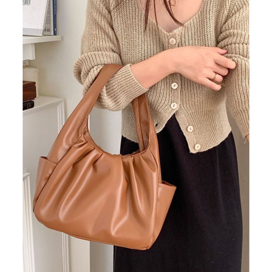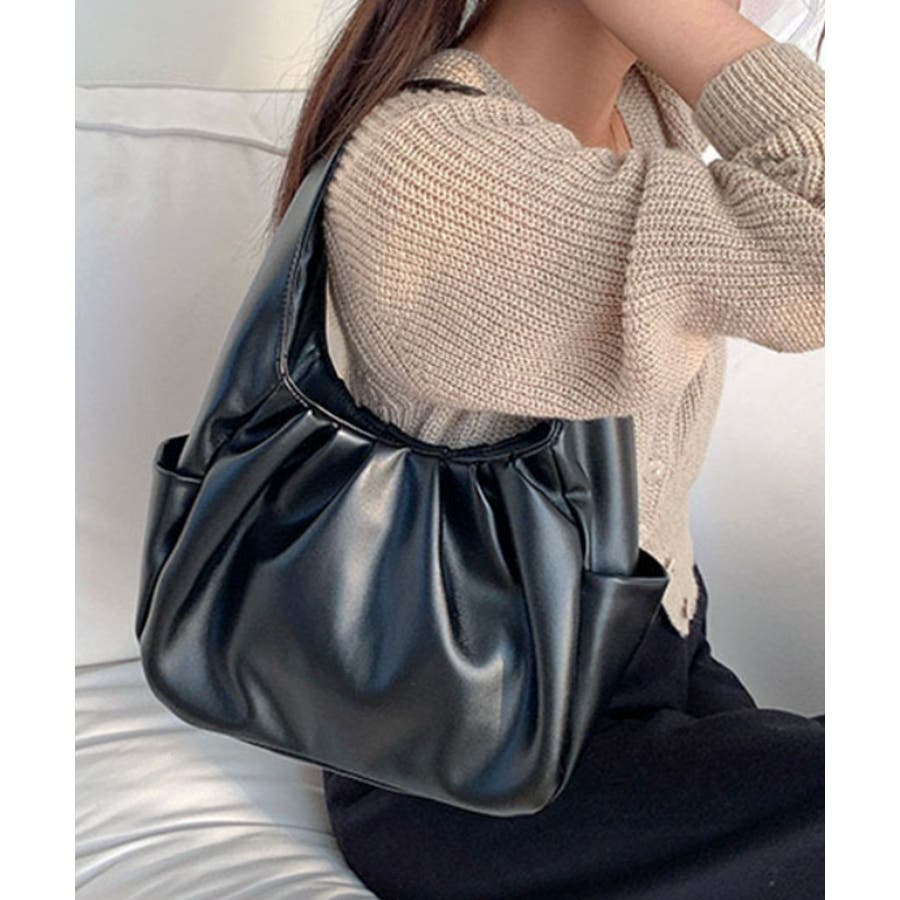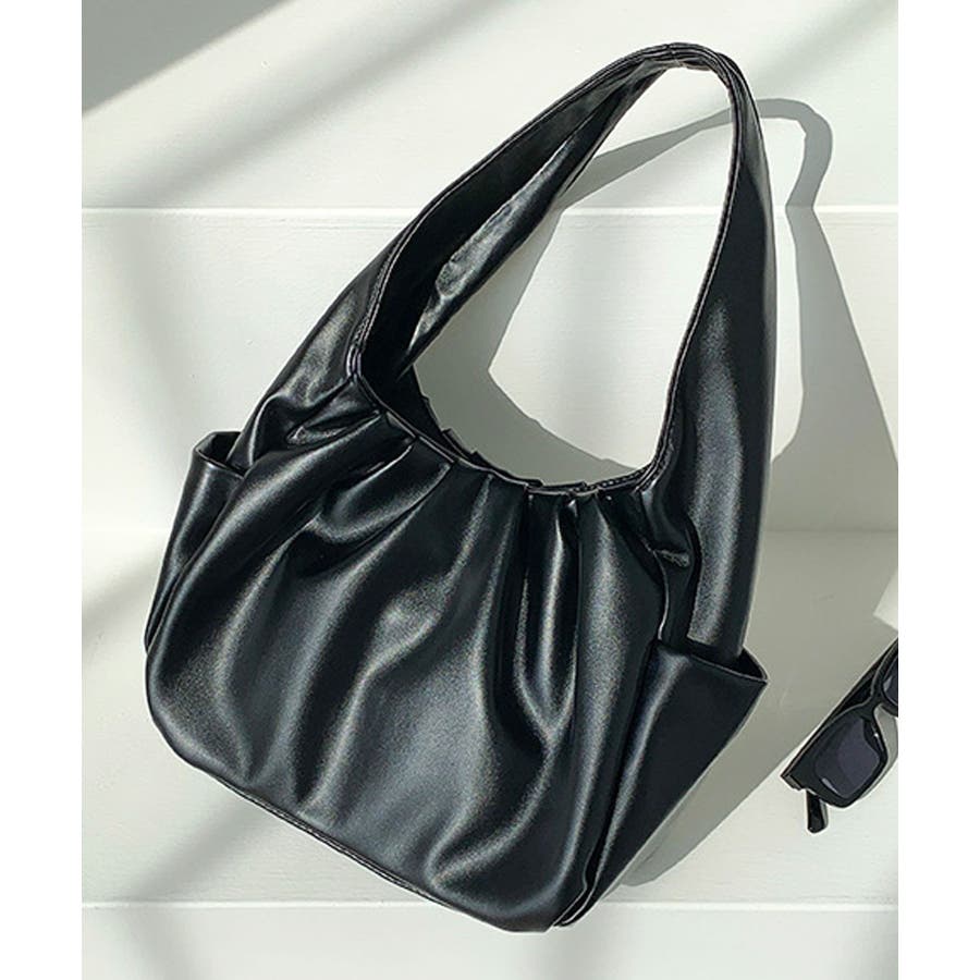 しっとりソフトなPUレザーを使用し、洗練されたギャザーアレンジが上品なハンドバッグ。