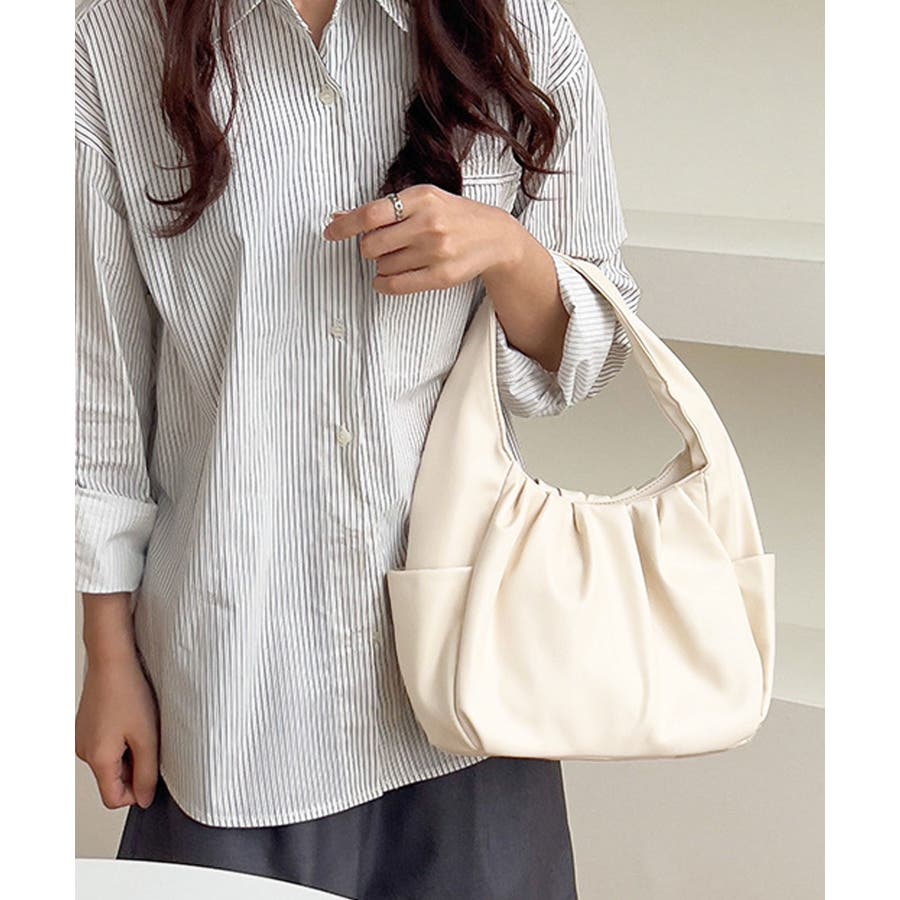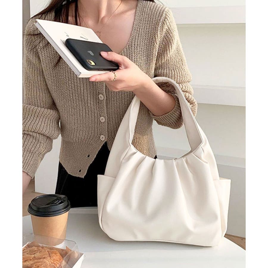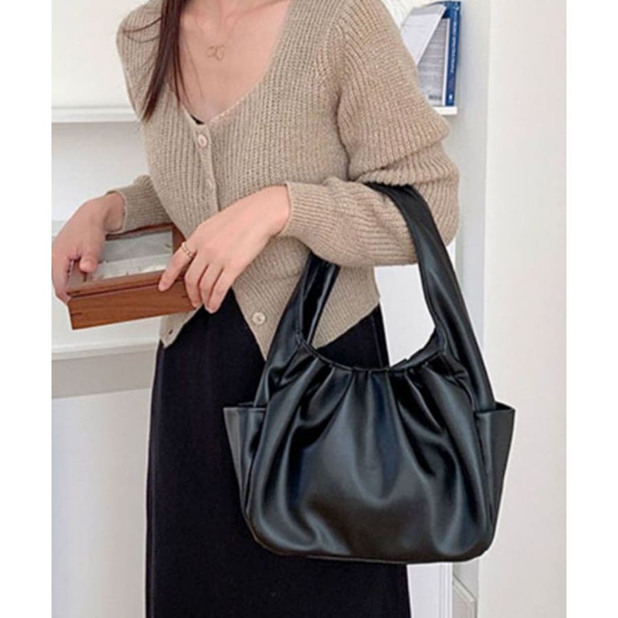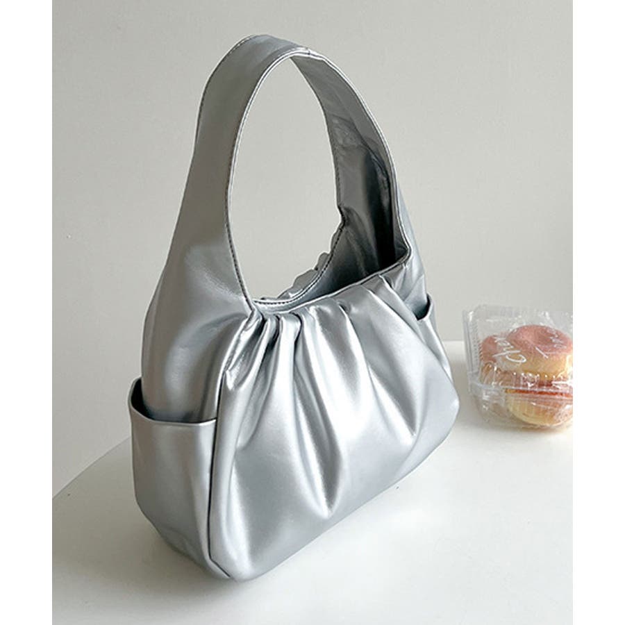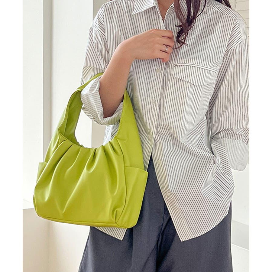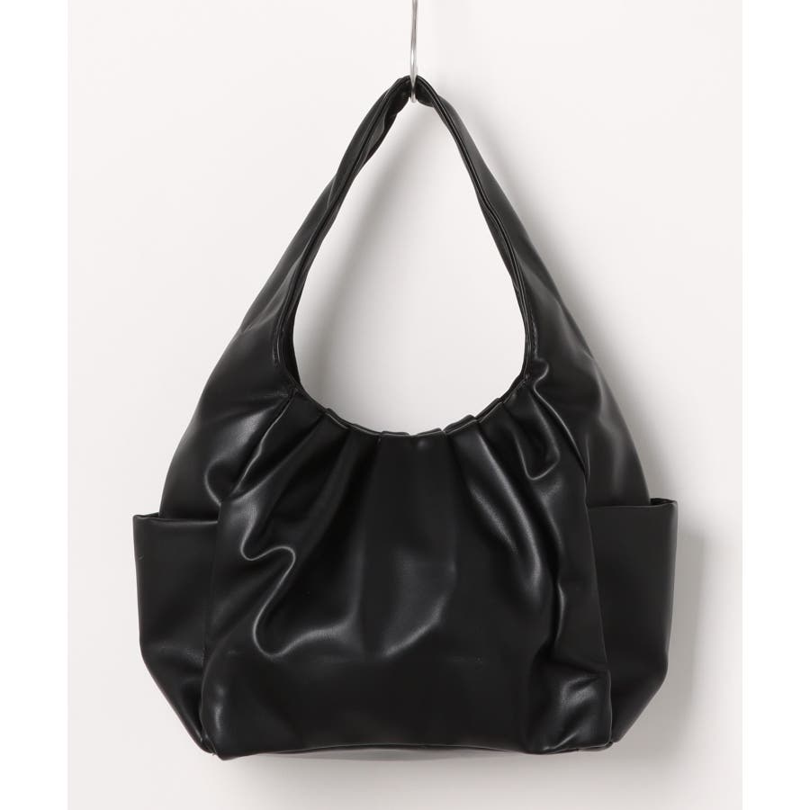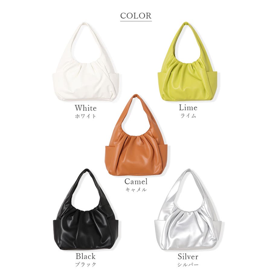 しっとりソフトなPUレザーを使用し、洗練されたギャザーアレンジが上品なハンドバッグ。