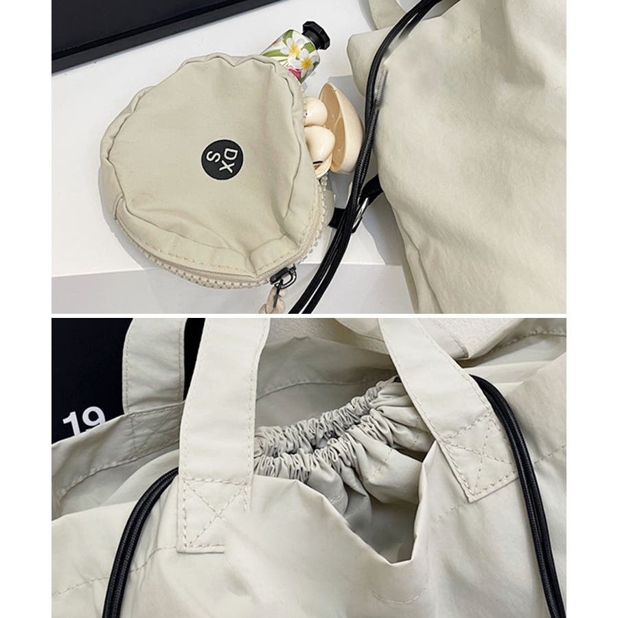 巾着式の開口クチは絞るとこなれ感のあるドロストフォルムに変化♪その日のスタイルに合わせて、2つのバッグフォルムの使い分けが可能です。