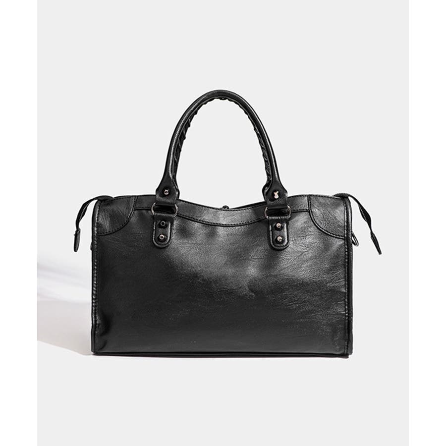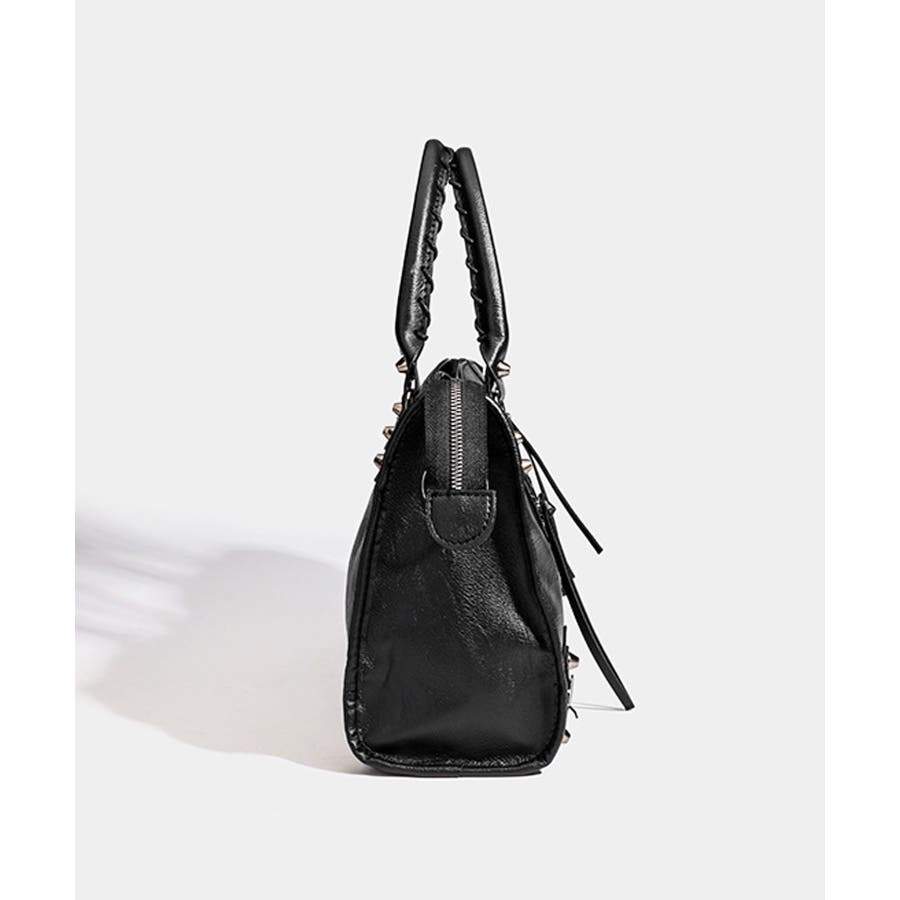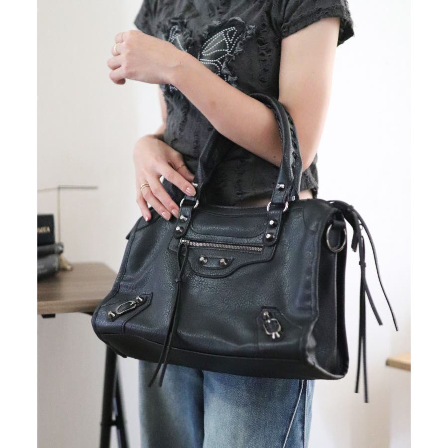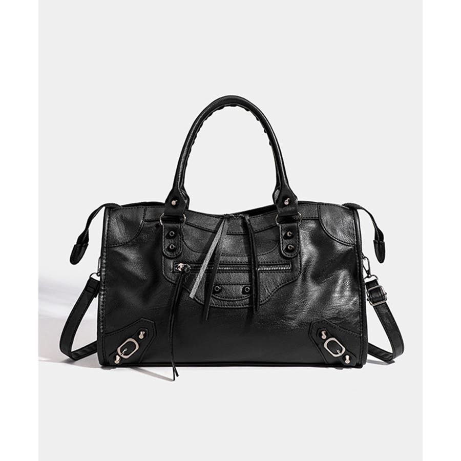 ハードな印象のサンカクスタッズにベルトデザインを組み合わせた、トレンドライクな韓国Y2Kデザインのボストンバッグ。