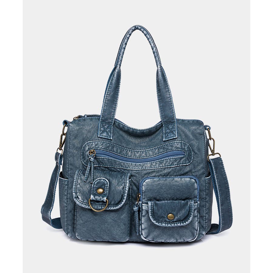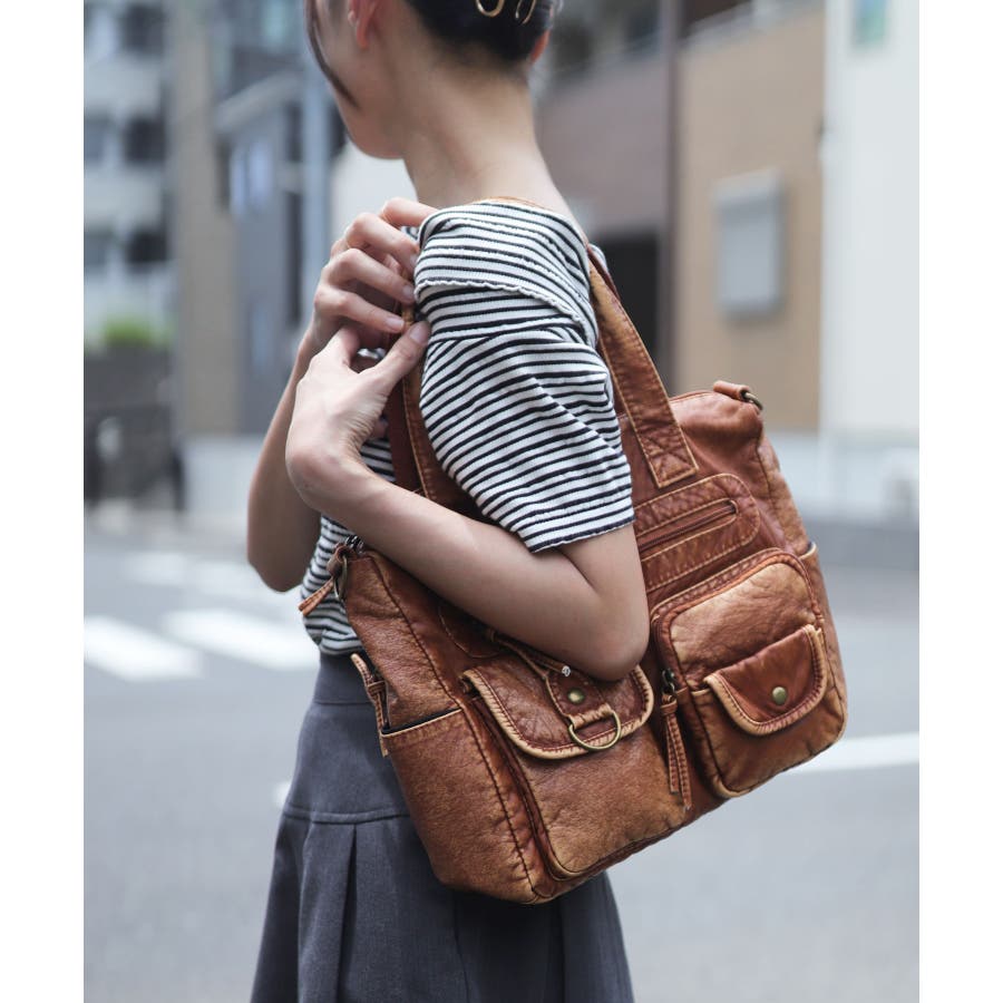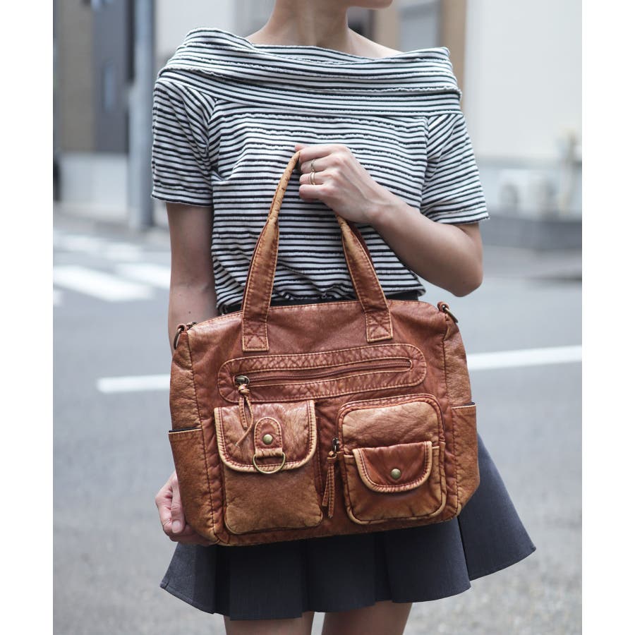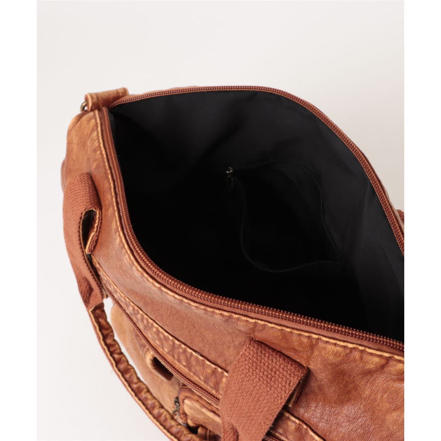 ヴィンテージ調PUレザーマルチポケットボストンバッグ/ハンドバッグ/ショルダーバッグ。