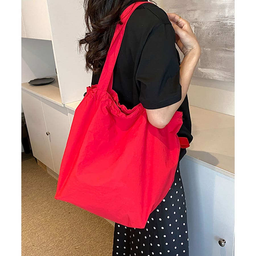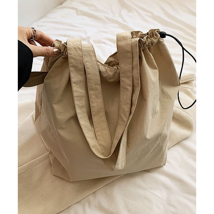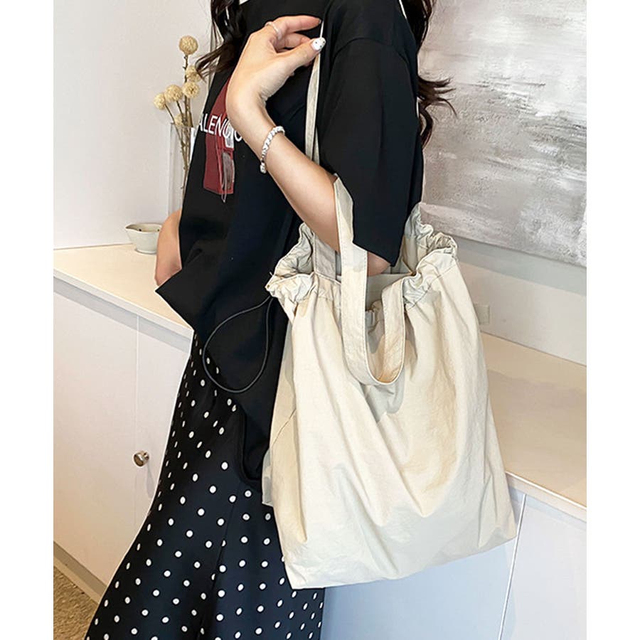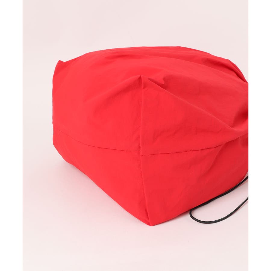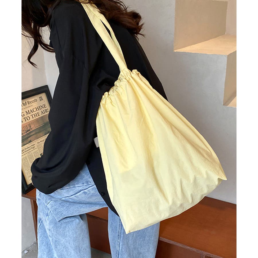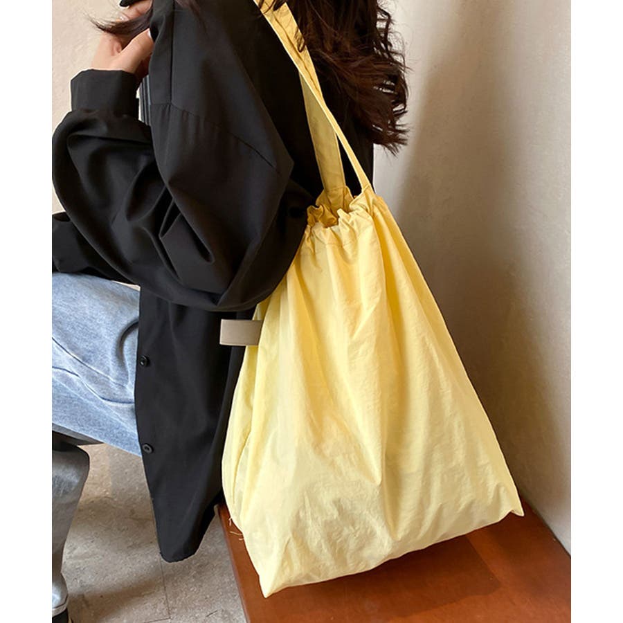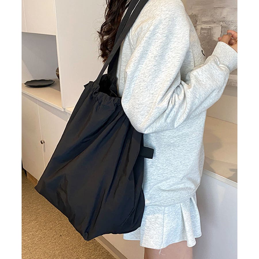 シャリ感のあるナイロンを使用し、ギャザーを寄せることでふんわりフォルムに変化するおしゃれなトートバッグに。