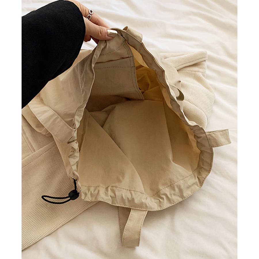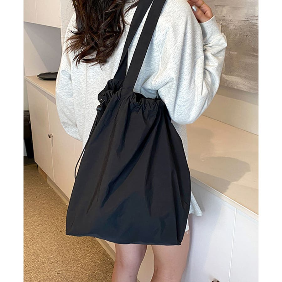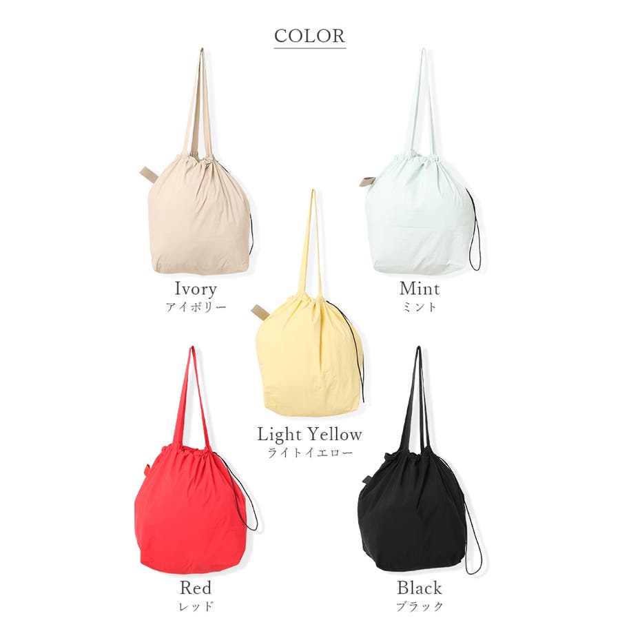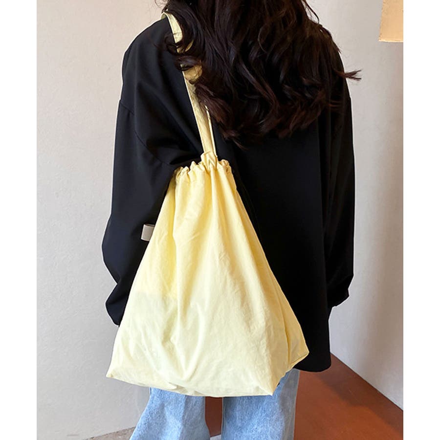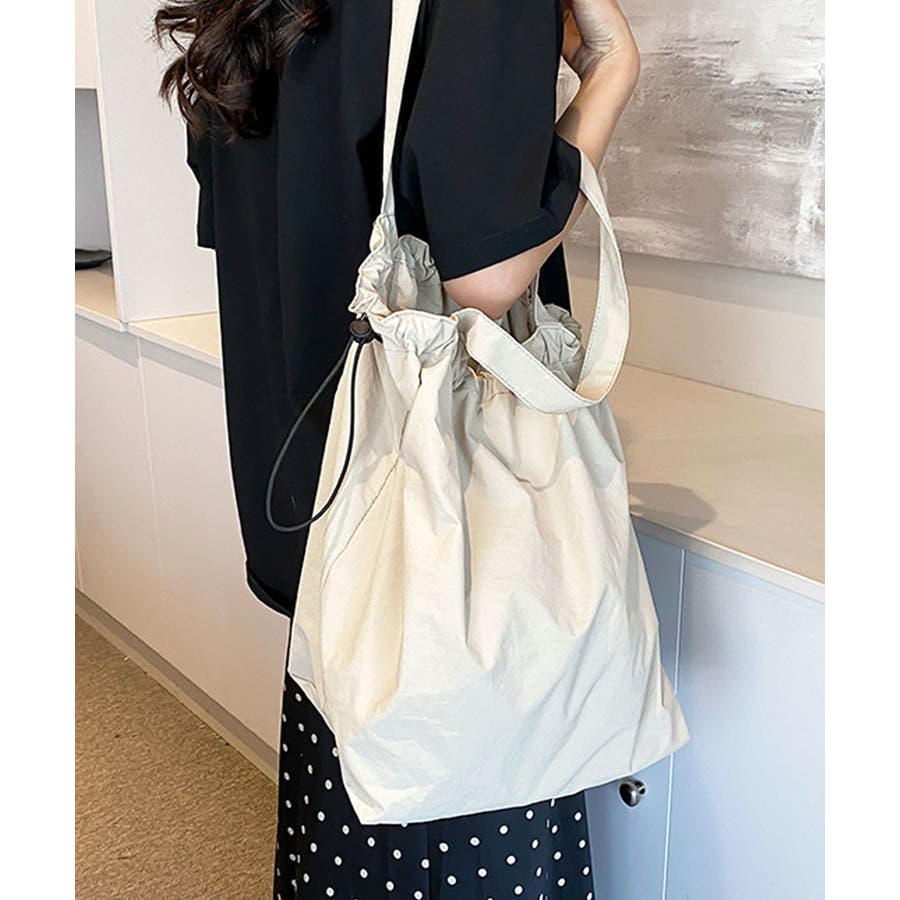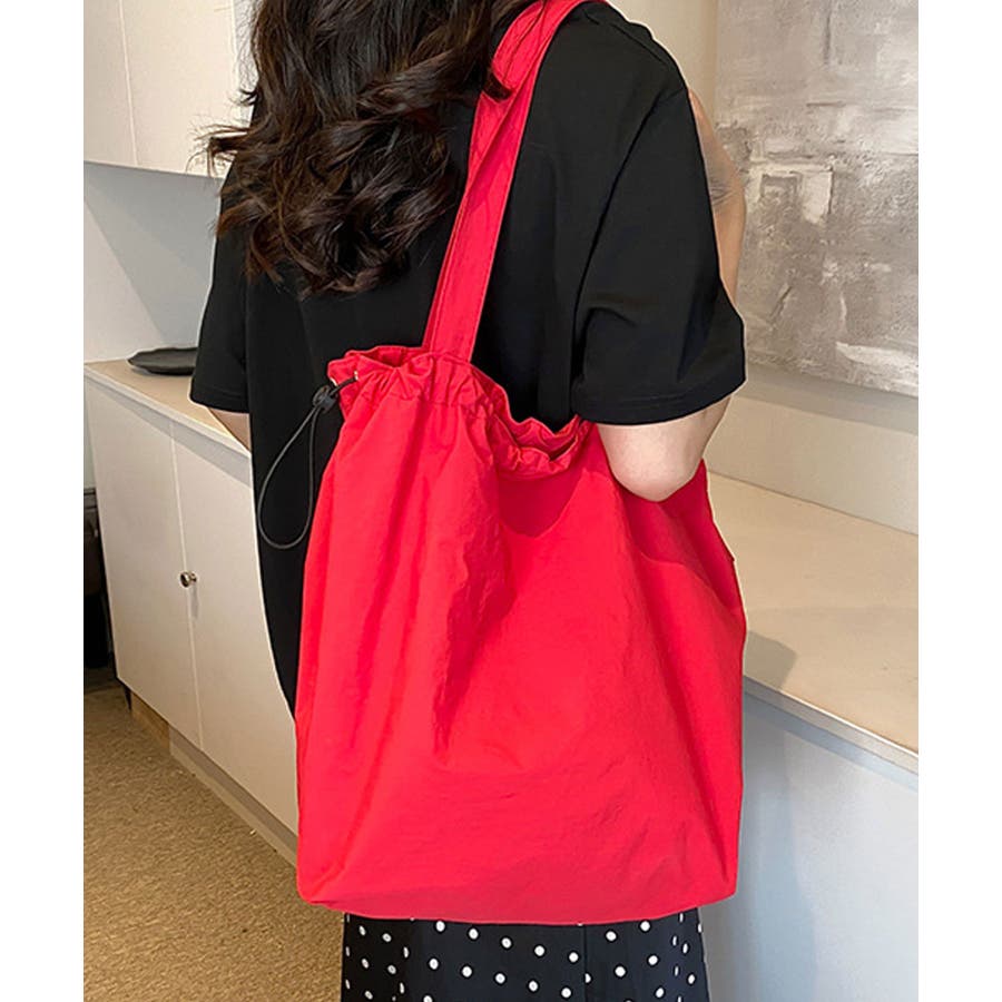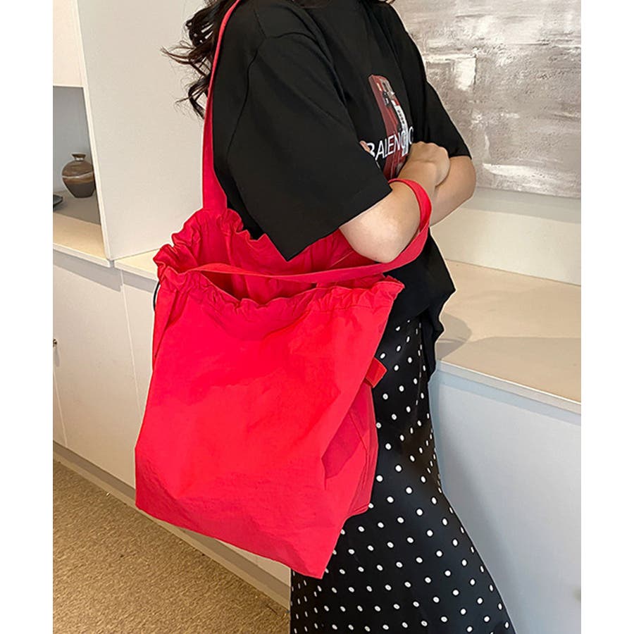 シャリ感のあるナイロンを使用し、ギャザーを寄せることでふんわりフォルムに変化するおしゃれなトートバッグに。