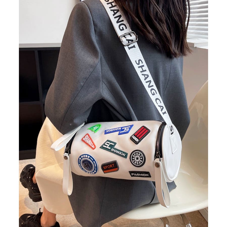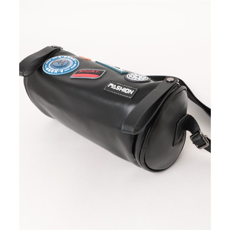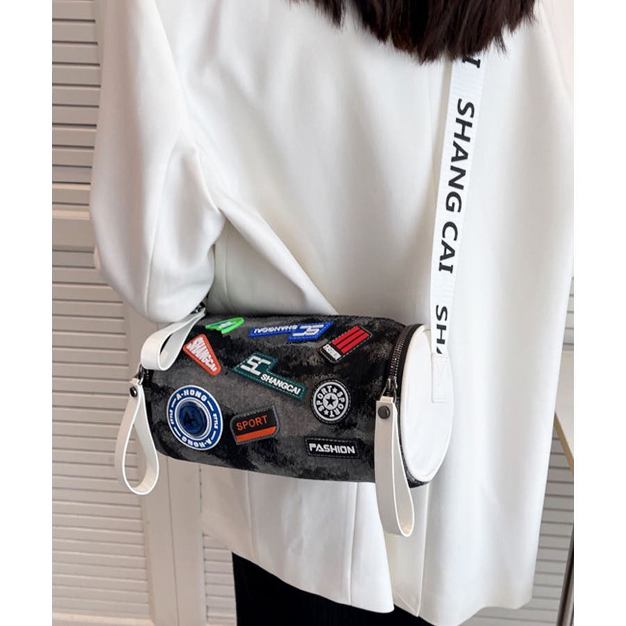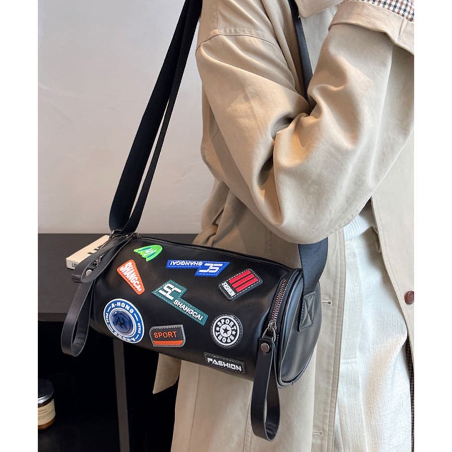 特徴的な樽型フォルムにカラフルなラバーワッペンをランダムに貼った個性的なデザインのショルダーバッグ◎