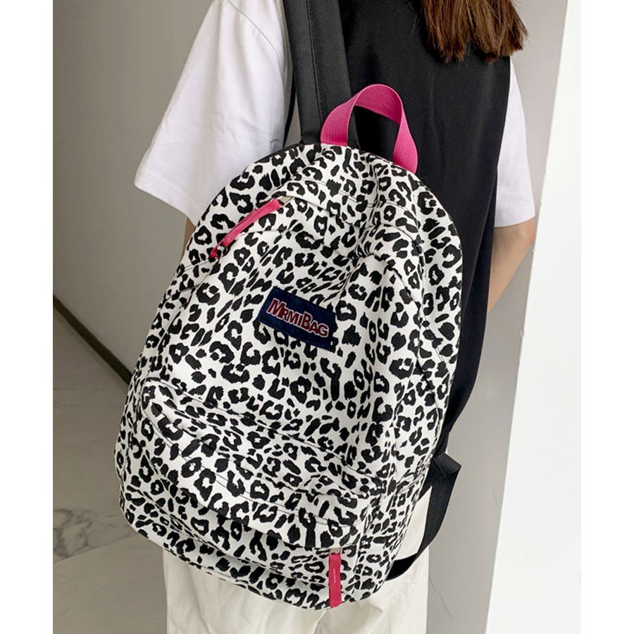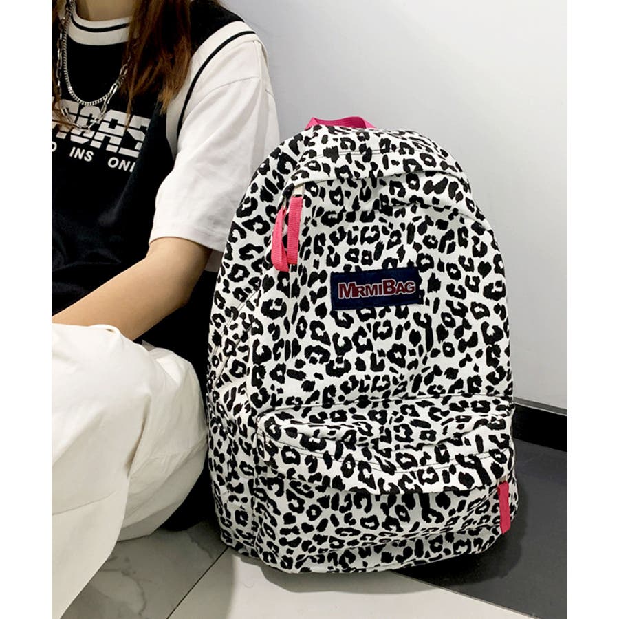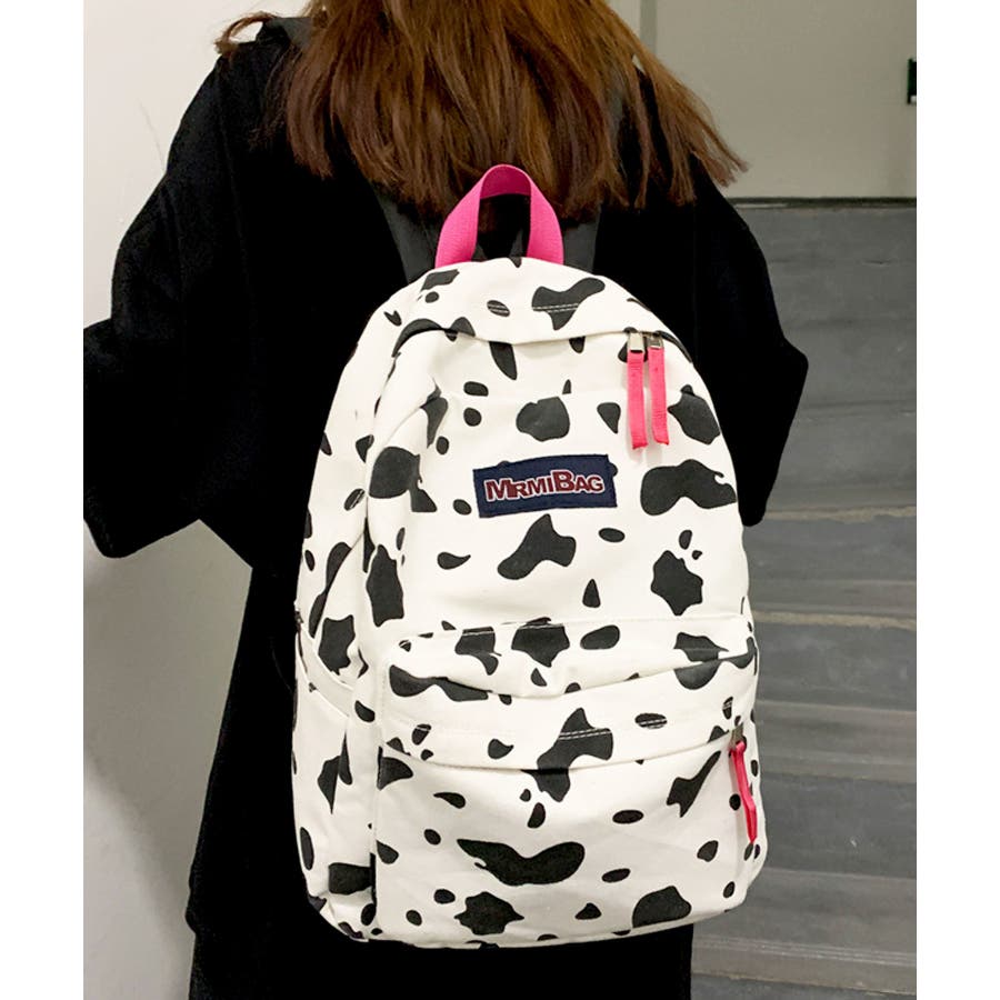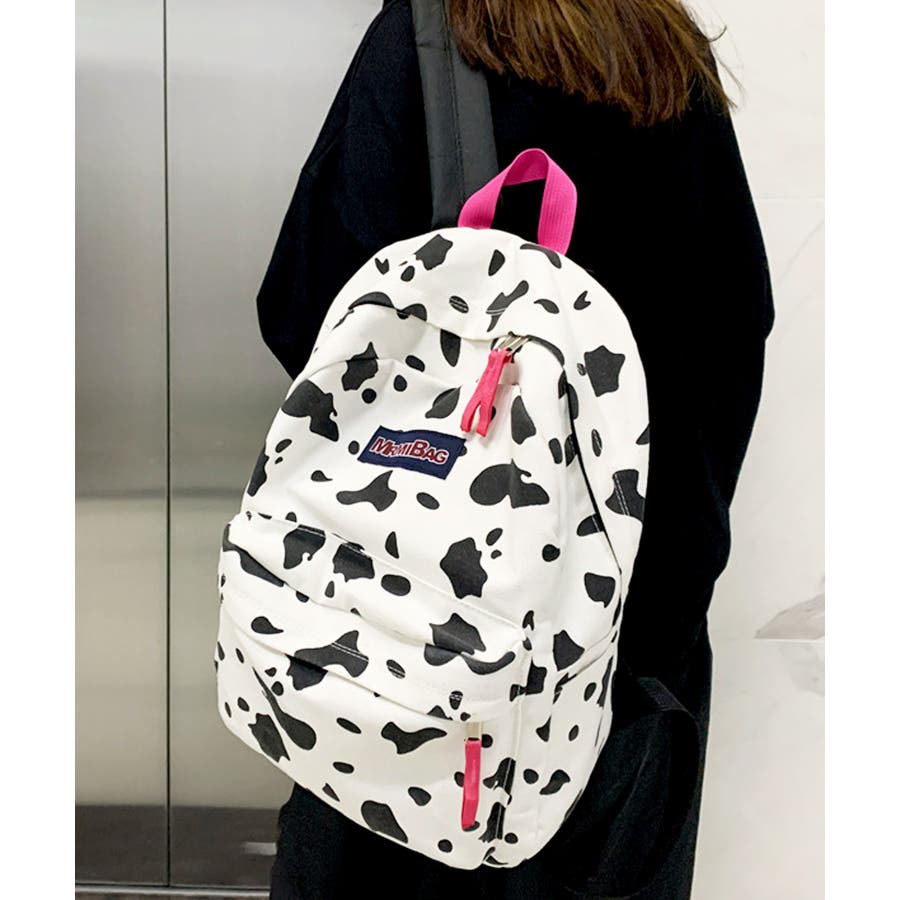 ホワイトをベースにヒョウ柄とウシ柄をブラックでプリントした、個性的な派手めデザインリュック◎