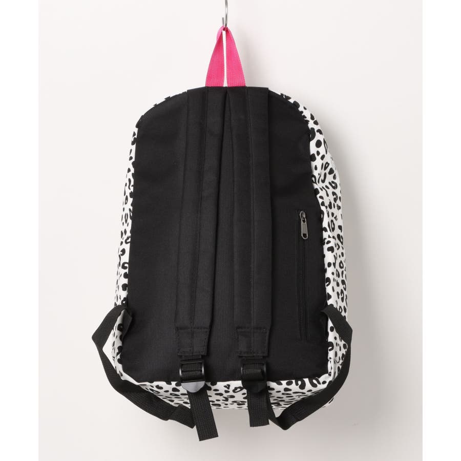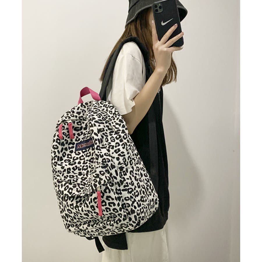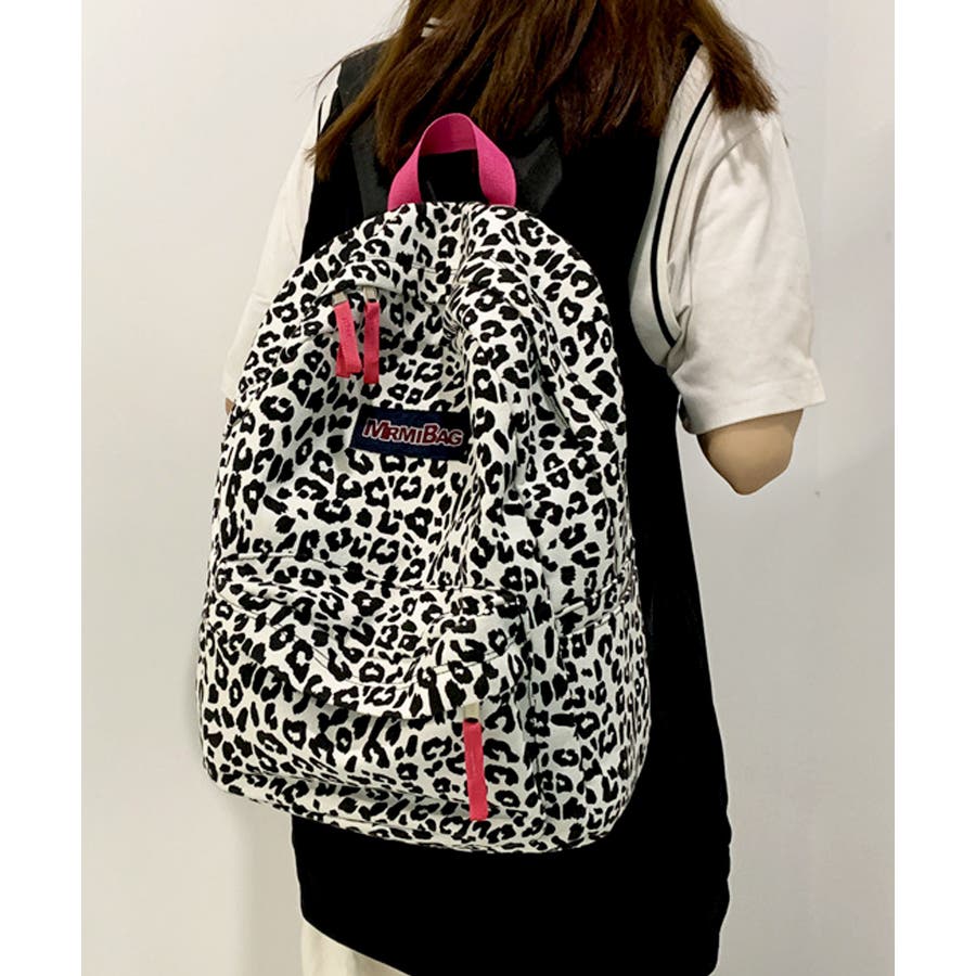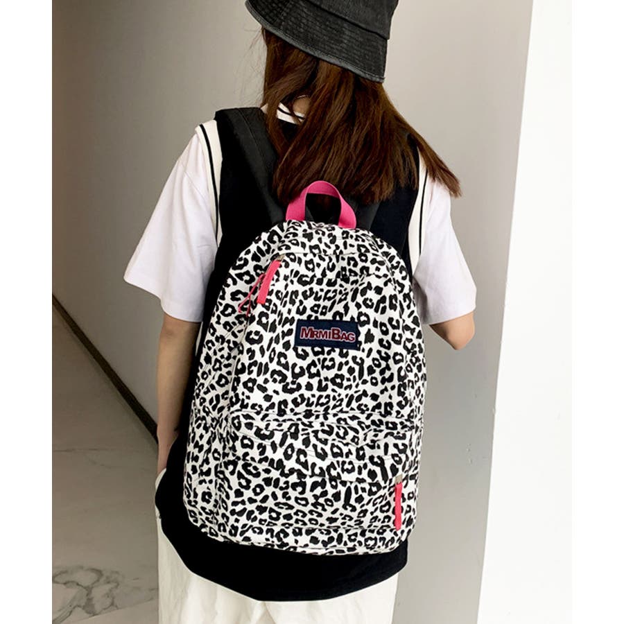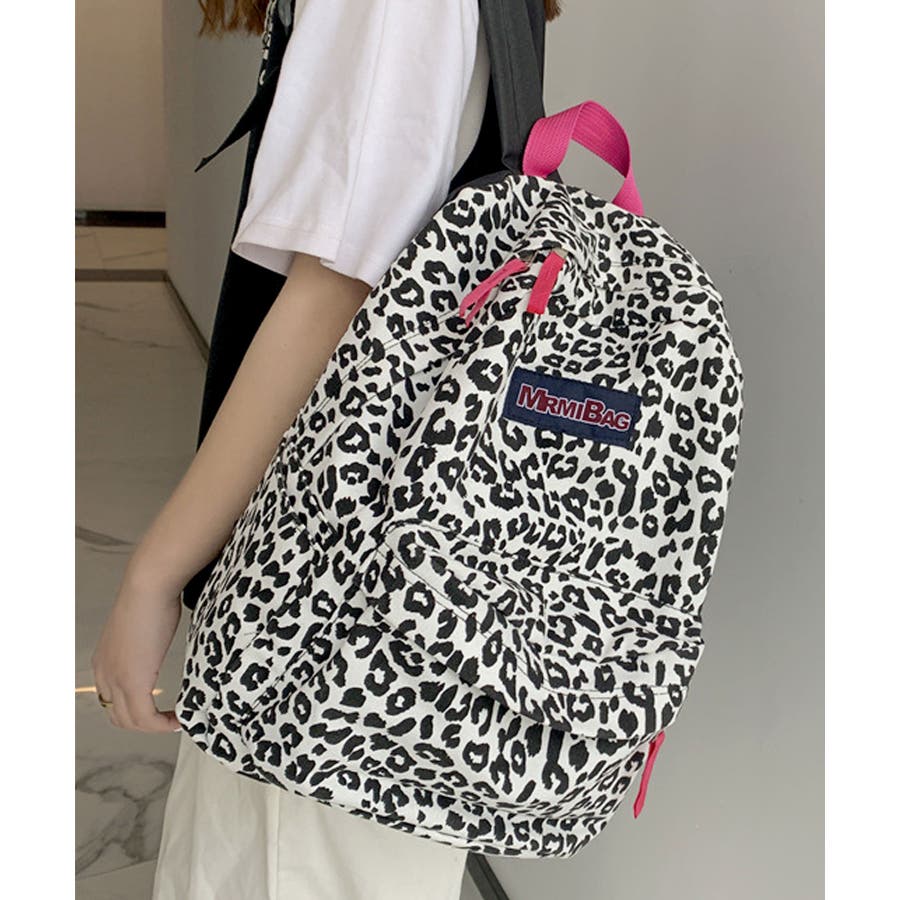 ホワイトをベースにヒョウ柄とウシ柄をブラックでプリントした、個性的な派手めデザインリュック◎