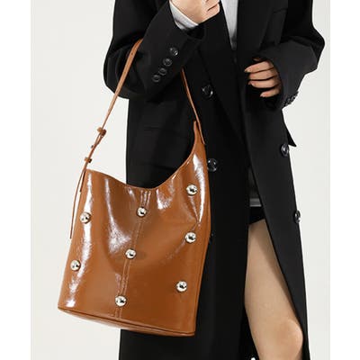 エナメルのような艶感のあるPUレザーに、ビッグサイズのボールスタッズをあしらった大人かわいいトートバッグ♪