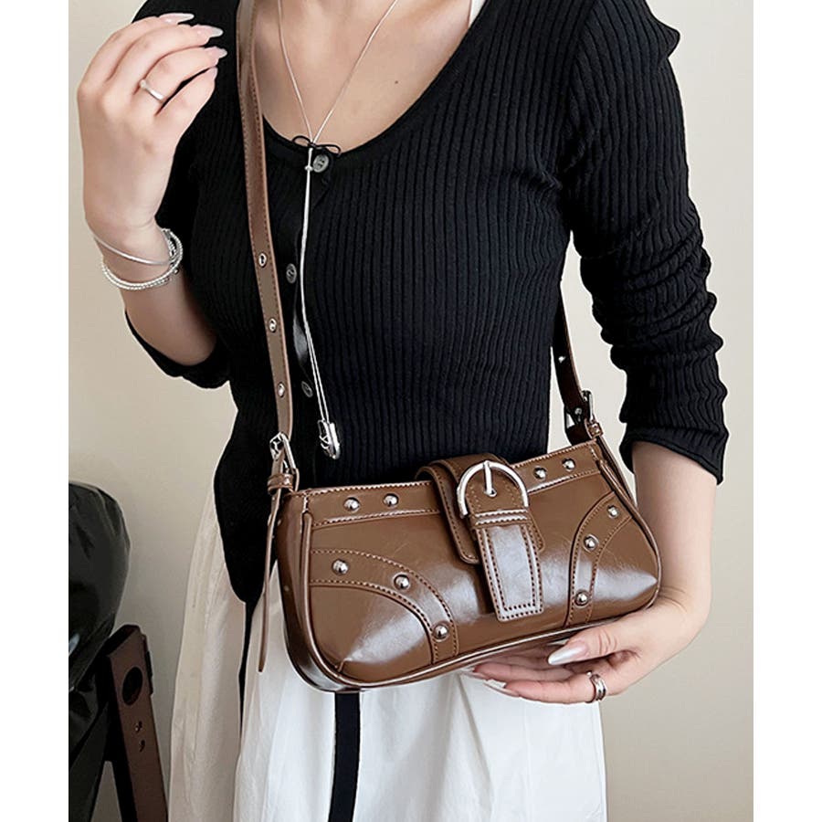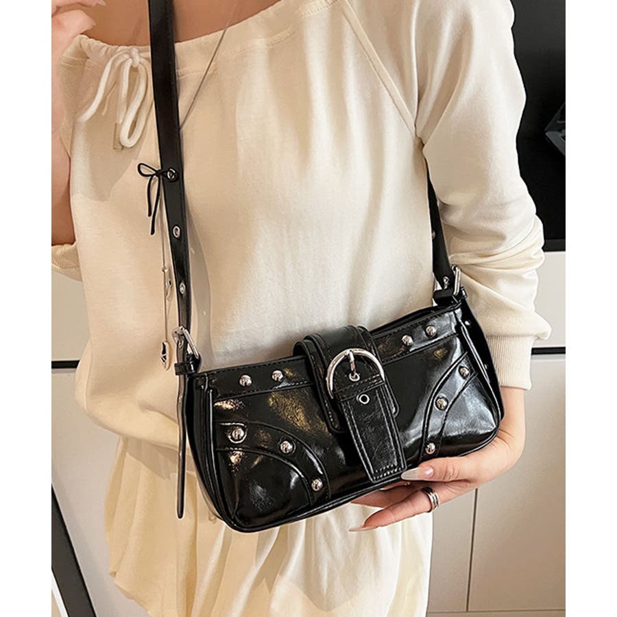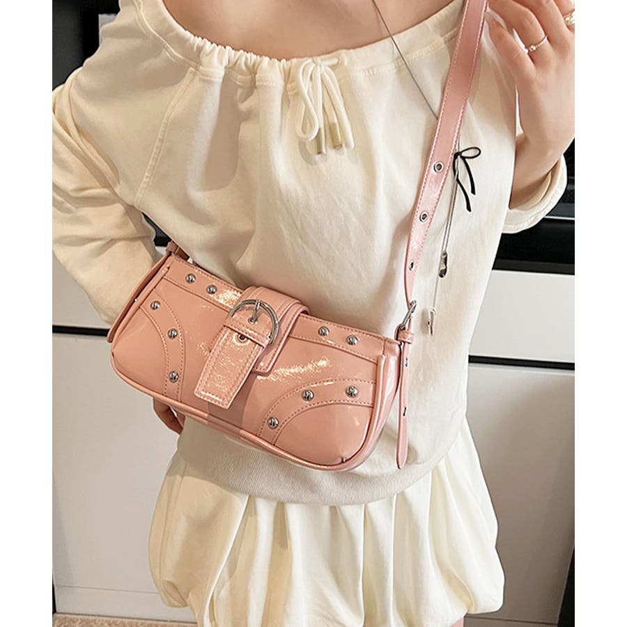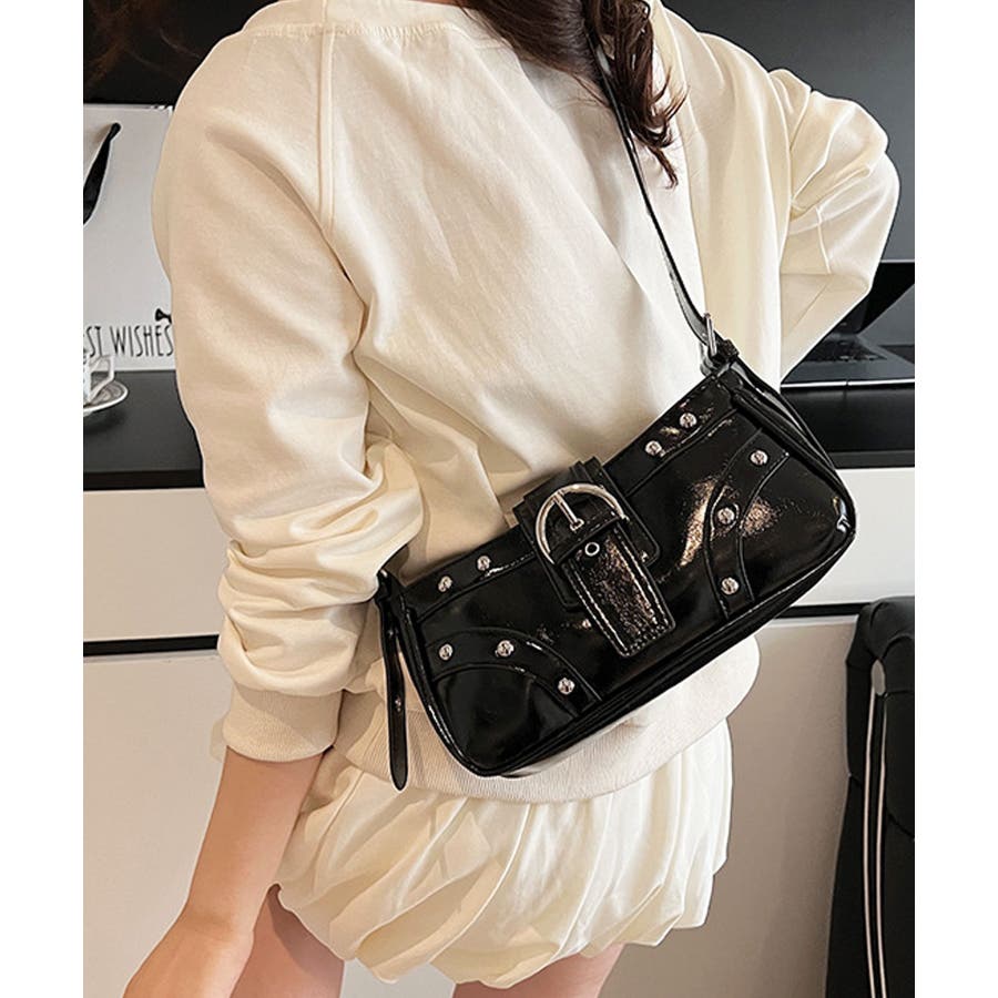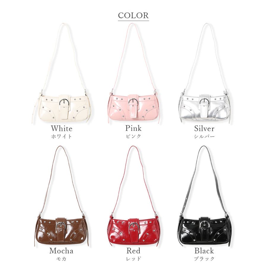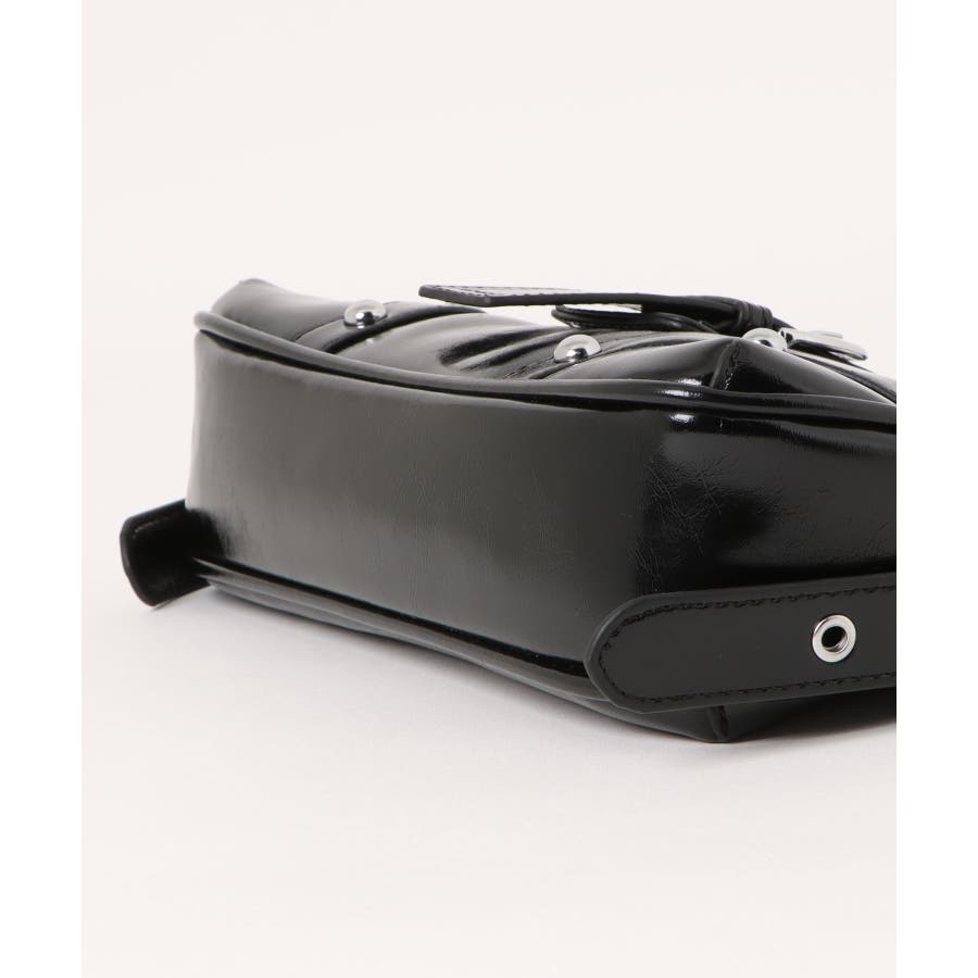 艶感が美しいエナメル調PUレザーに、強めシルバースタッズ&ベルトパーツをあしらった甘辛MIXデザインのショルダーバッグ。
