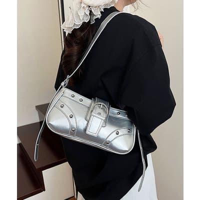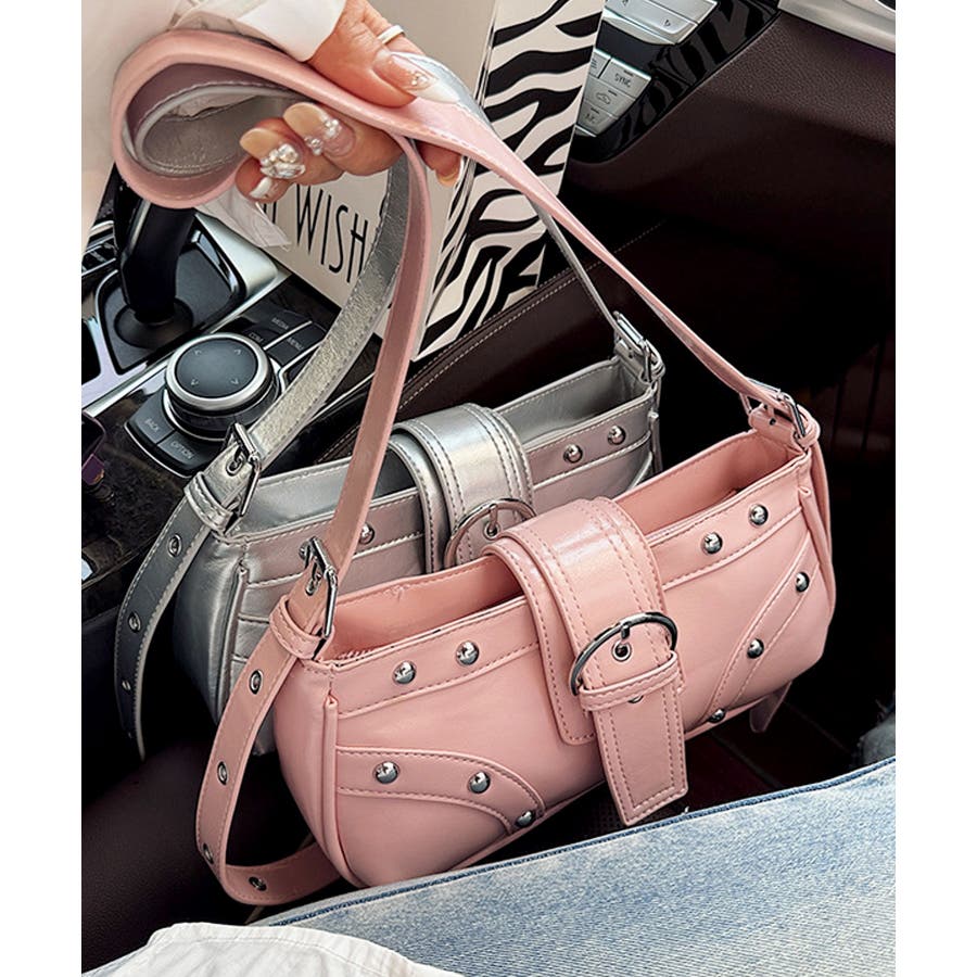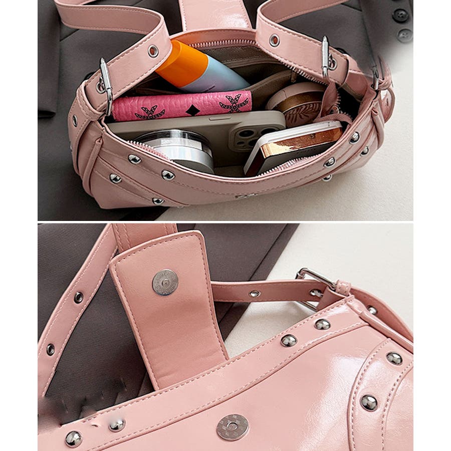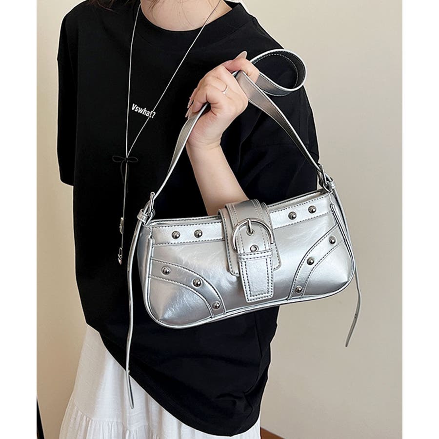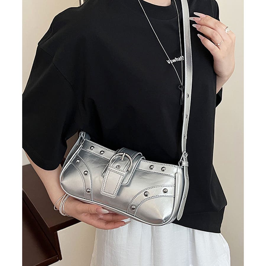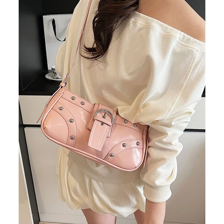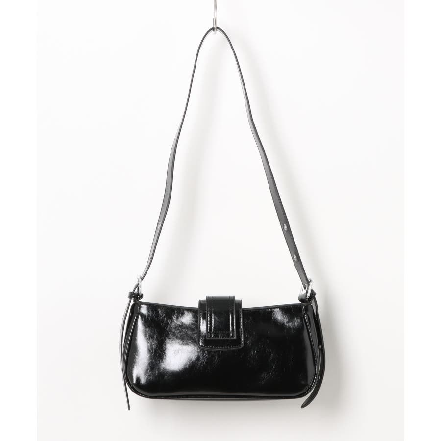艶感が美しいエナメル調PUレザーに、強めシルバースタッズ&ベルトパーツをあしらった甘辛MIXデザインのショルダーバッグ。
