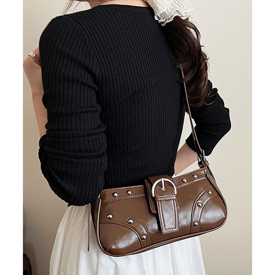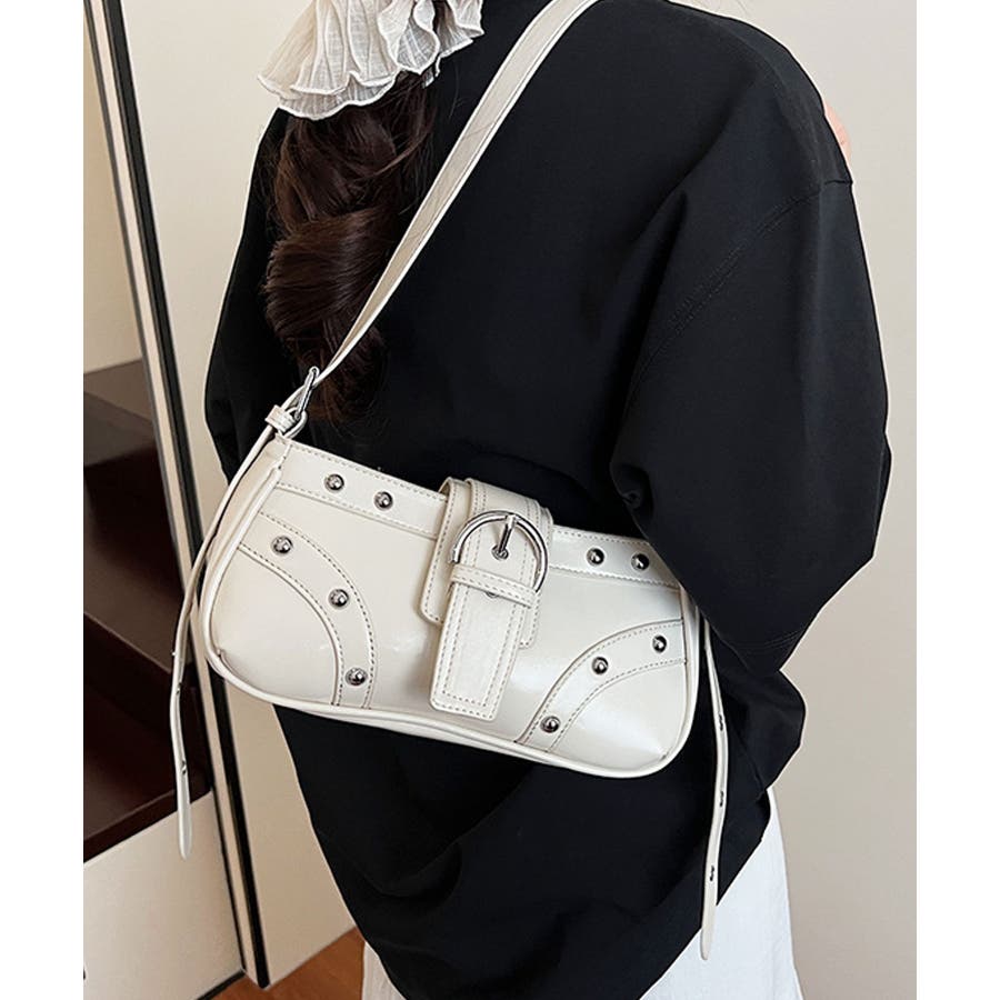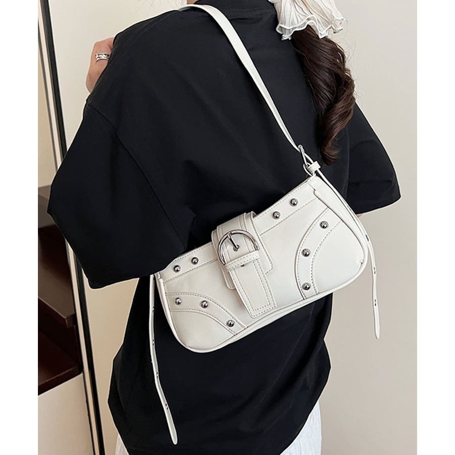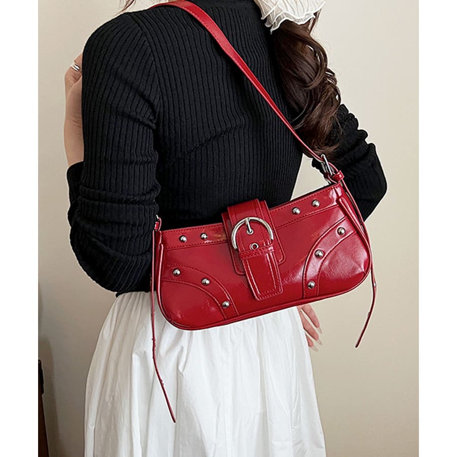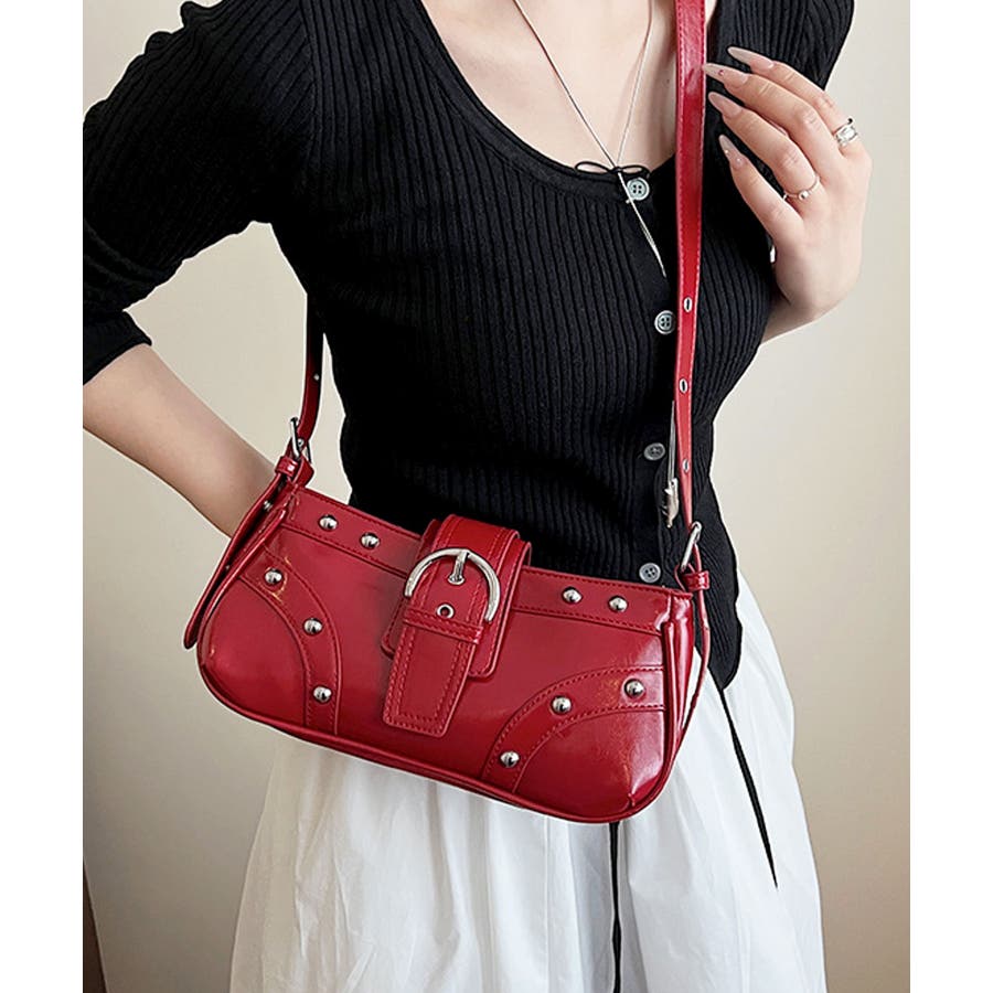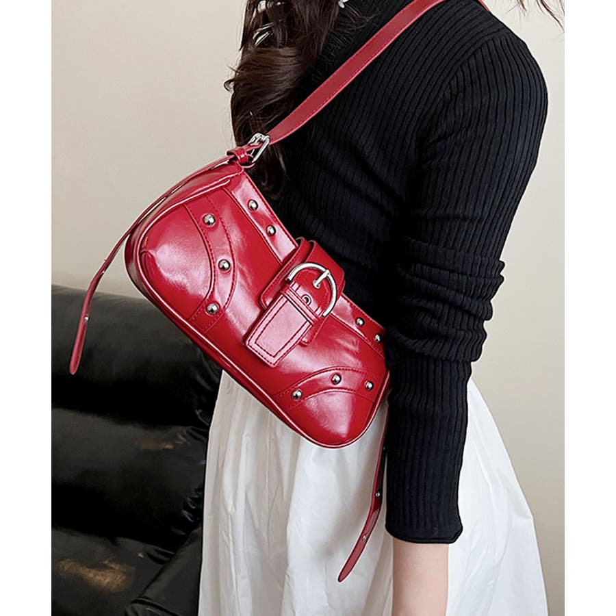 艶感が美しいエナメル調PUレザーに、強めシルバースタッズ&ベルトパーツをあしらった甘辛MIXデザインのショルダーバッグ。