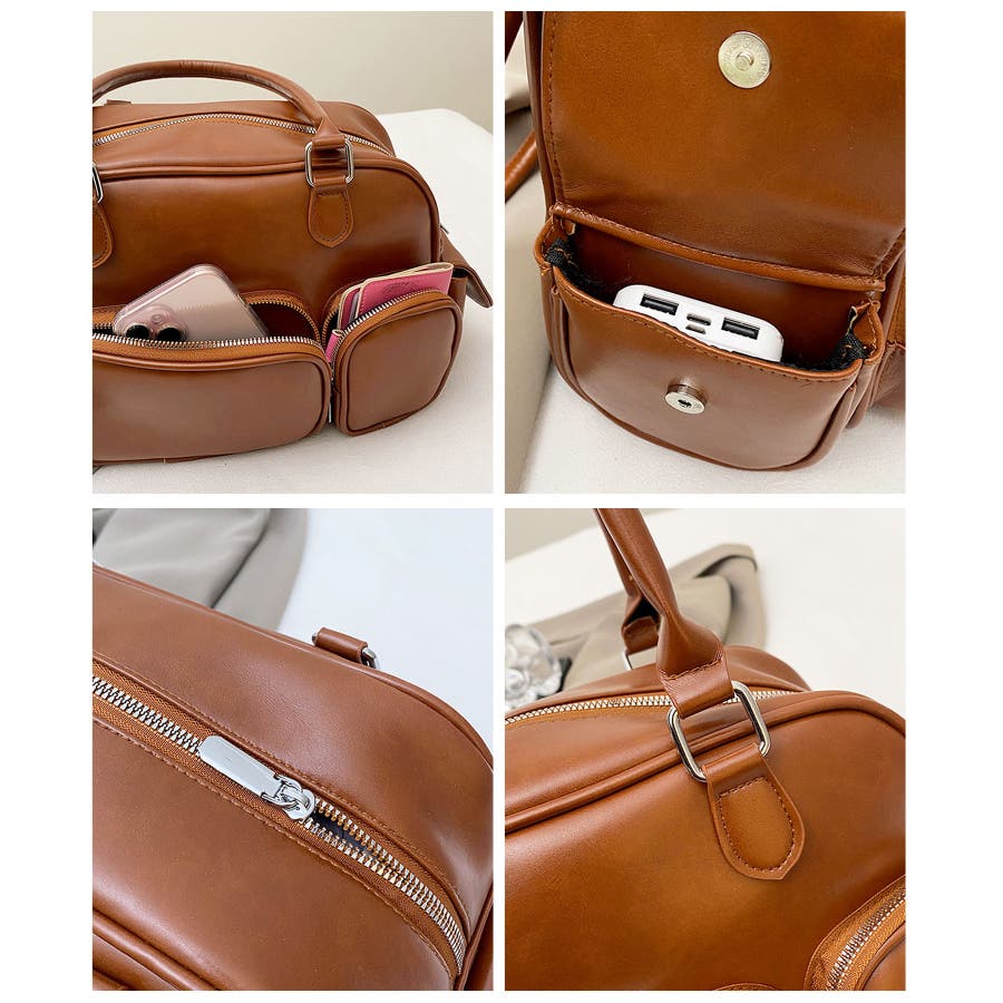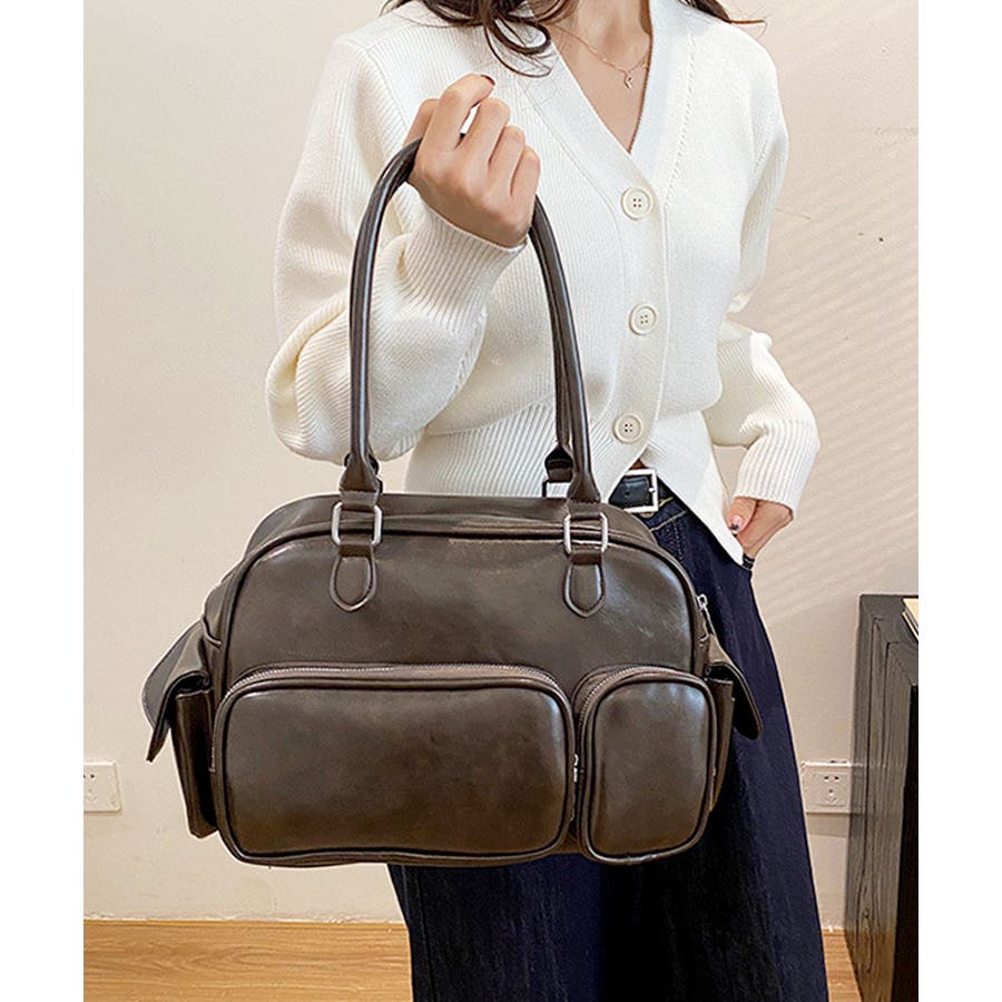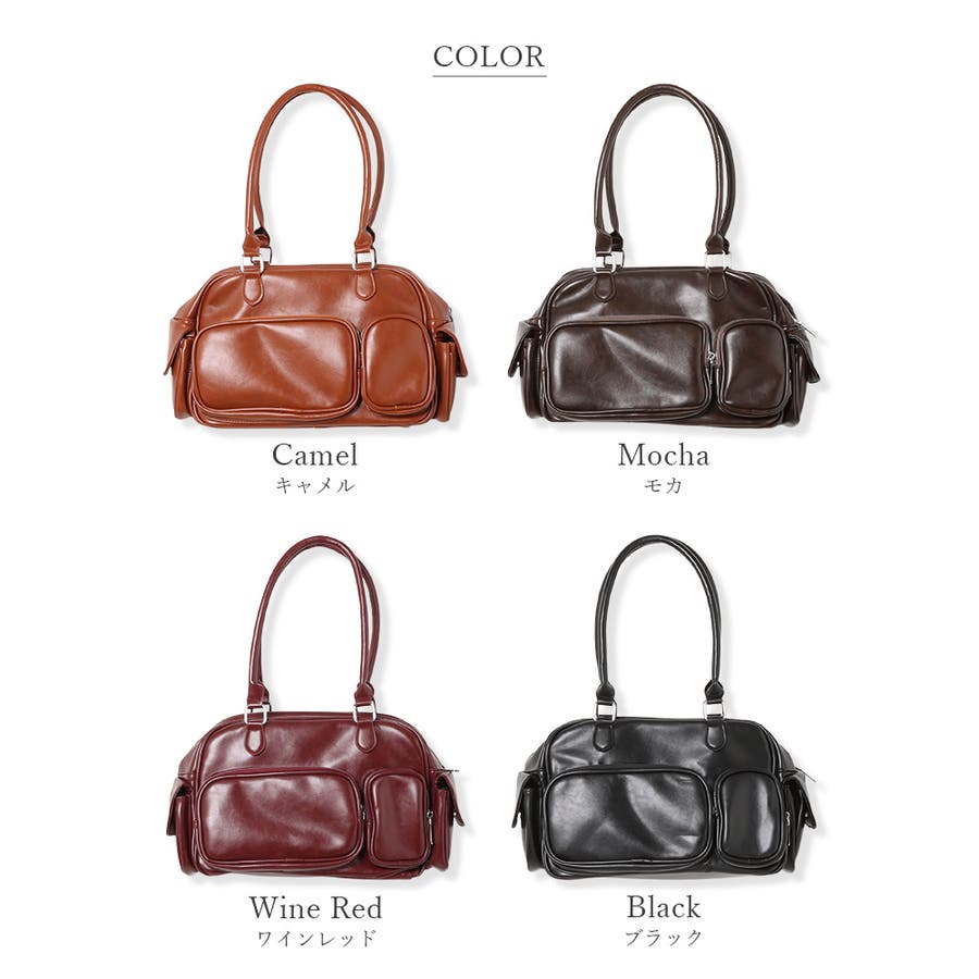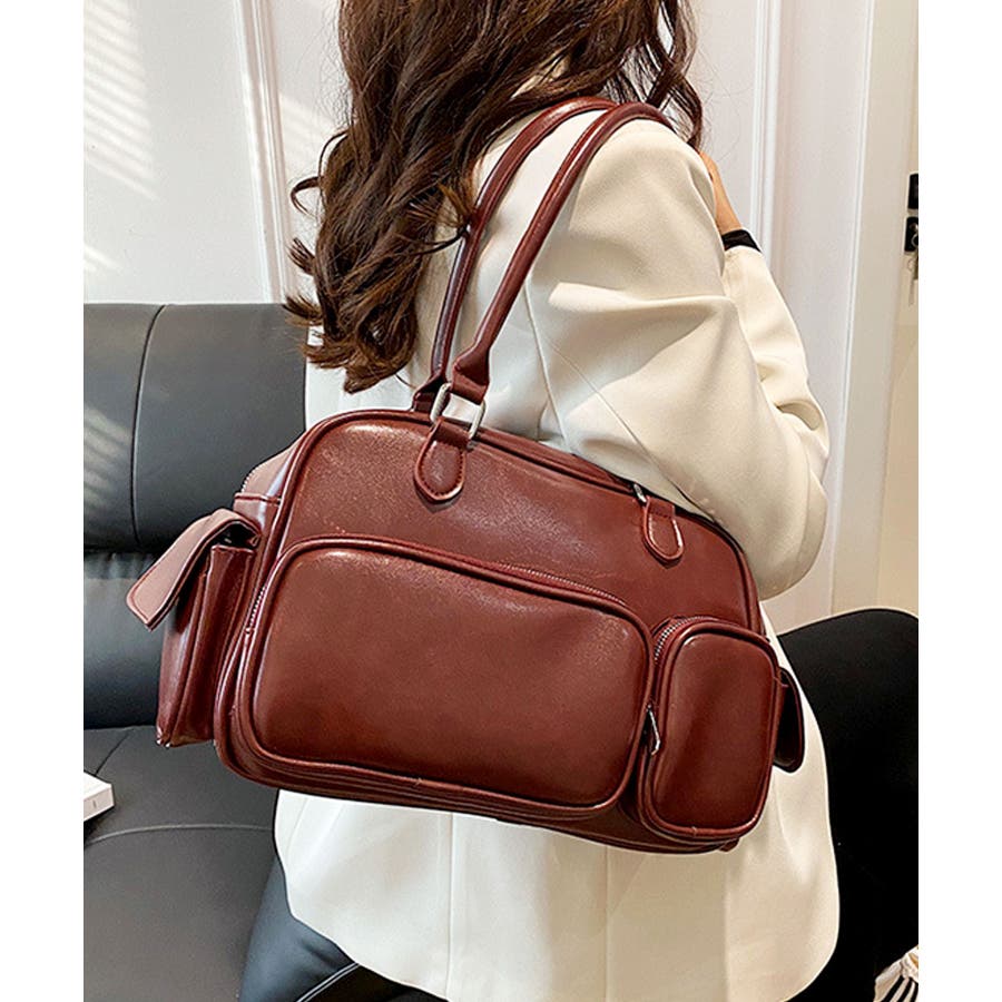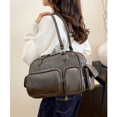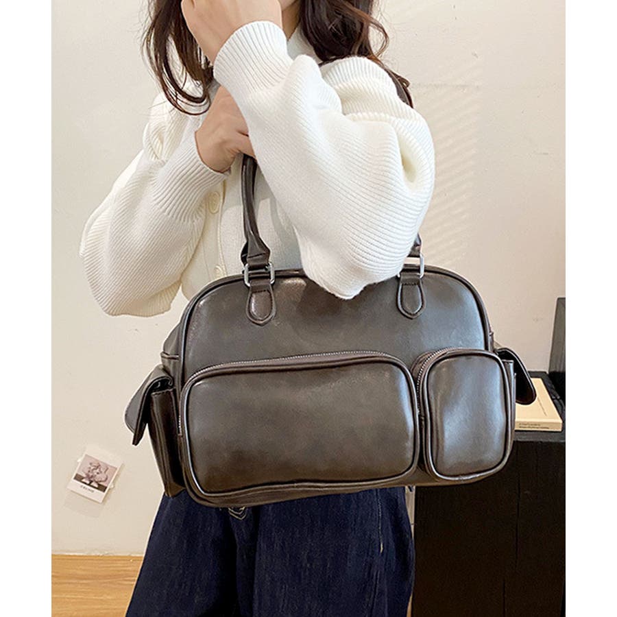 しっとりとした肌触りのPUレザーに、様々なサイズのポケットをあしらった大人かわいいトレンドルックのボストンバッグ。