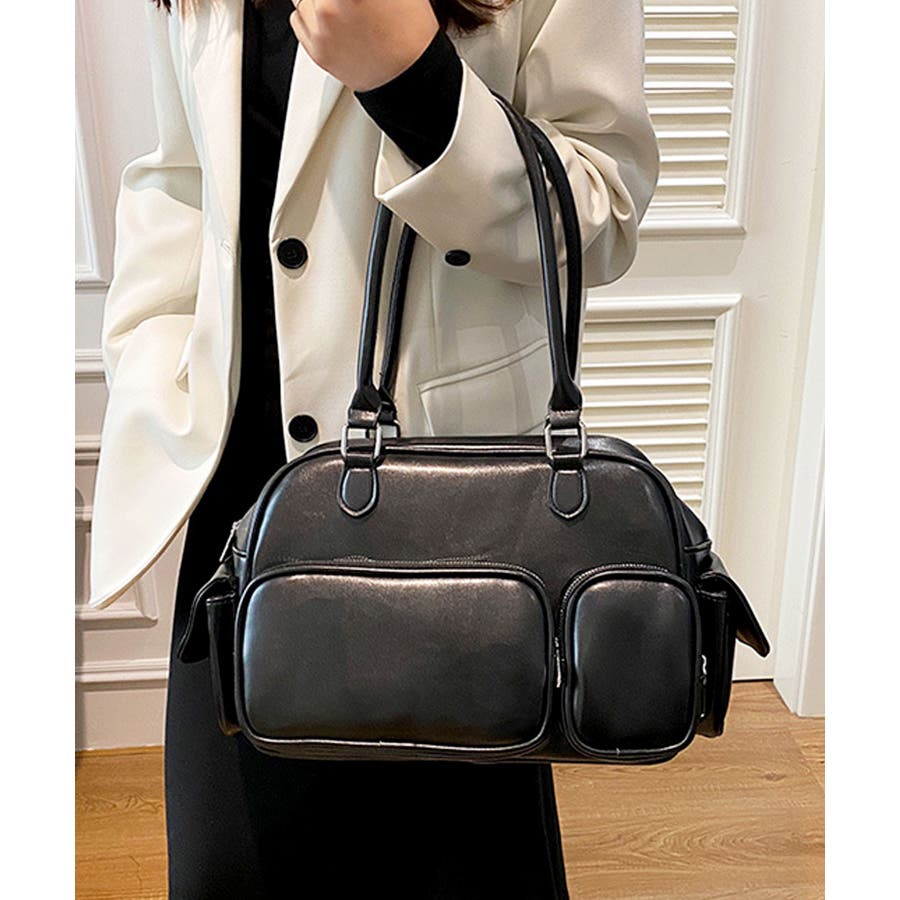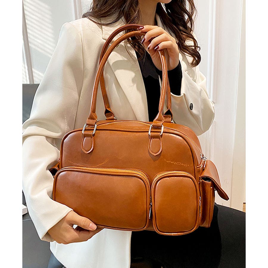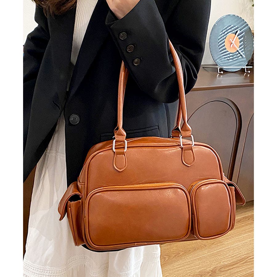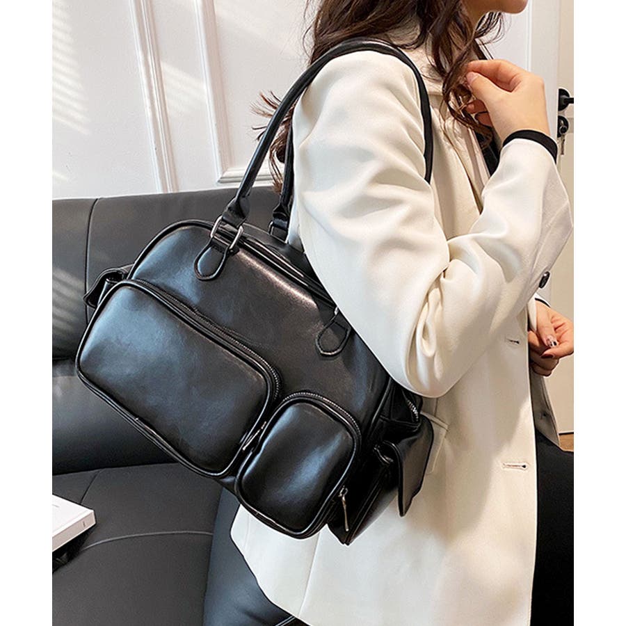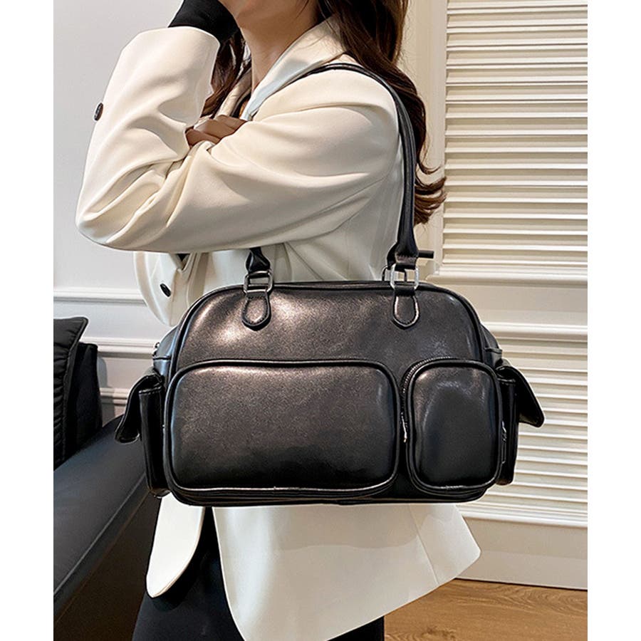 PUレザーライクポケットデザインボストンバッグ/ハンドバッグ/旅行バッグ。