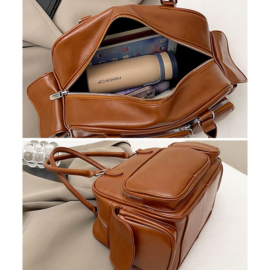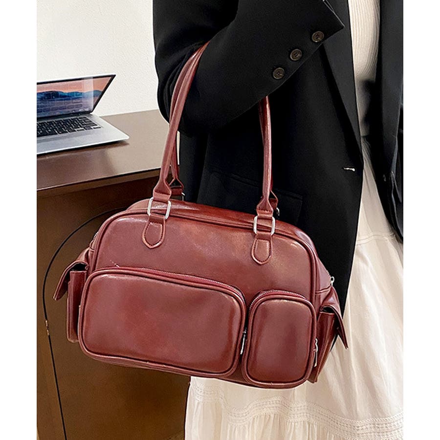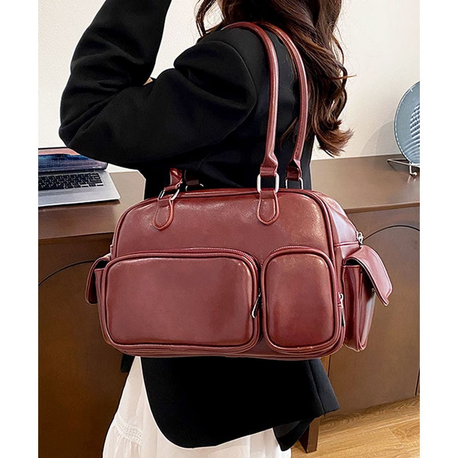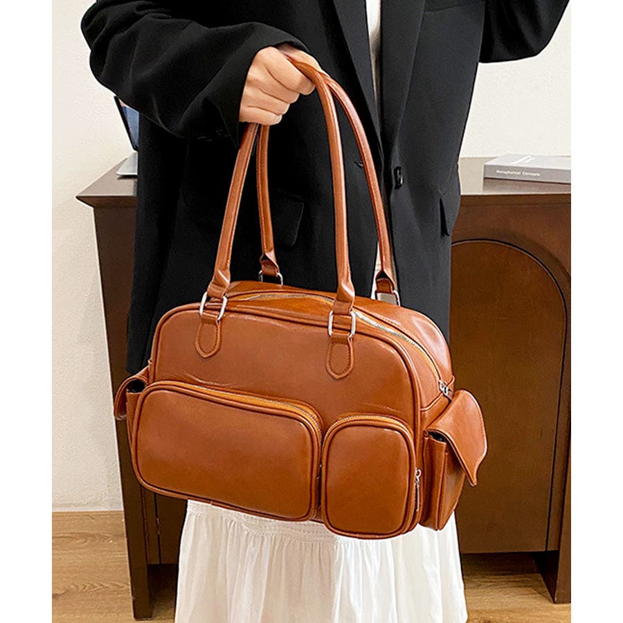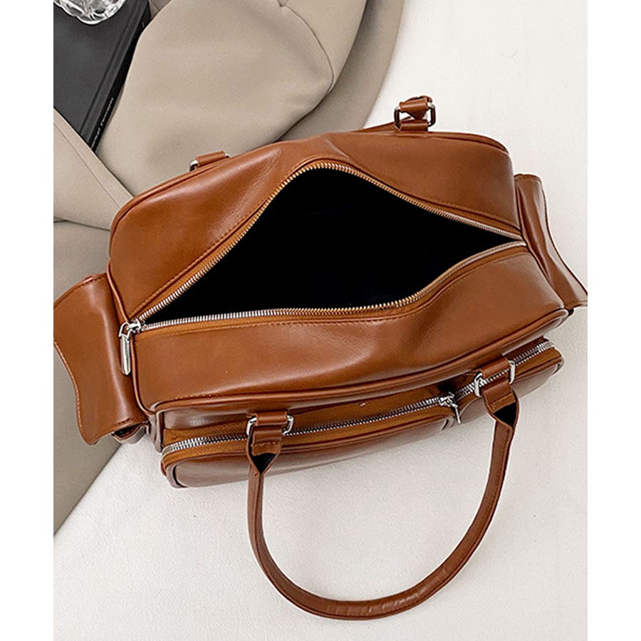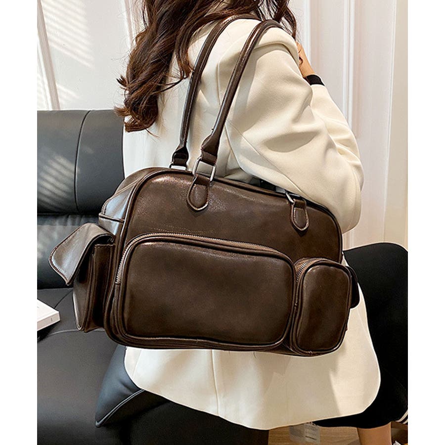 PUレザーライクポケットデザインボストンバッグ/ハンドバッグ/旅行バッグ。