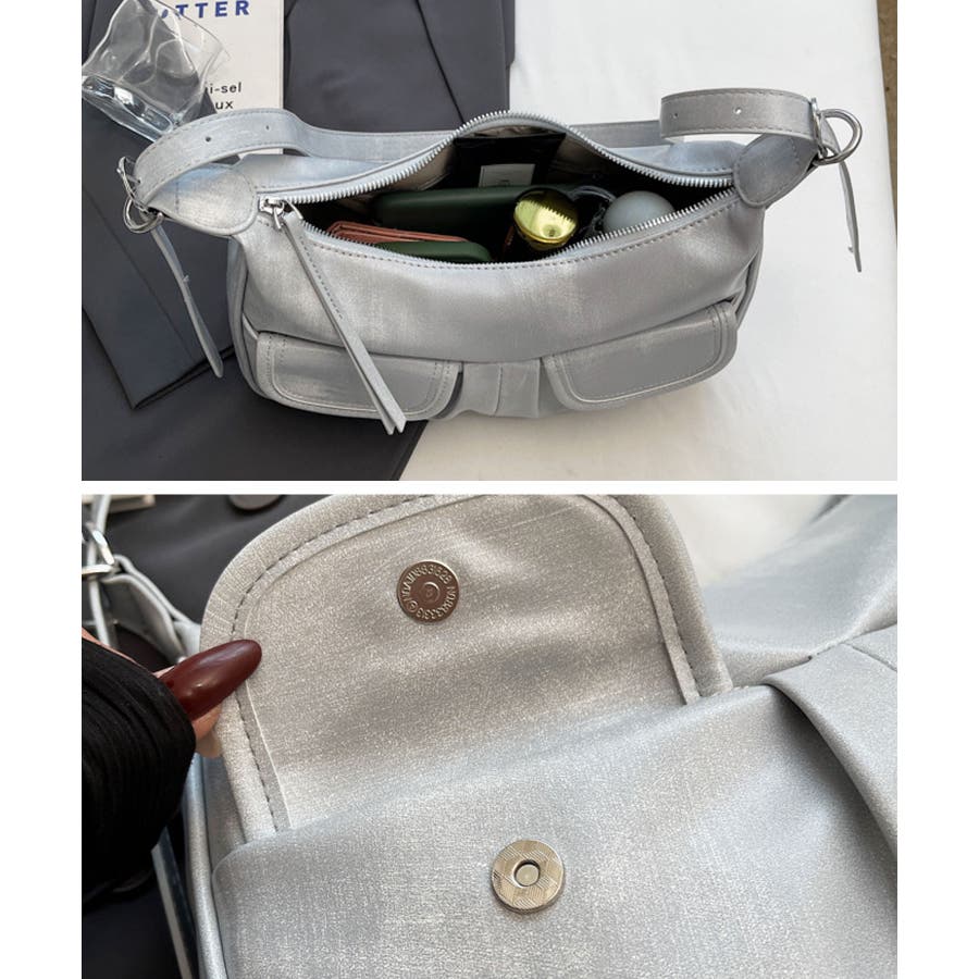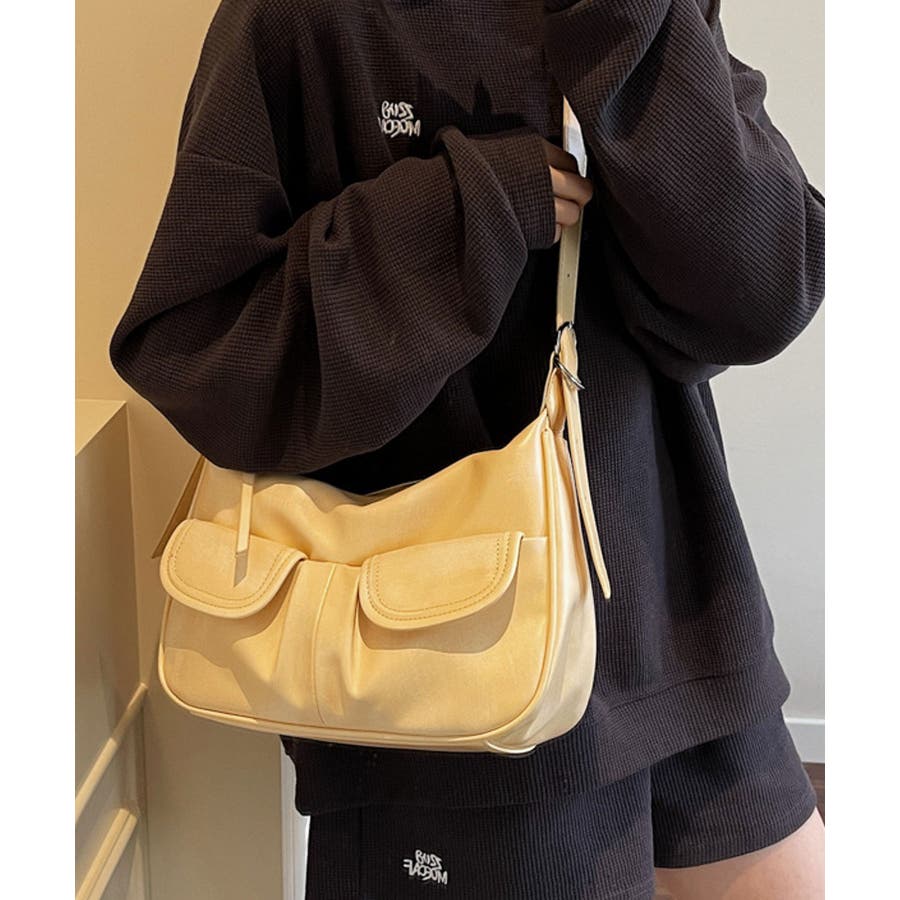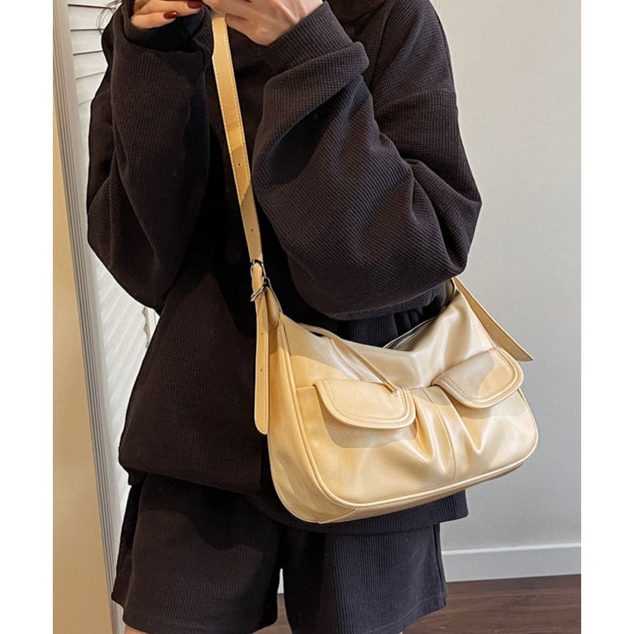 プレーンなラウンド型バッグにフラップポケットを2つ取り付けたおしゃれなデザインのショルダーバッグ。