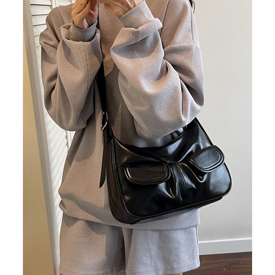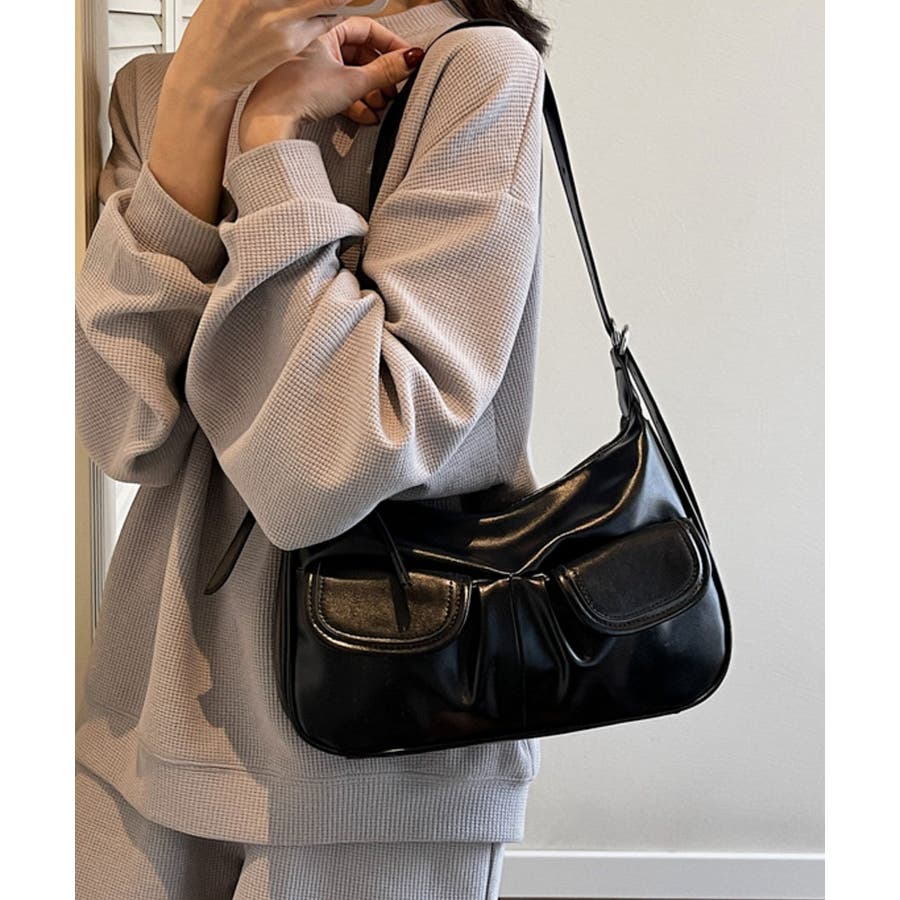 PUレザーライクタックポケットショルダーバッグ/ラウンドバッグ/ハンドバッグ。