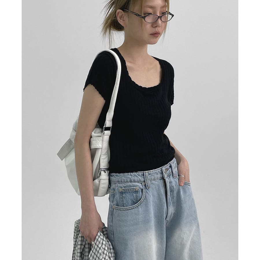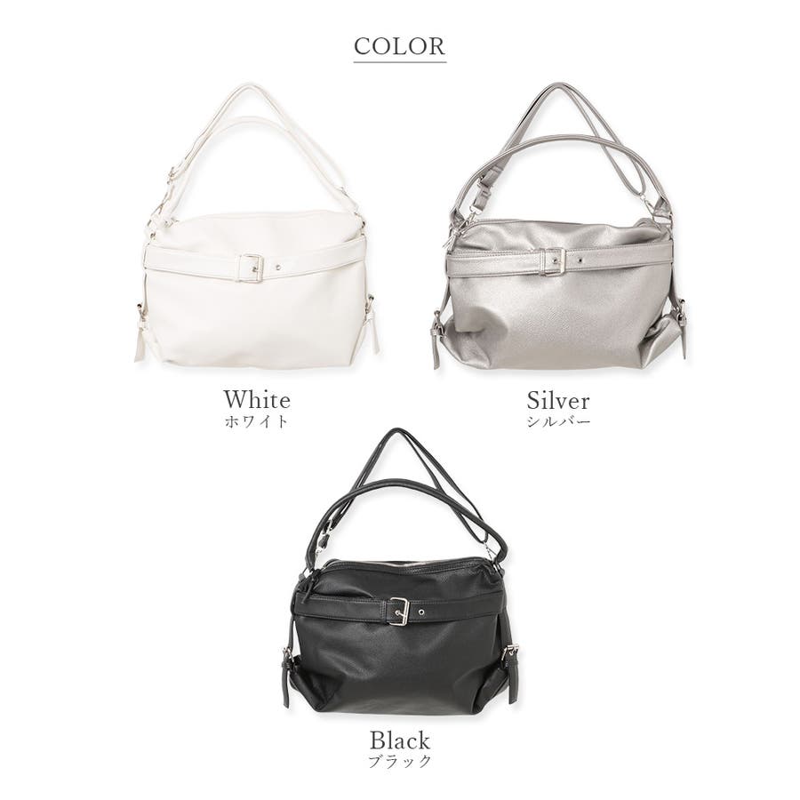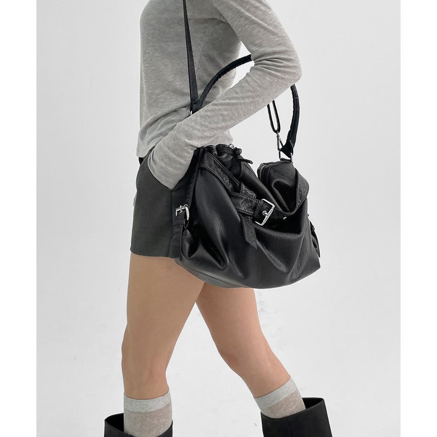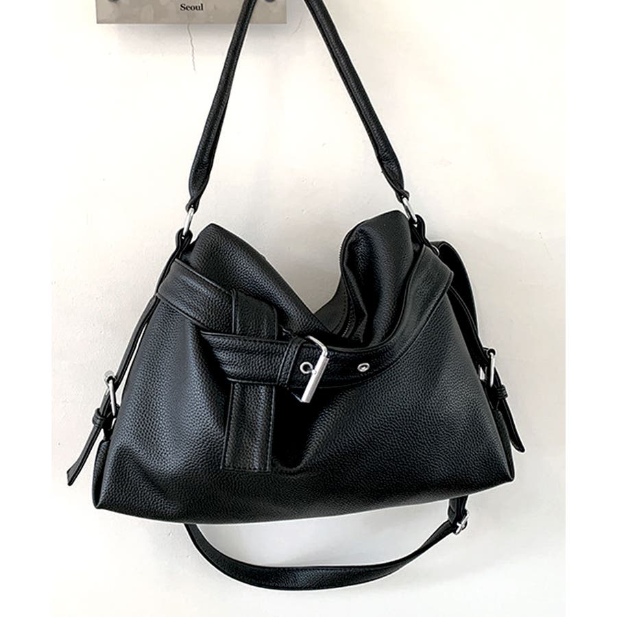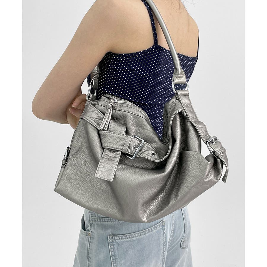 シボ感が印象的なシュリンクPUレザーを使用し、ワイドベルトをフロントにあしらった大人かわいいデザインのトートバッグ。