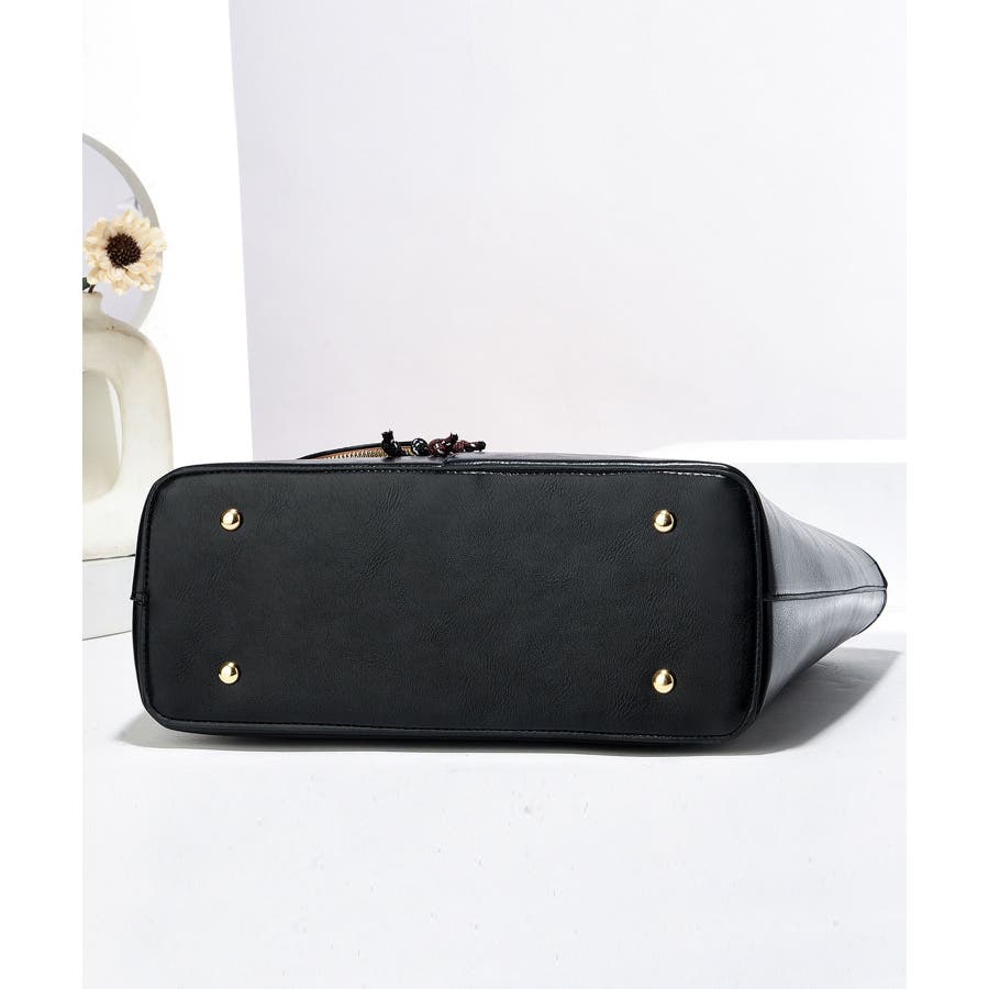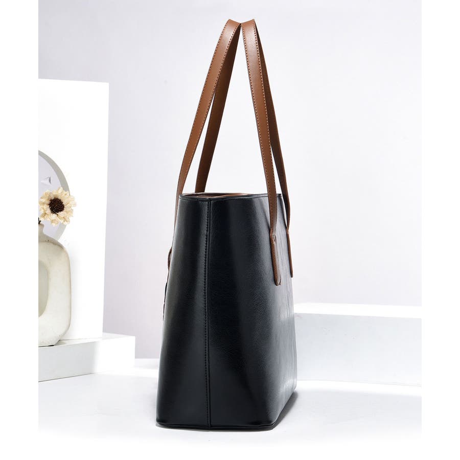 かっちり硬めのPUレザーを使用し、舟形フォルムに仕立てた大人かわいい王道デザインのトートバッグ。