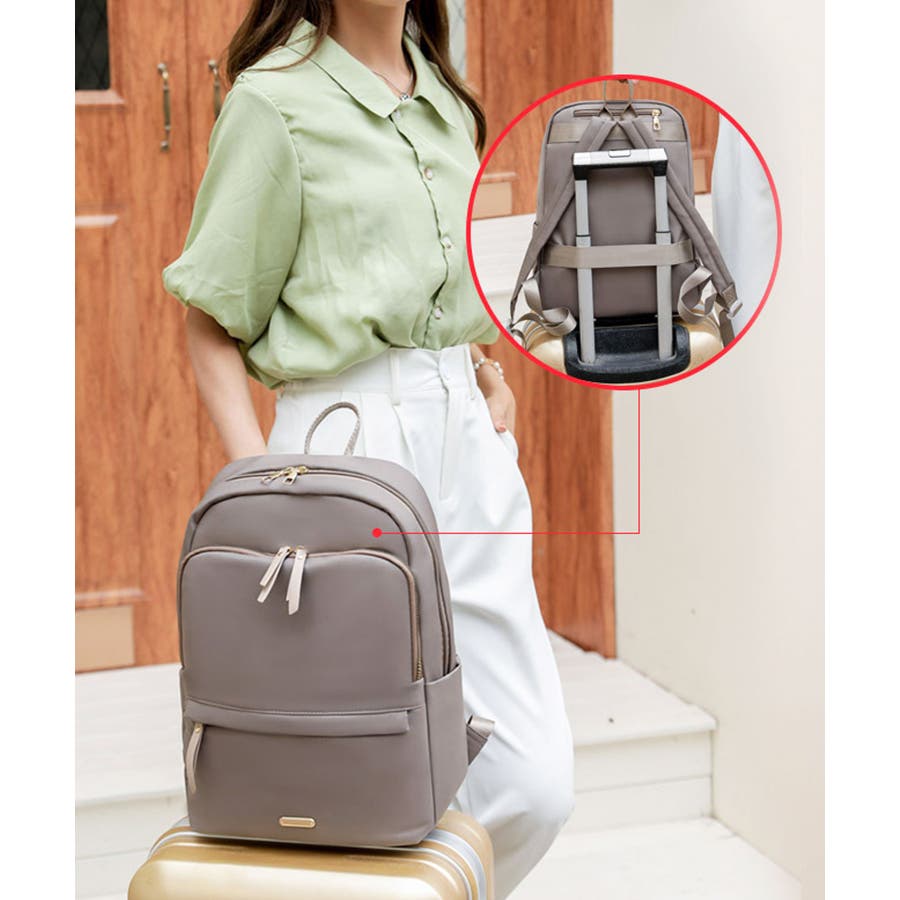 背面側にキャリーオンベルトが付いているので、キャリーケースの上に乗せても、リュックがずり落ちずに快適な移動をサポート。