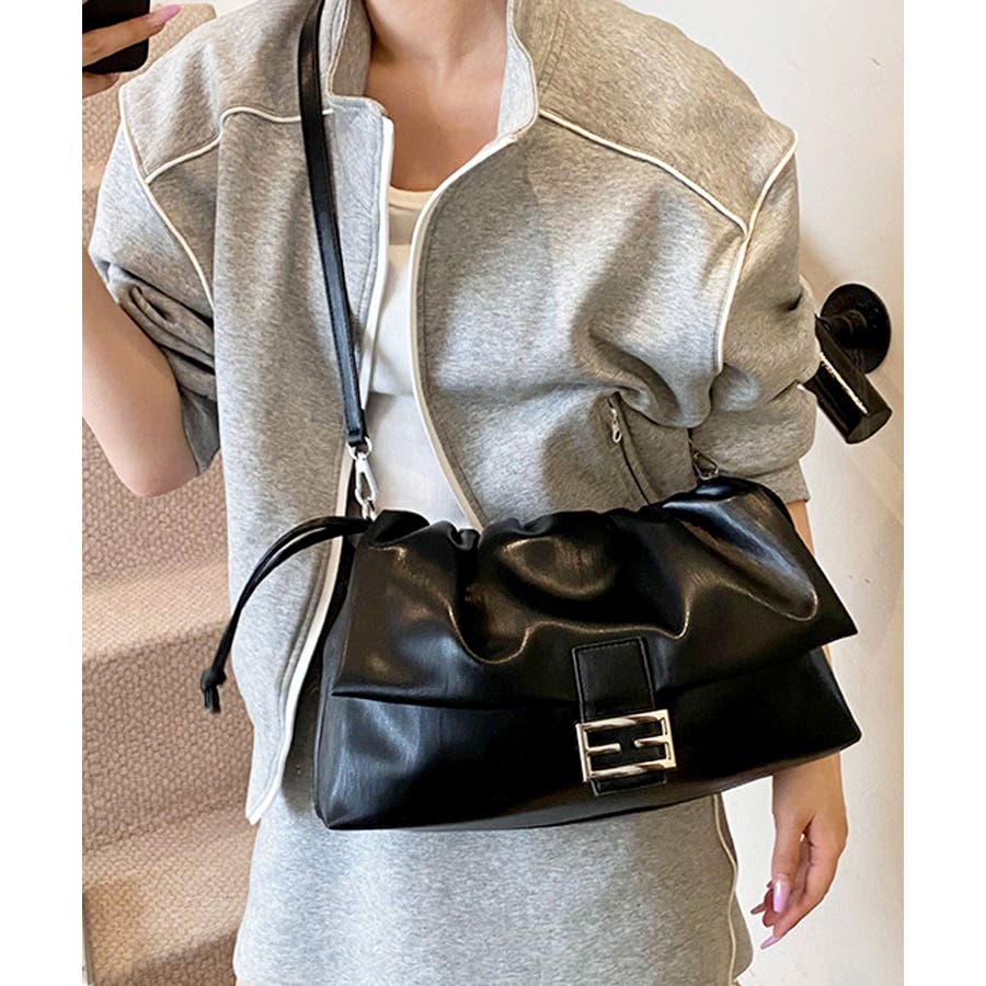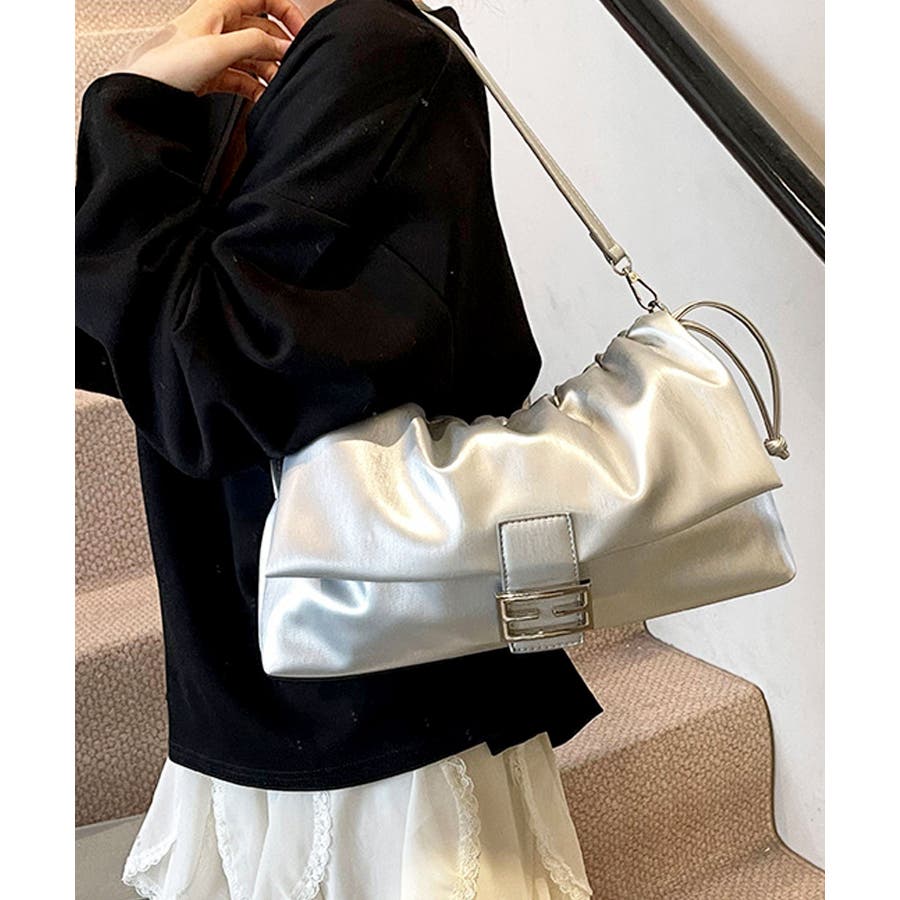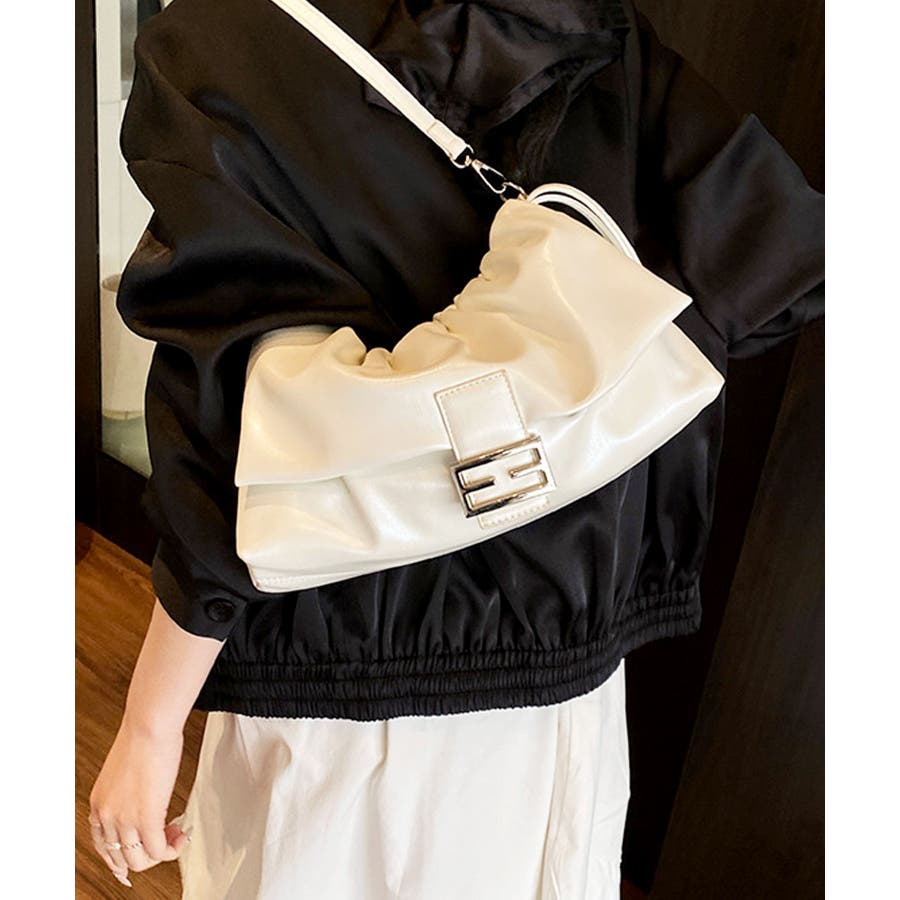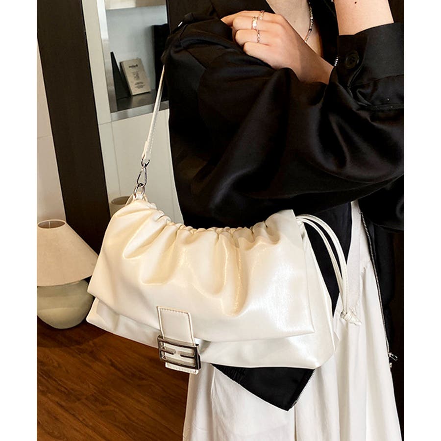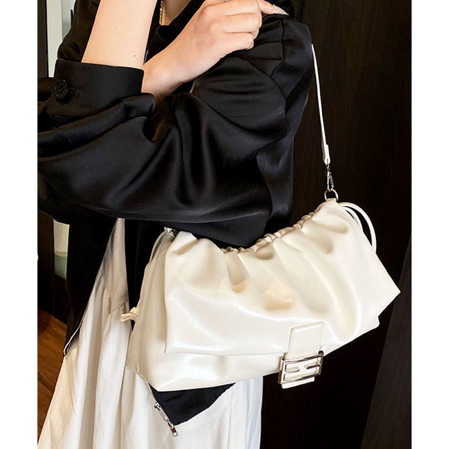 立体的なギャザーフラップにシャープなシルバーバックルが映える、大人かわいいショルダーバッグ。
