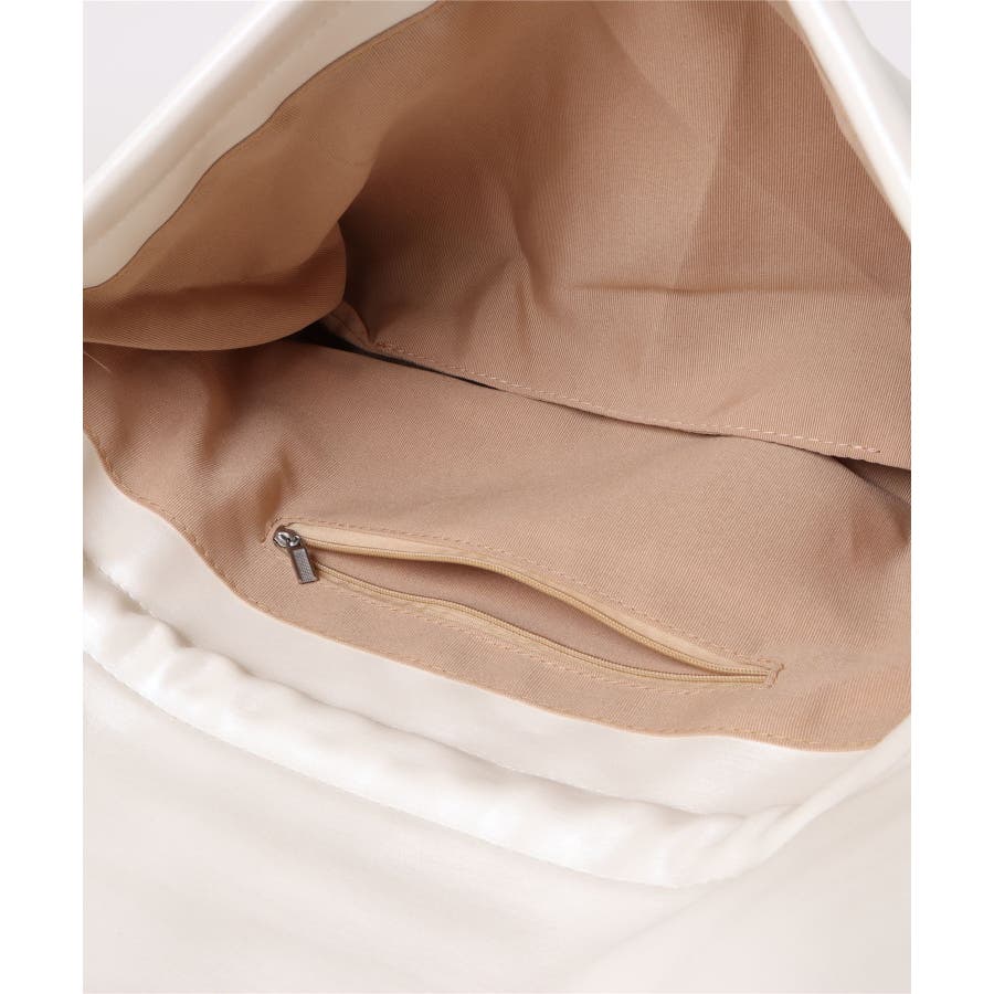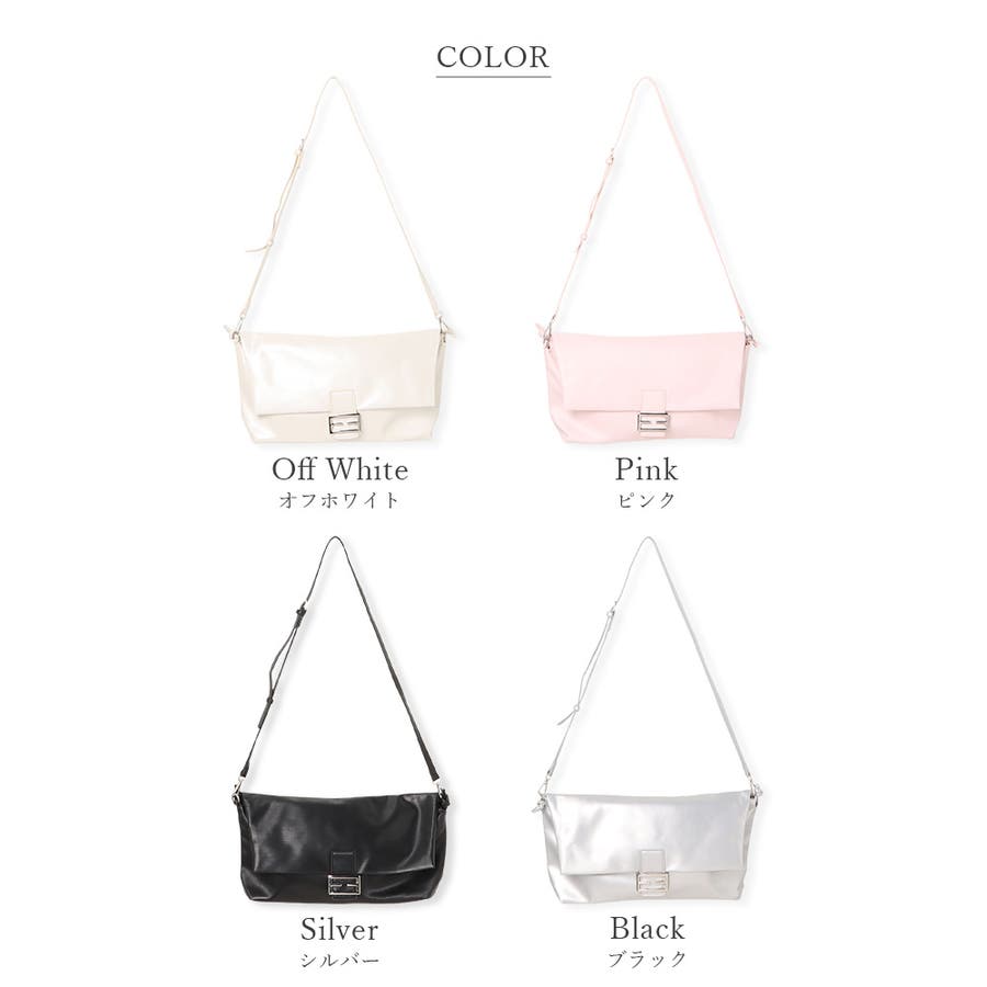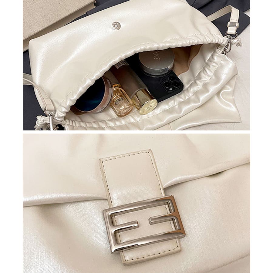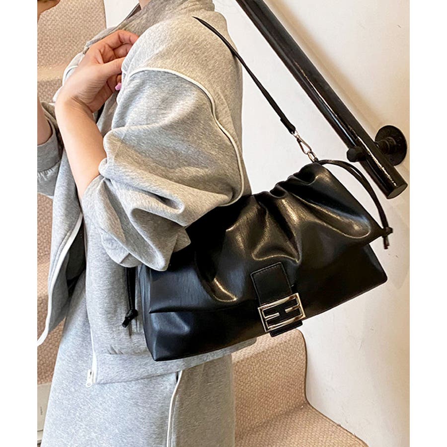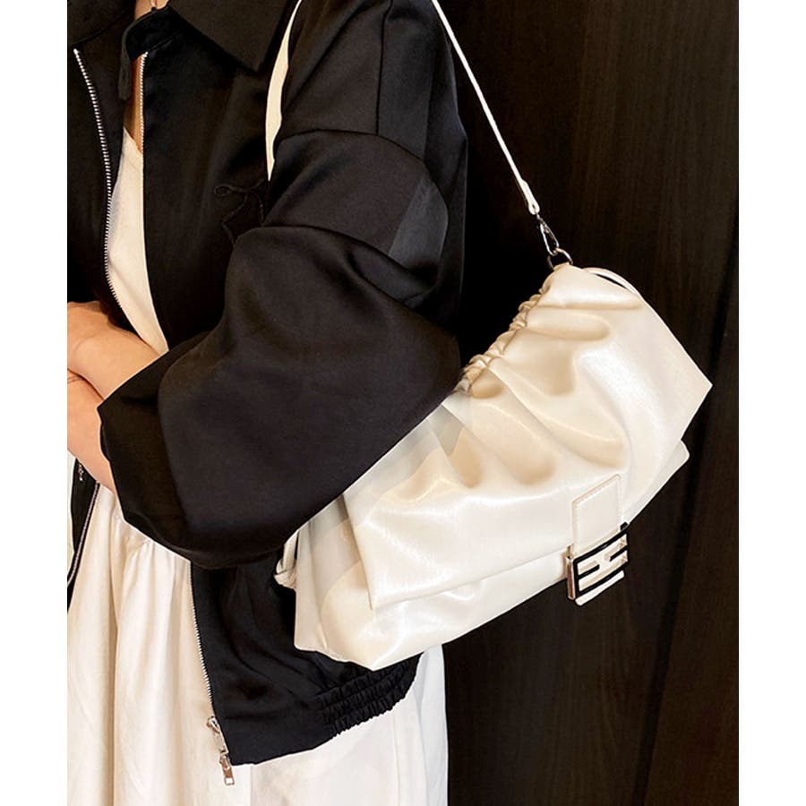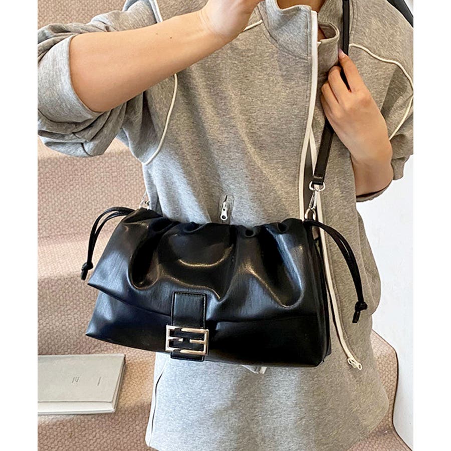 立体的なギャザーフラップにシャープなシルバーバックルが映える、大人かわいいショルダーバッグ。
